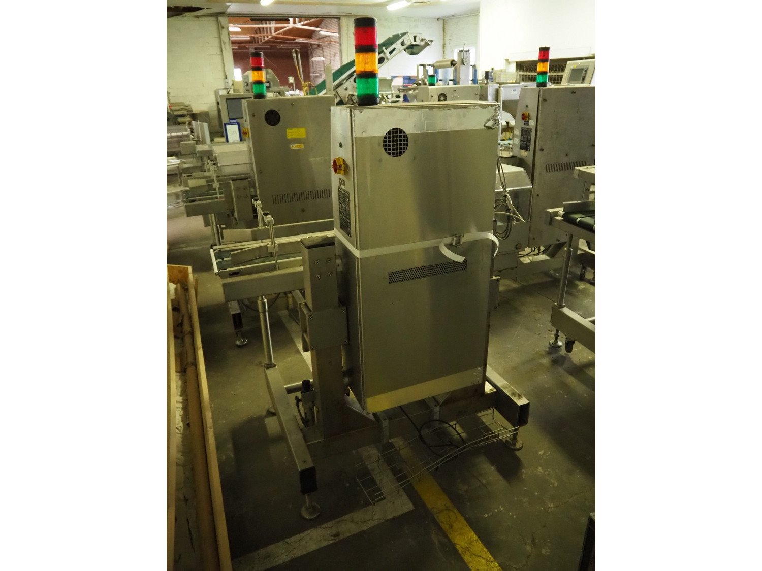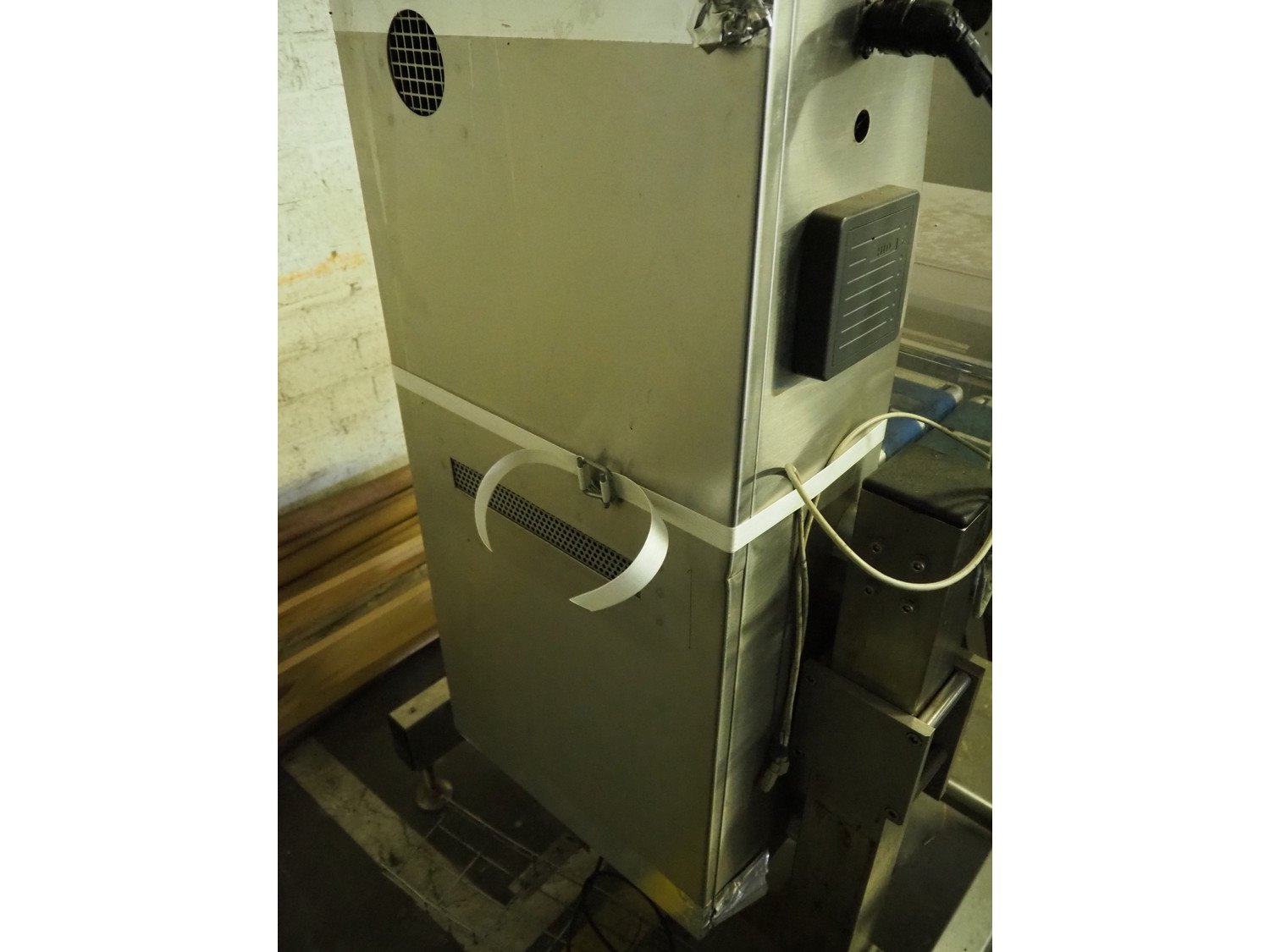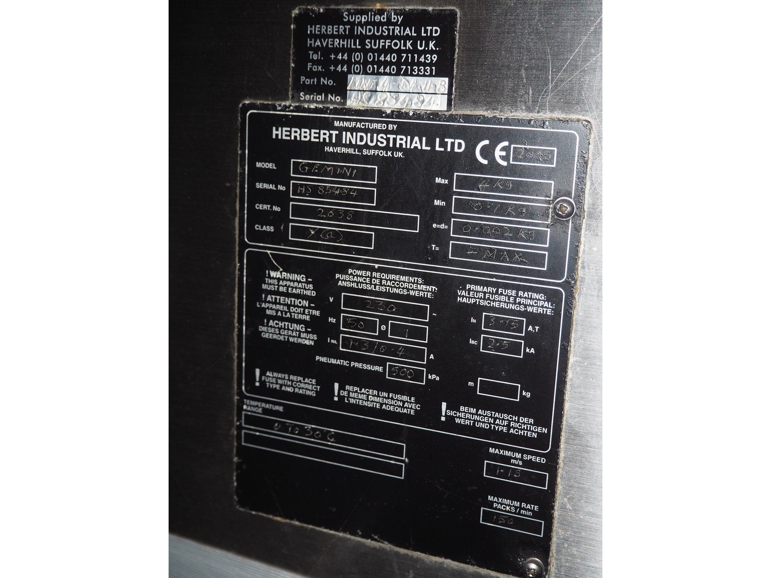 Herbert checkweigher, model: GEMINI, serial number: HS 85484, year of construction: 2005, 230 V, 1 Ph, 50 Hz, 1.3/0.4 A, maximum weight: 4 kg, minimum weight: 0.1 kg, e=d= 02 kg, plastic belts, belt width: (2x) 100 mm, total dimensions: 1250 mm x 800 mm x 1500 mm.
