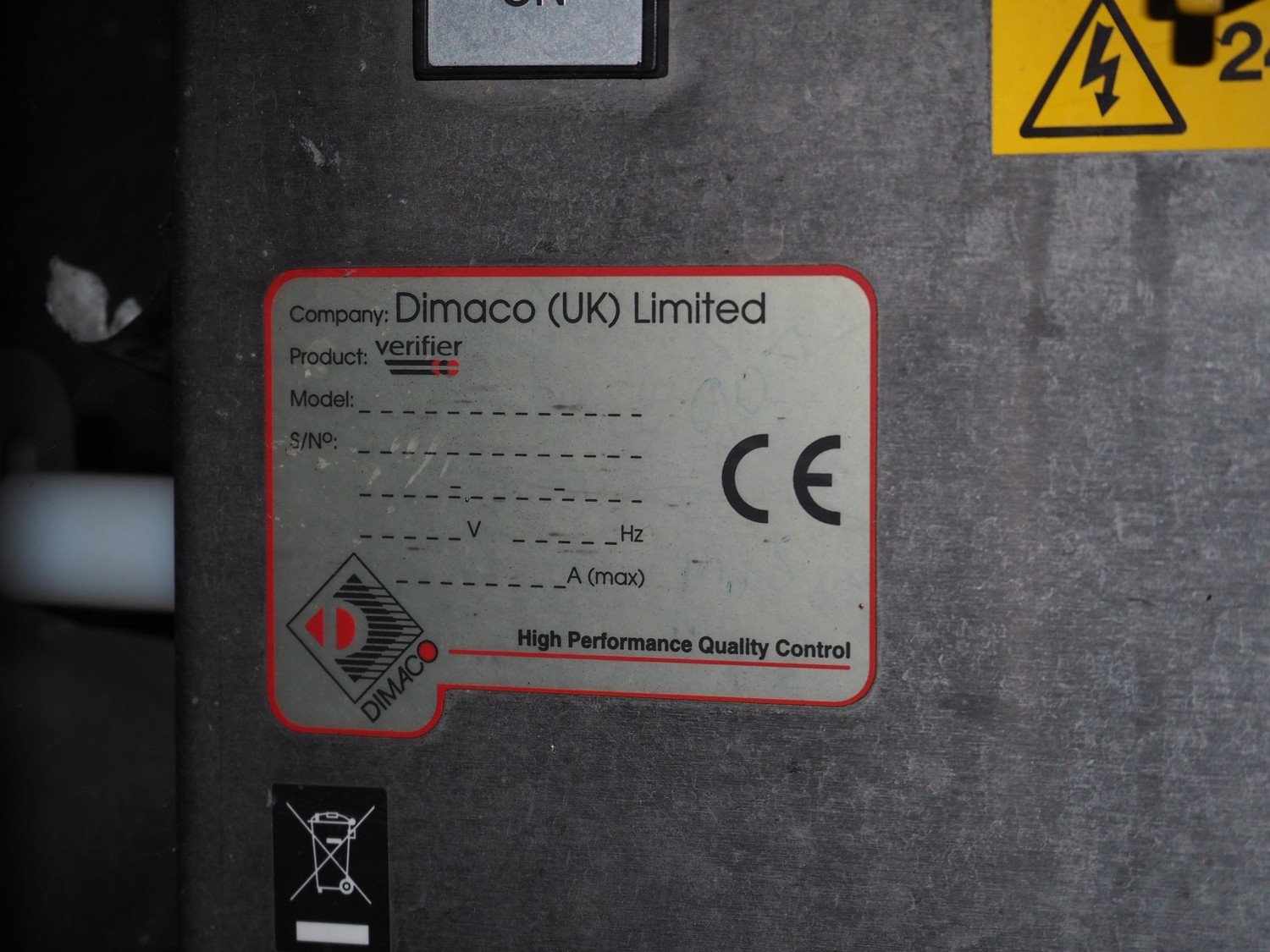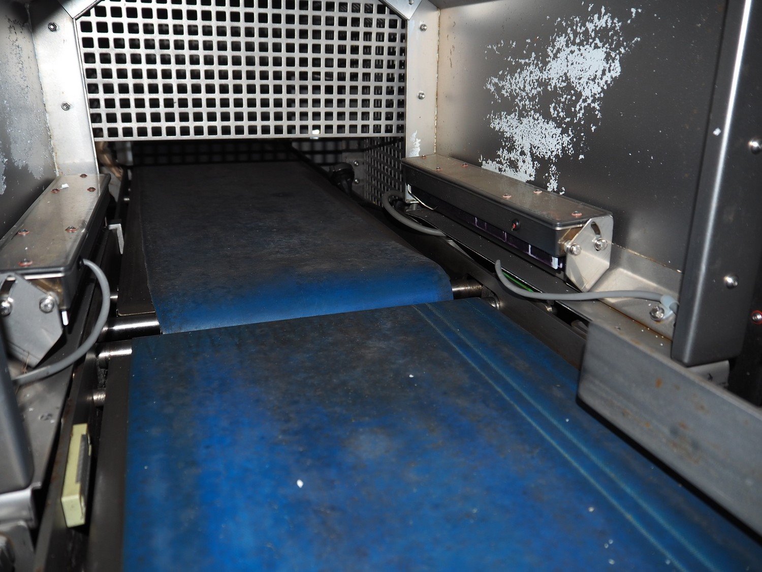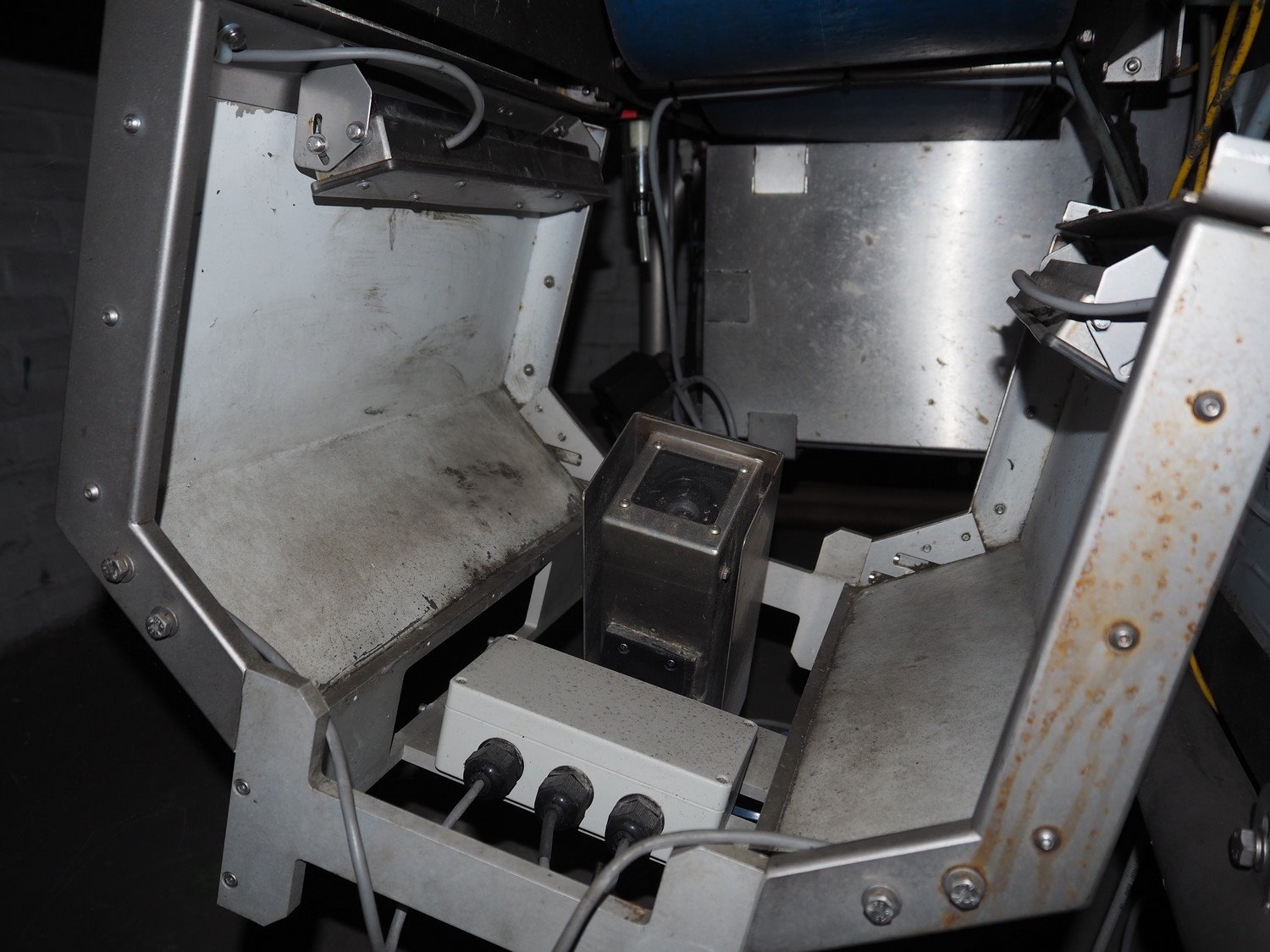 Dimaco optical sorting machine with rejector, plastic belt, belt width: 300 mm, clearance: 340 mm x 280 mm, total dimensions: 1650 mm x 750 mm x 1660 mm. Display broken.