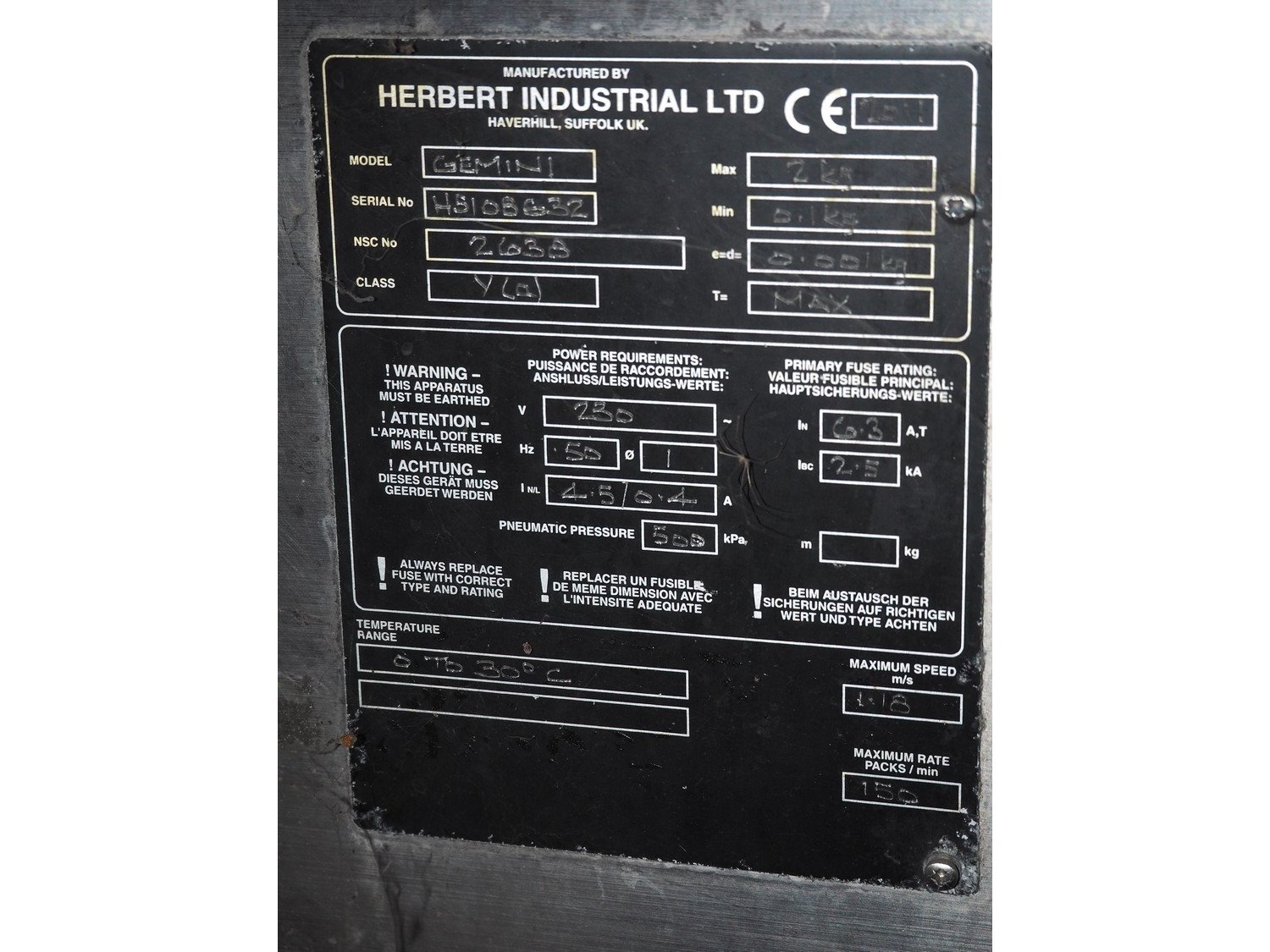 Herbert Industrial LTD. checkweigher, model: Gemini, serial number: HS108632, year of construction: 2011, 230 V, 1 Ph, 50 Hz, 4.5/0.4 A, capacity: 150 packages/minute, plastic belt, belt width: (2x) 100 mm, total dimensions: 1330 mm x 820 mm x 1730 mm.