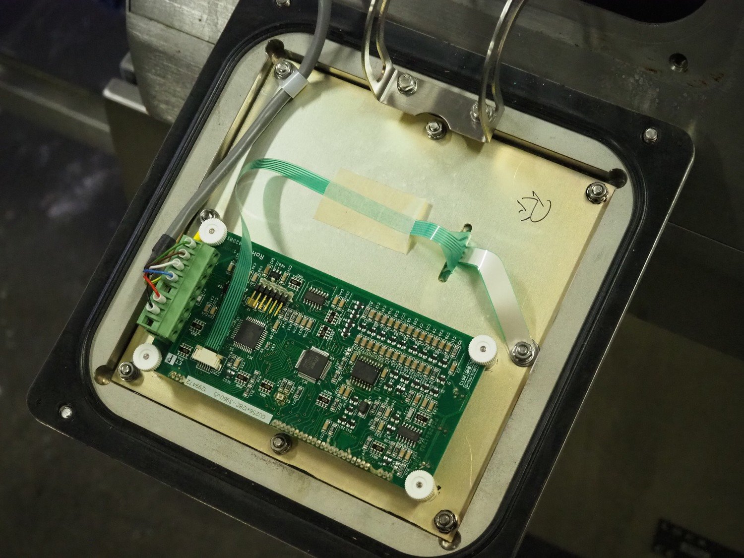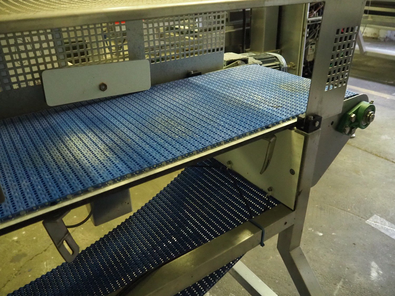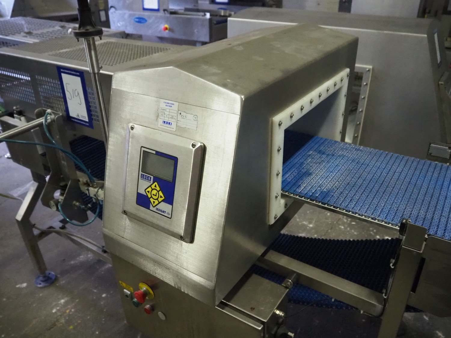 Lock Inspection Systems metal detector, serial number: 55685-1, year of construction: 11-13, 200-230 V, 50/60 Hz, 3 A, 206 kg, plastic mesh belt, belt width: 350 mm, clearance: 400 mm x 170 mm, total dimensions: 2300 mm x 900 mm x 1420 mm. Missing rejecter bin.