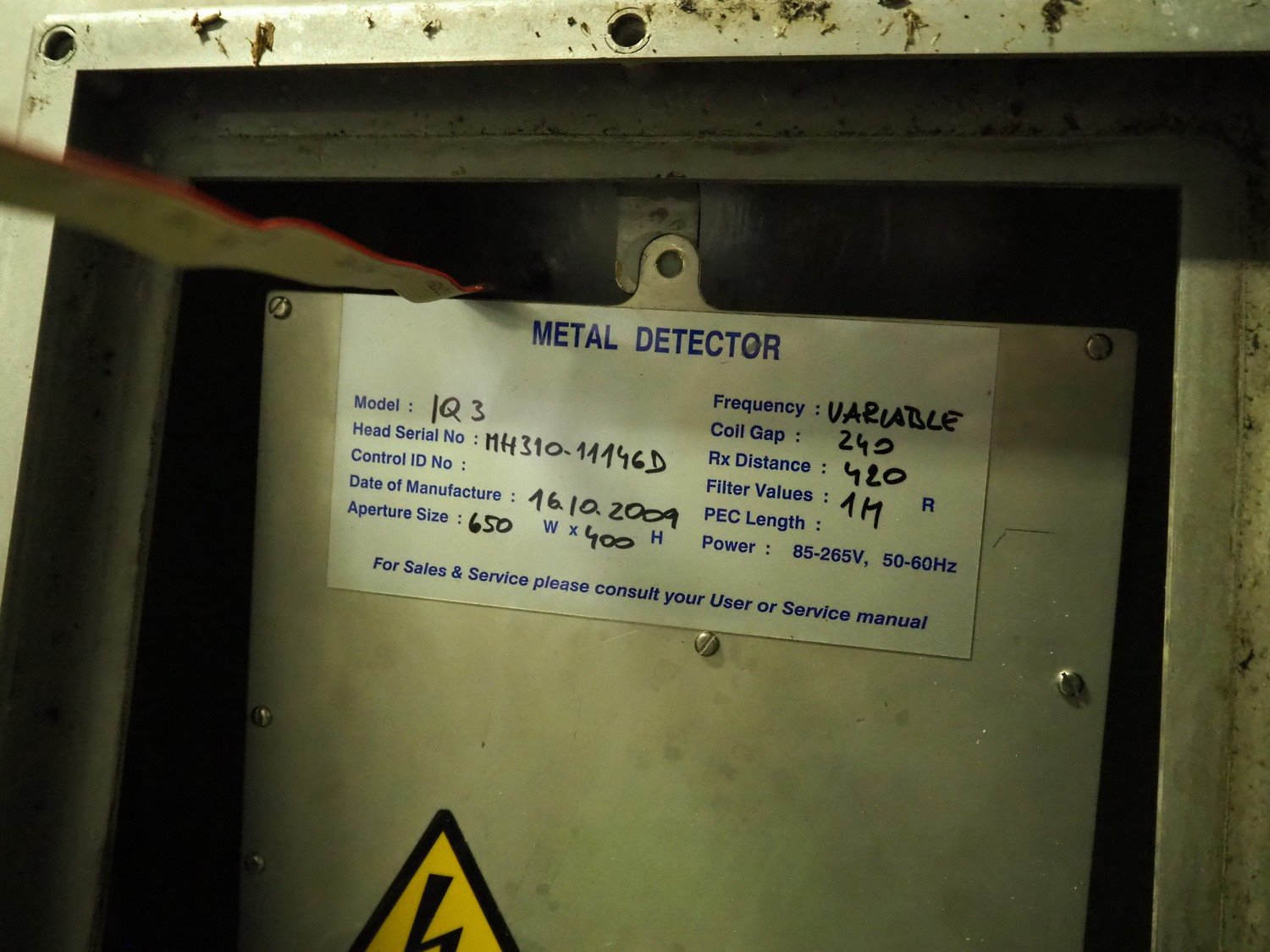 Loma Systems metal detector head, model: IQ3, head serial number: MH310-11146D, date of manufacturing: 16.10.2009, 85-264 V, 50-60 Hz, clearance: 650 mm x 400 mm, total dimensions: 1330 mm x 680 mm x 950 mm.
