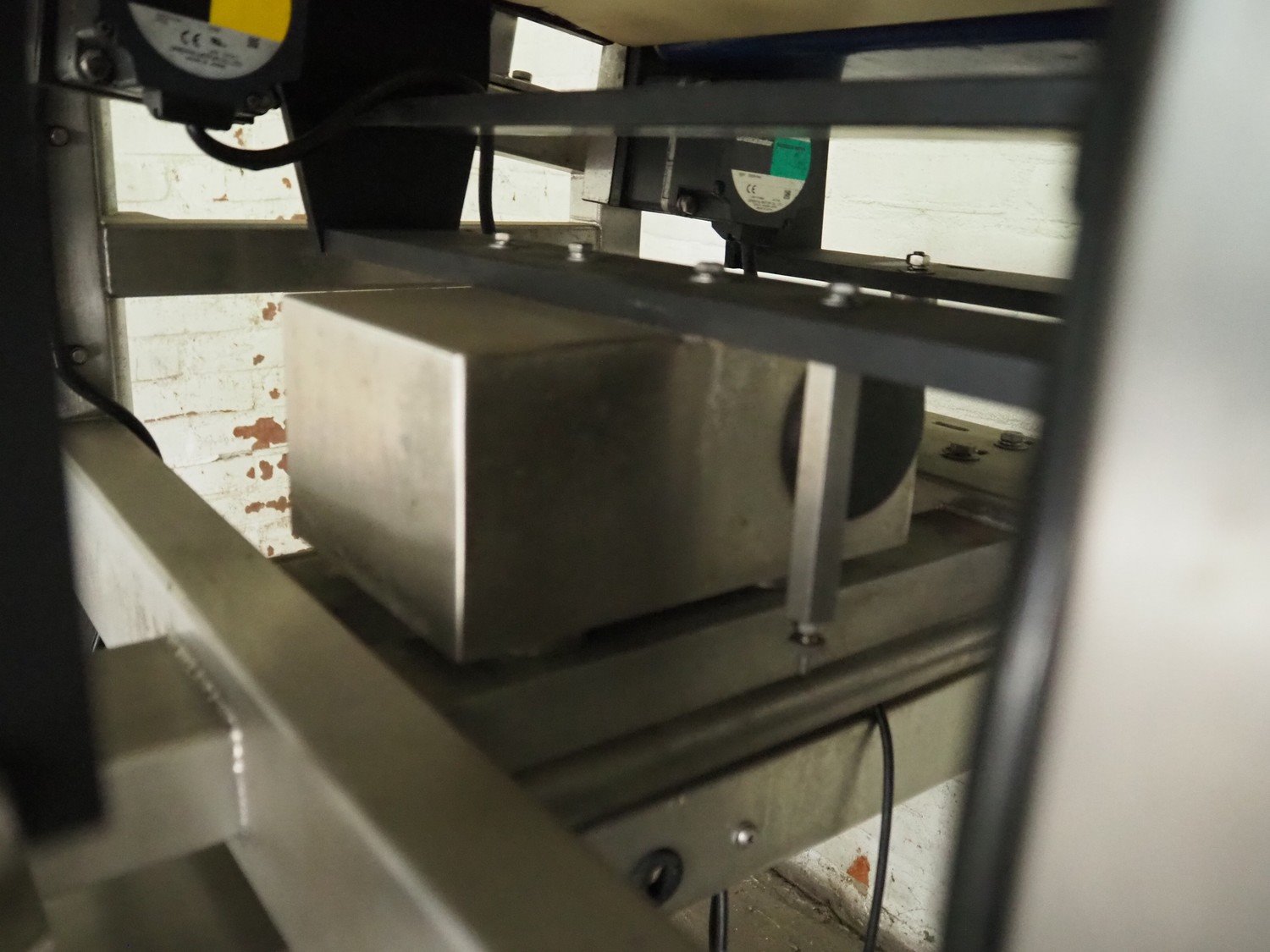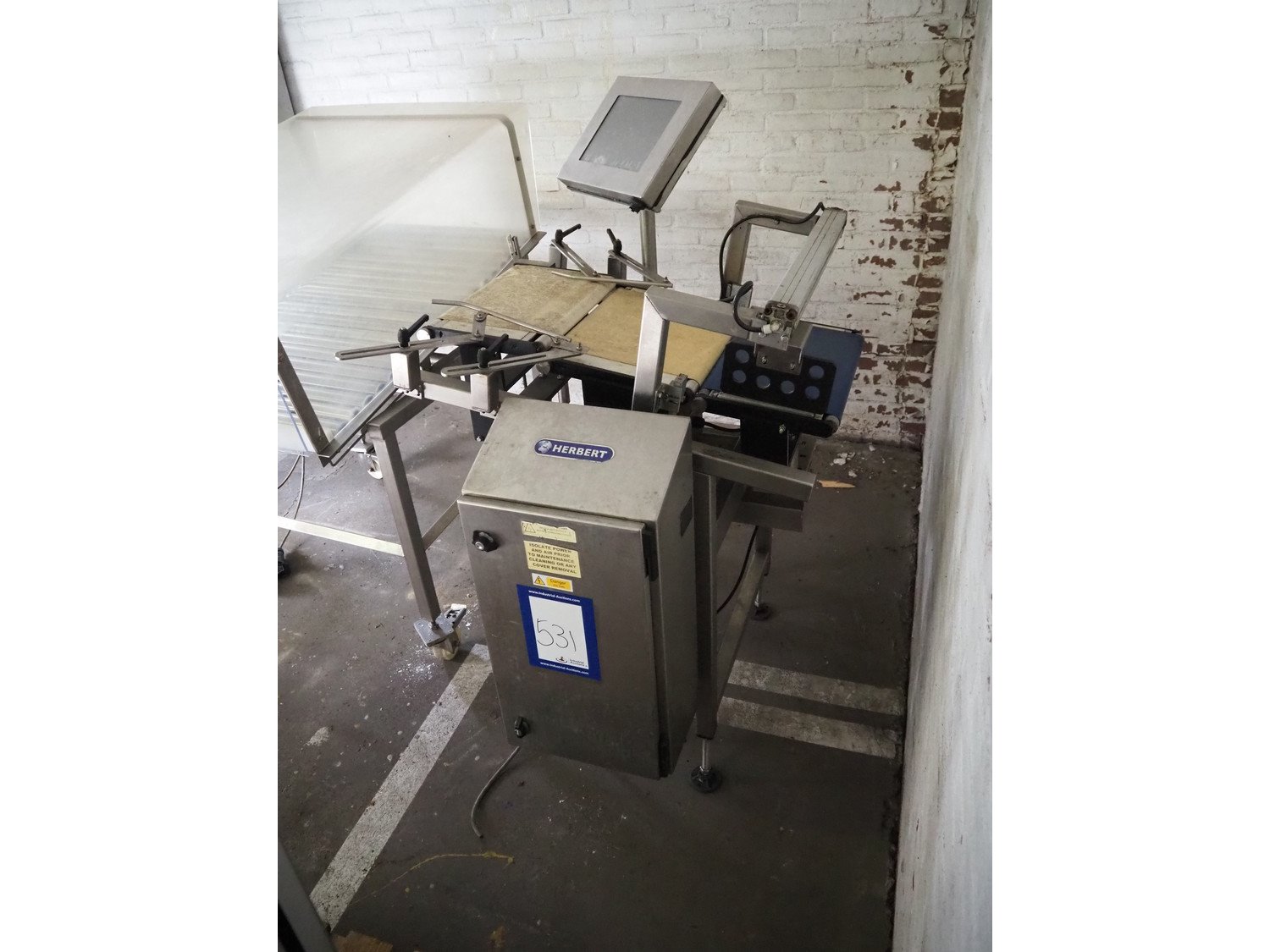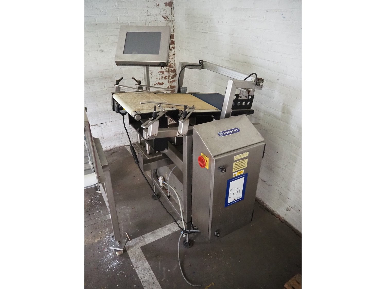 Herbert checkweigher, model: CW3310, serial number: SO 14584/1/10, year of construction: 2010, 240 V, 50 Hz, plastic belt, belt width: 375 mm, total dimensions: 930 mm x 820 mm x 1440 mm.