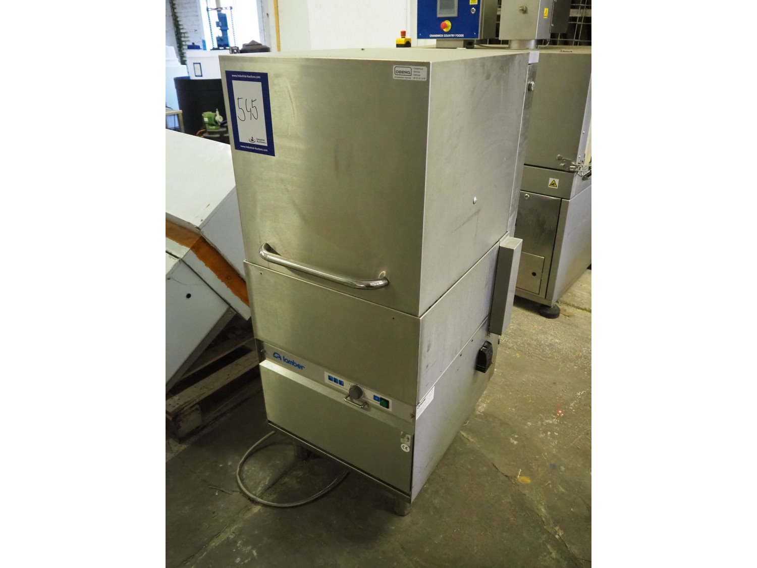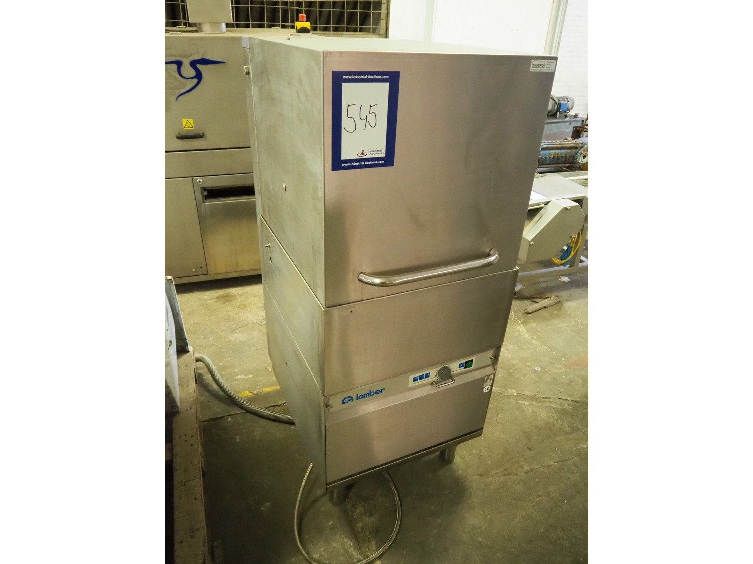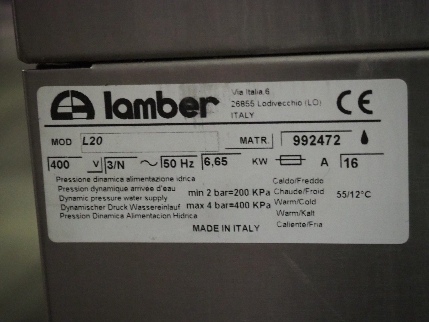 Lamber dish washer, model: L20, serial number: 992472, 400 V, 3 Ph, 50 Hz, 16 A, 6.65 kW, dimensions: 590 mm x 440 mm x 1420 mm.