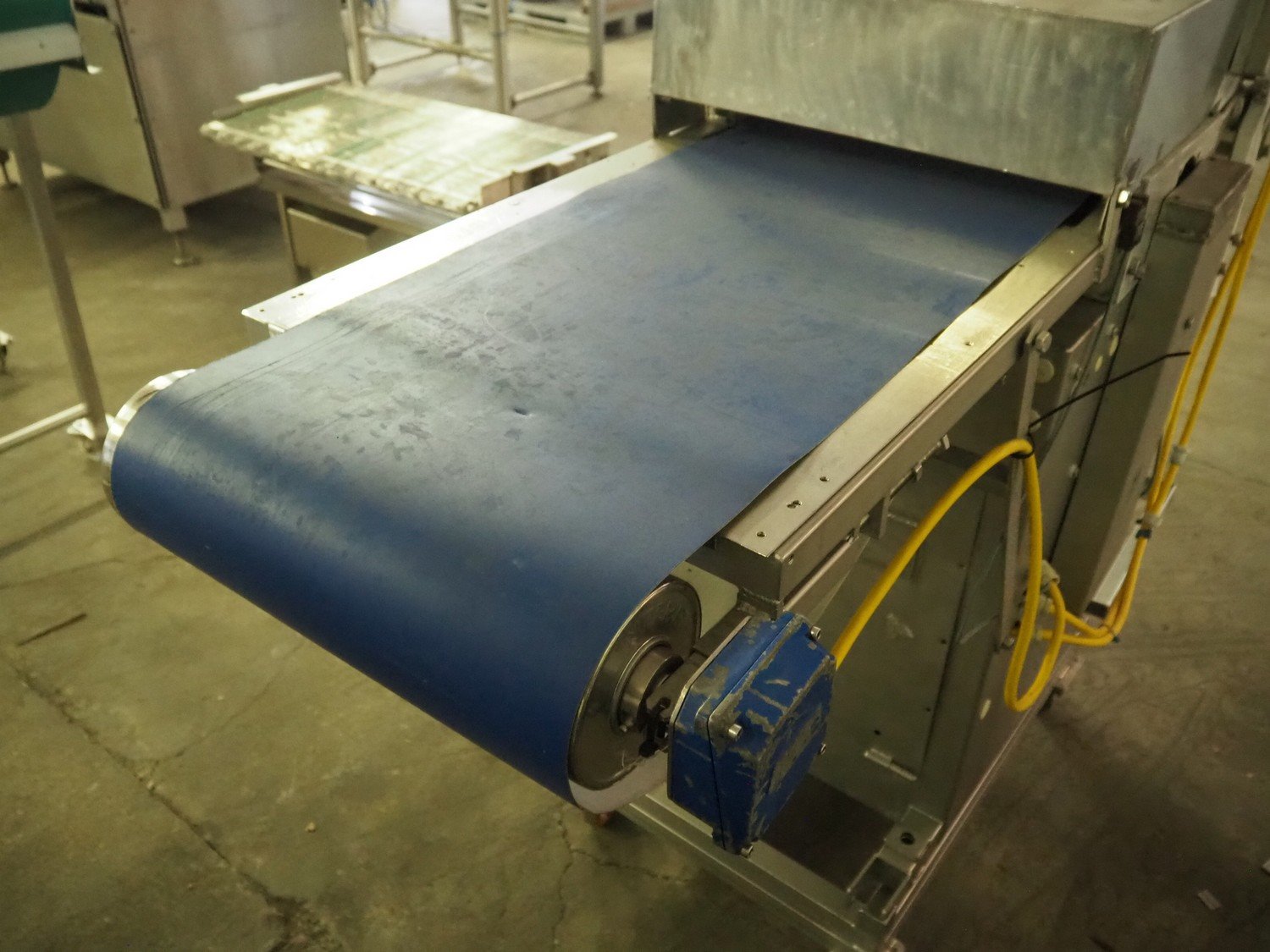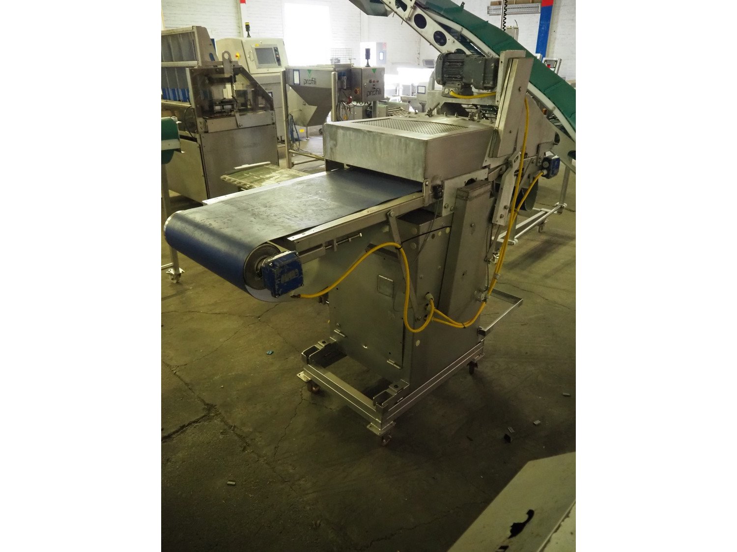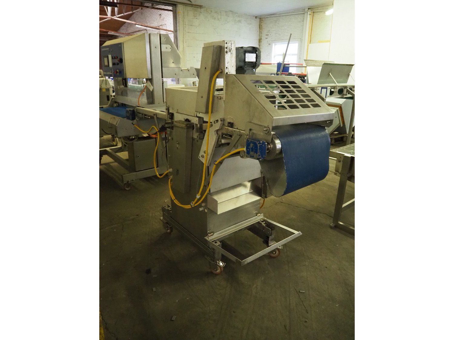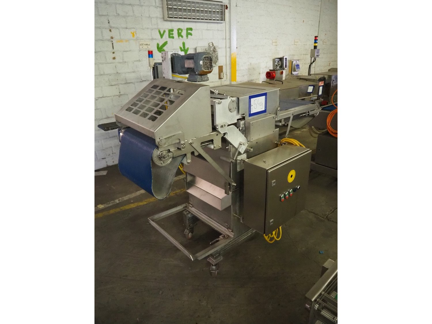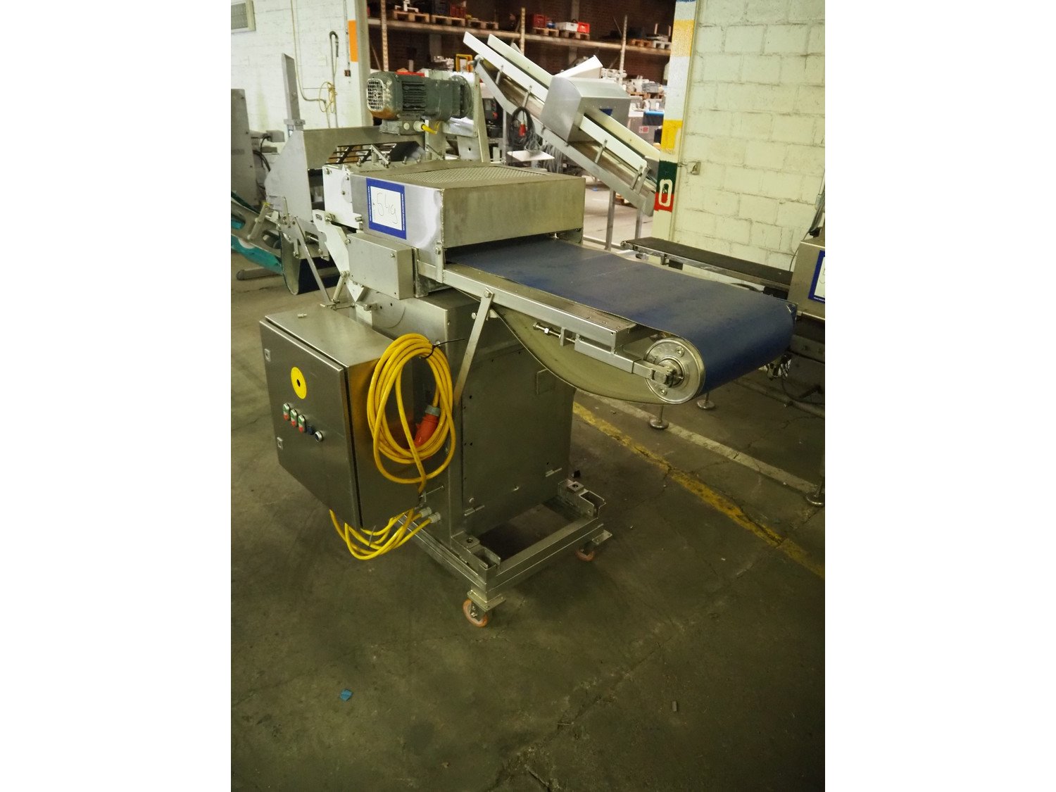 Steen mobile skinning machine, type: ST600 KIP, serial number: 247211293A, 380 V, 50 Hz, plastic belt, belt width: 430 mm, total dimensions: 1850 mm x 900 mm x 1650 mm. Incomplete.
