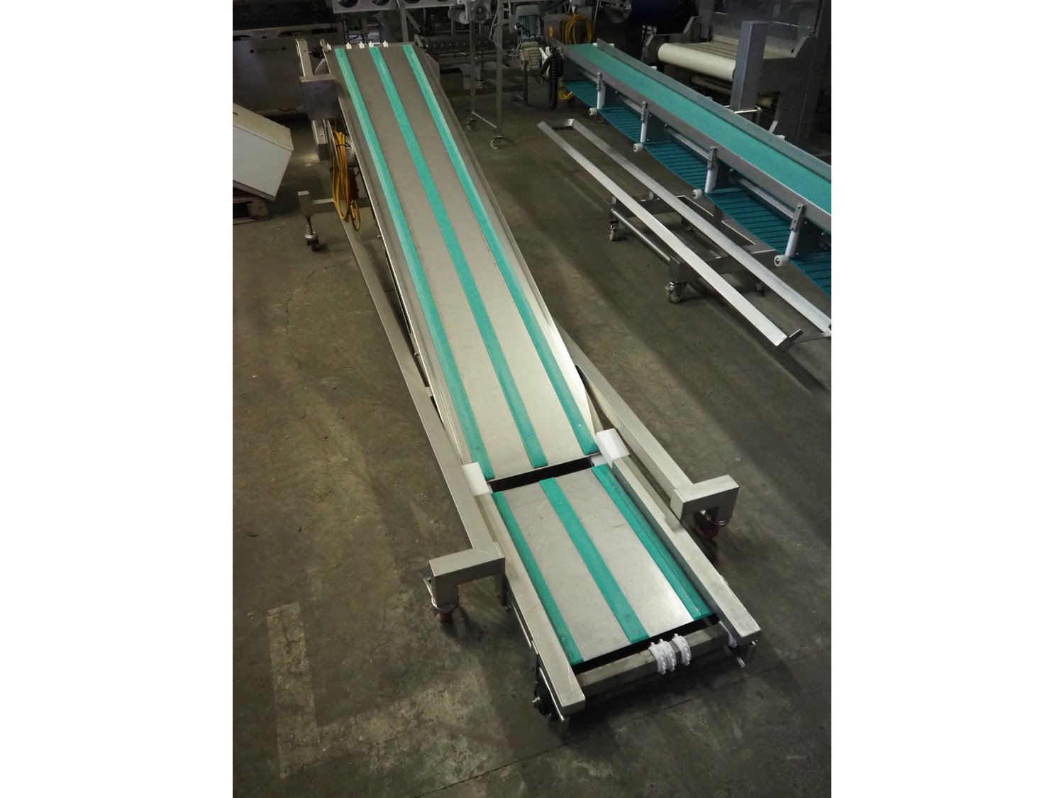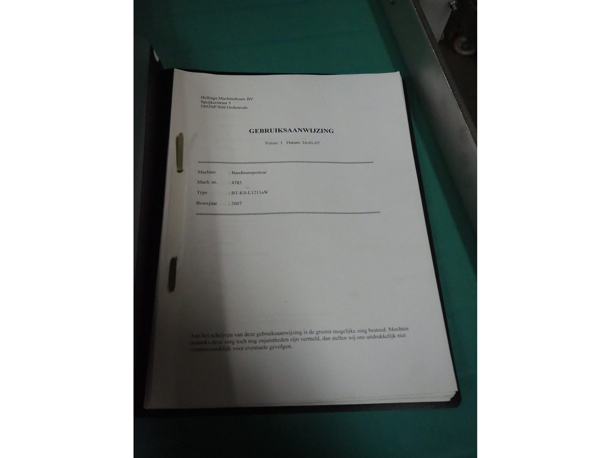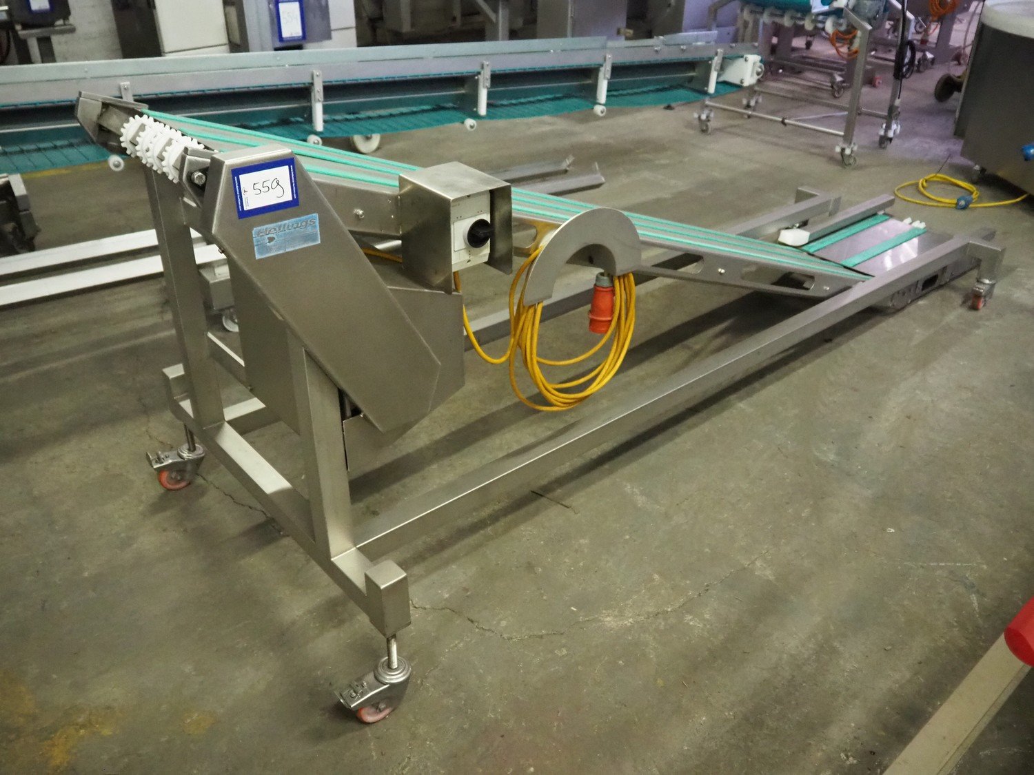 Hellings mobile elevating belt on s/s frame, type: BT-KS-L1211aW, serial number: 4785, year of construction: 2007, weight: 200 kg, maximum belt width: 500 mm, elevating height: 1020 mm, total dimensions: 3500 mm x 1100 mm x 1160 mm. Without belt.
