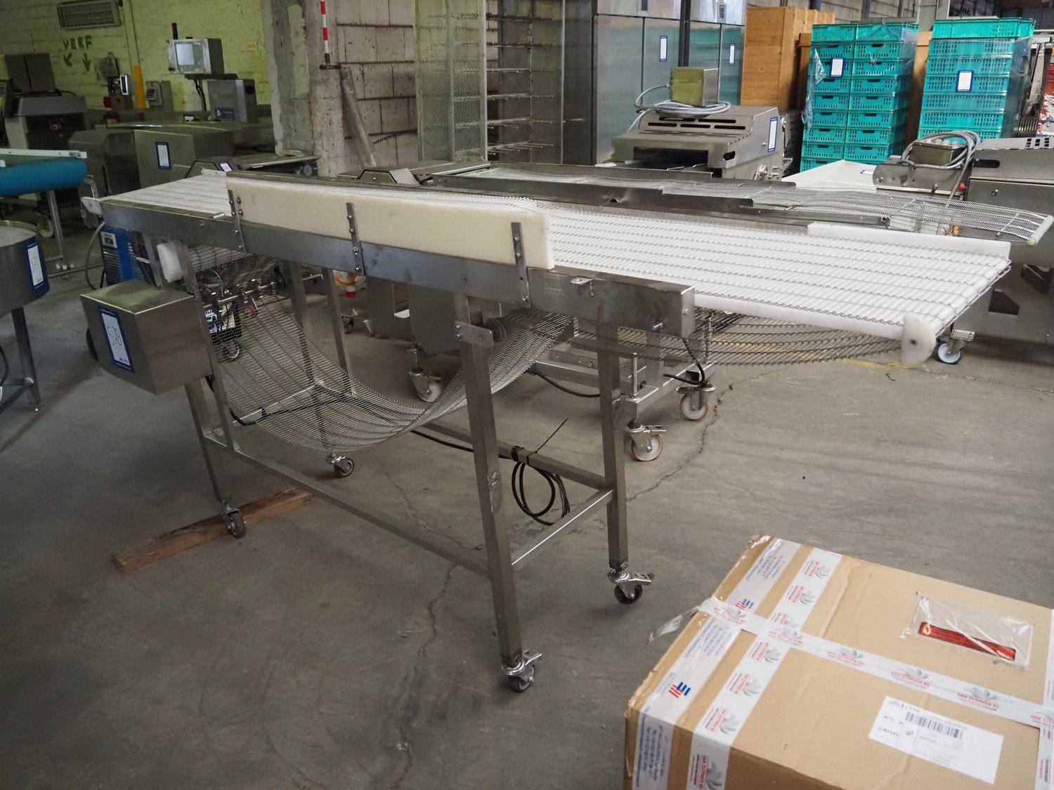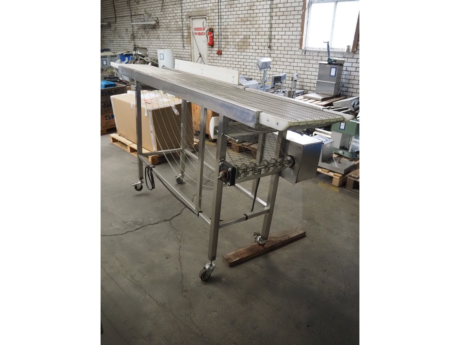 Mobile transport belt, s/s mesh belt, belt width: 400 mm, total dimensions: 680 mm x 2750 mm x 1260 mm. 1 wheel broken.