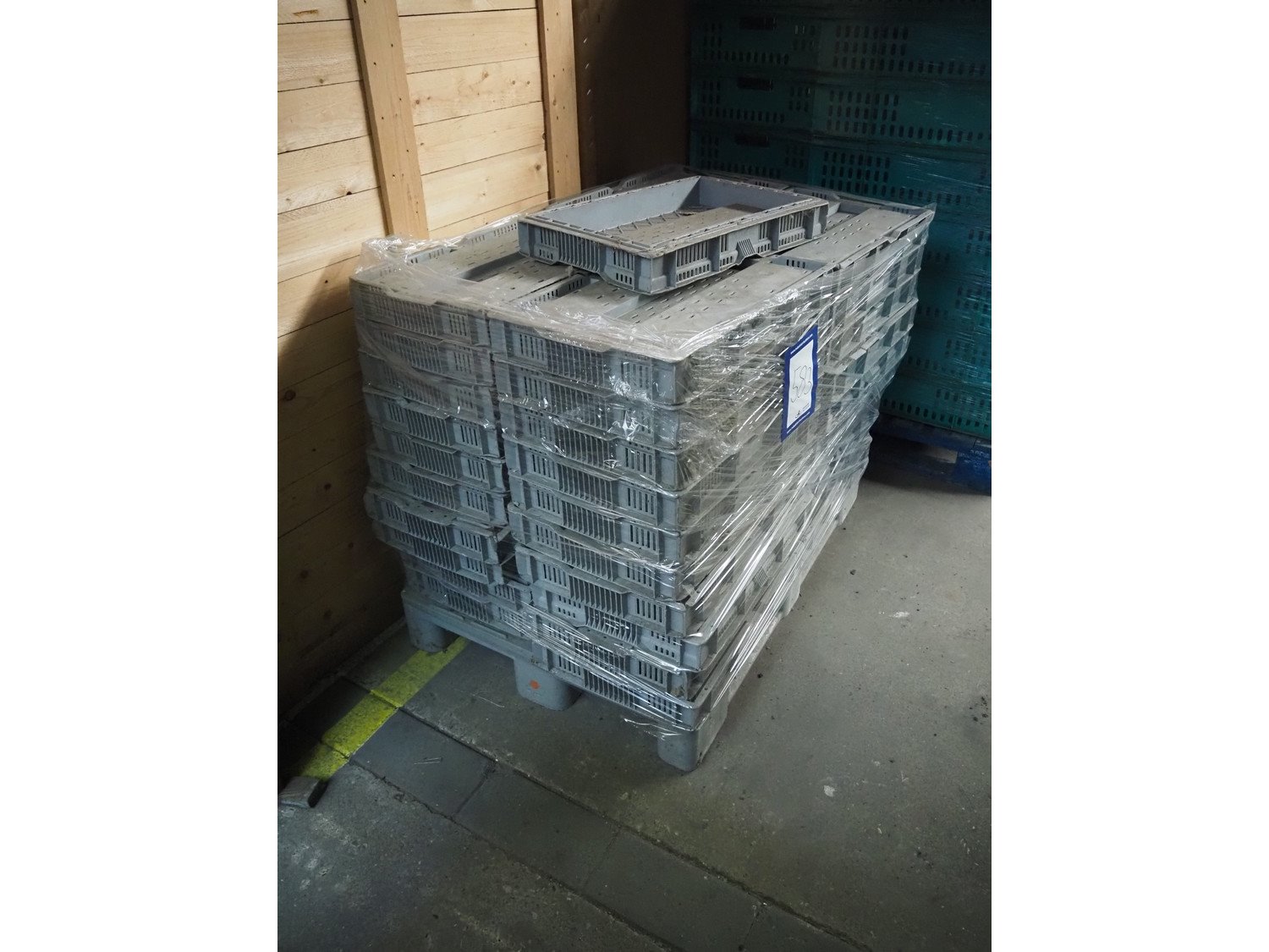 Pallet with plastic crates, dimensions each crate: 600 mm x 395 mm x 75 mm, total dimensions: 1200 mm x 800 mm x 920 mm.