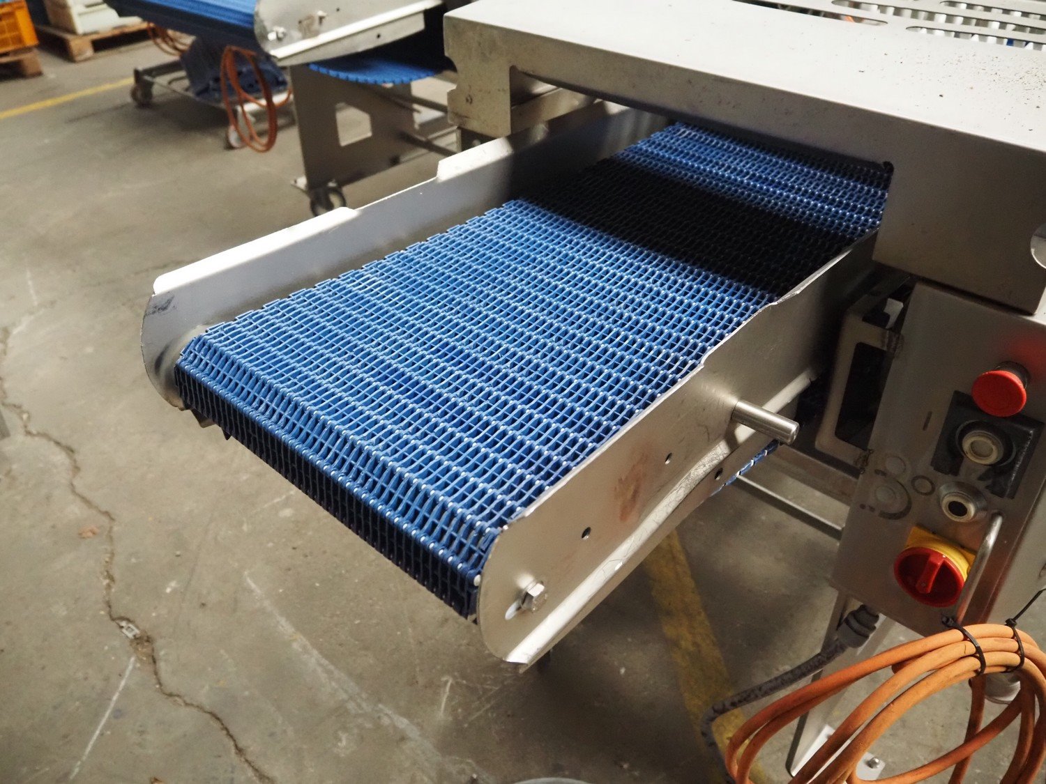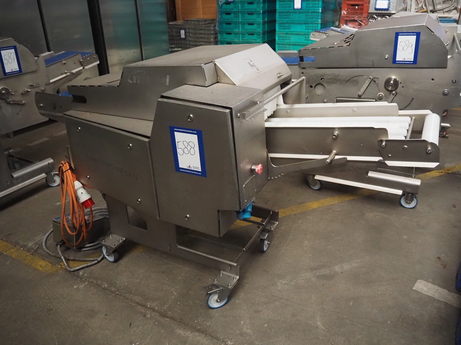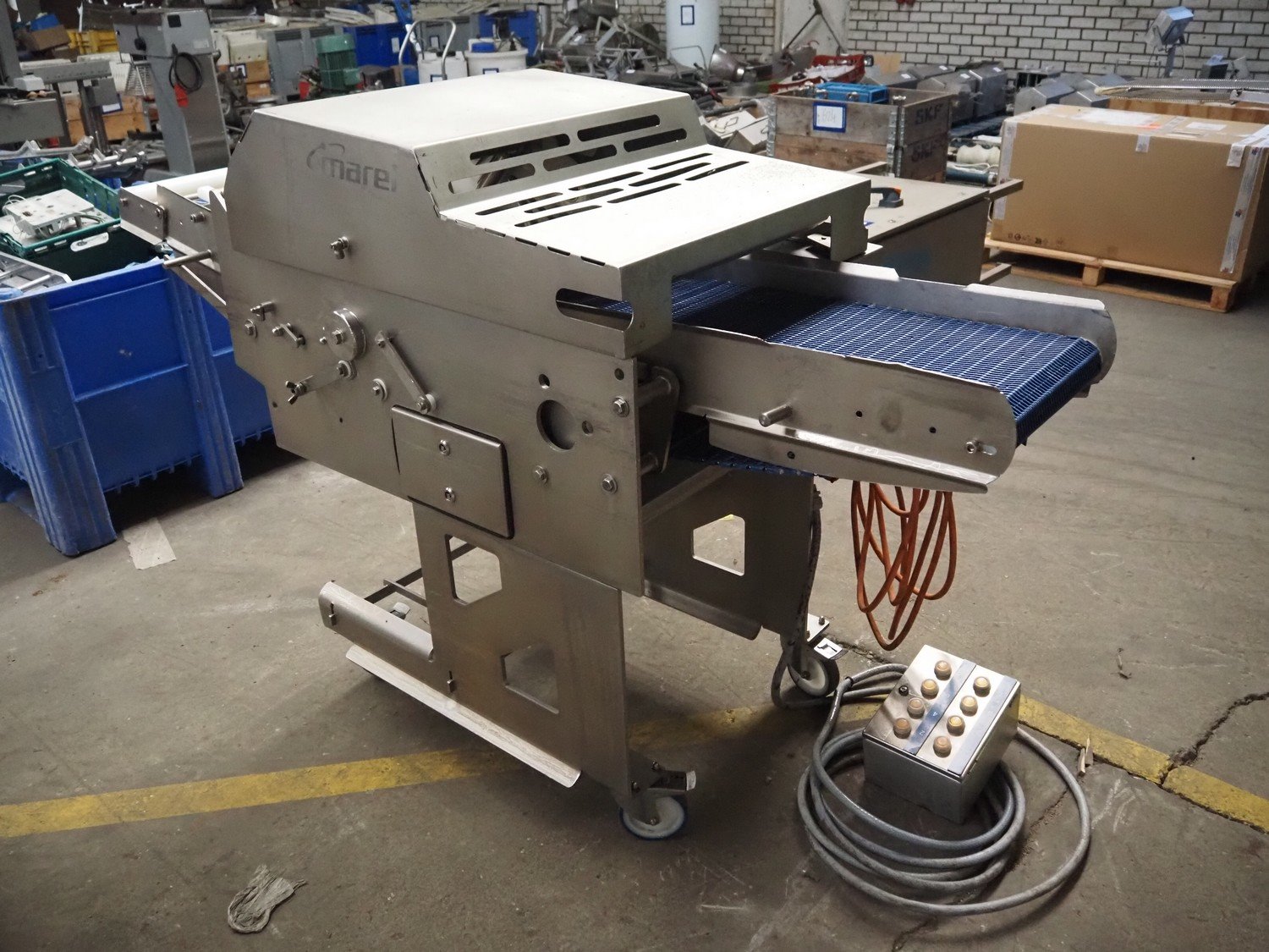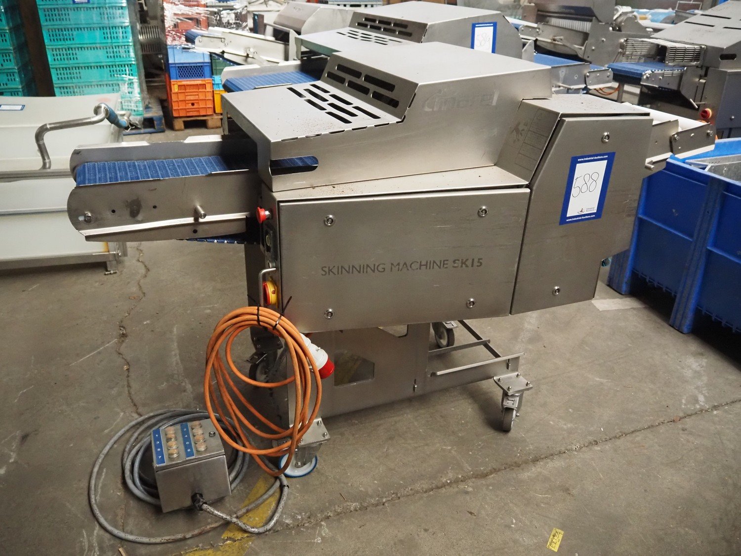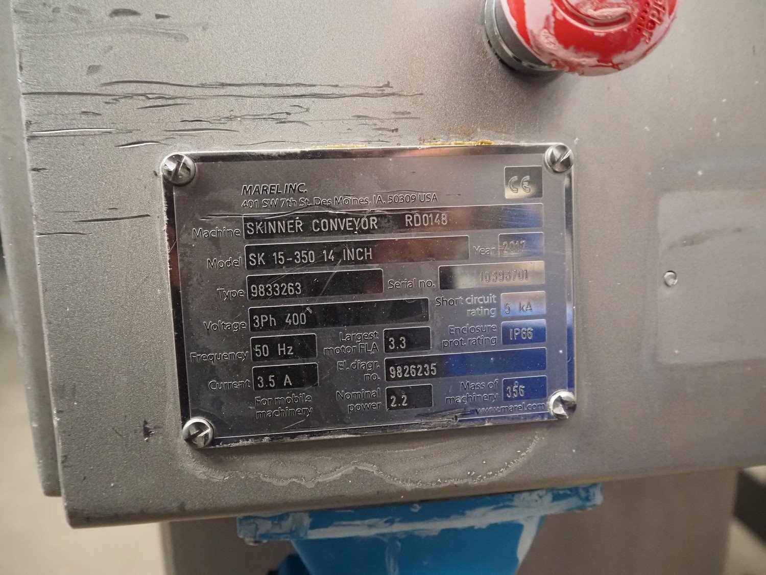 Marel Inc mobile skinning and derinding machine, model: SK 15-350 INCH, type: 9833263, serial number: 10398701, year of construction: 2017, 400 V, 3 Ph, 50 Hz, 3.5 A, 5 kA, weight: 356 kg, plastic mesh belt, belt width: 350 mm, working width: 360 mm, total dimensions: 2100 mm x 900 mm x 1240 mm. Incomplete.