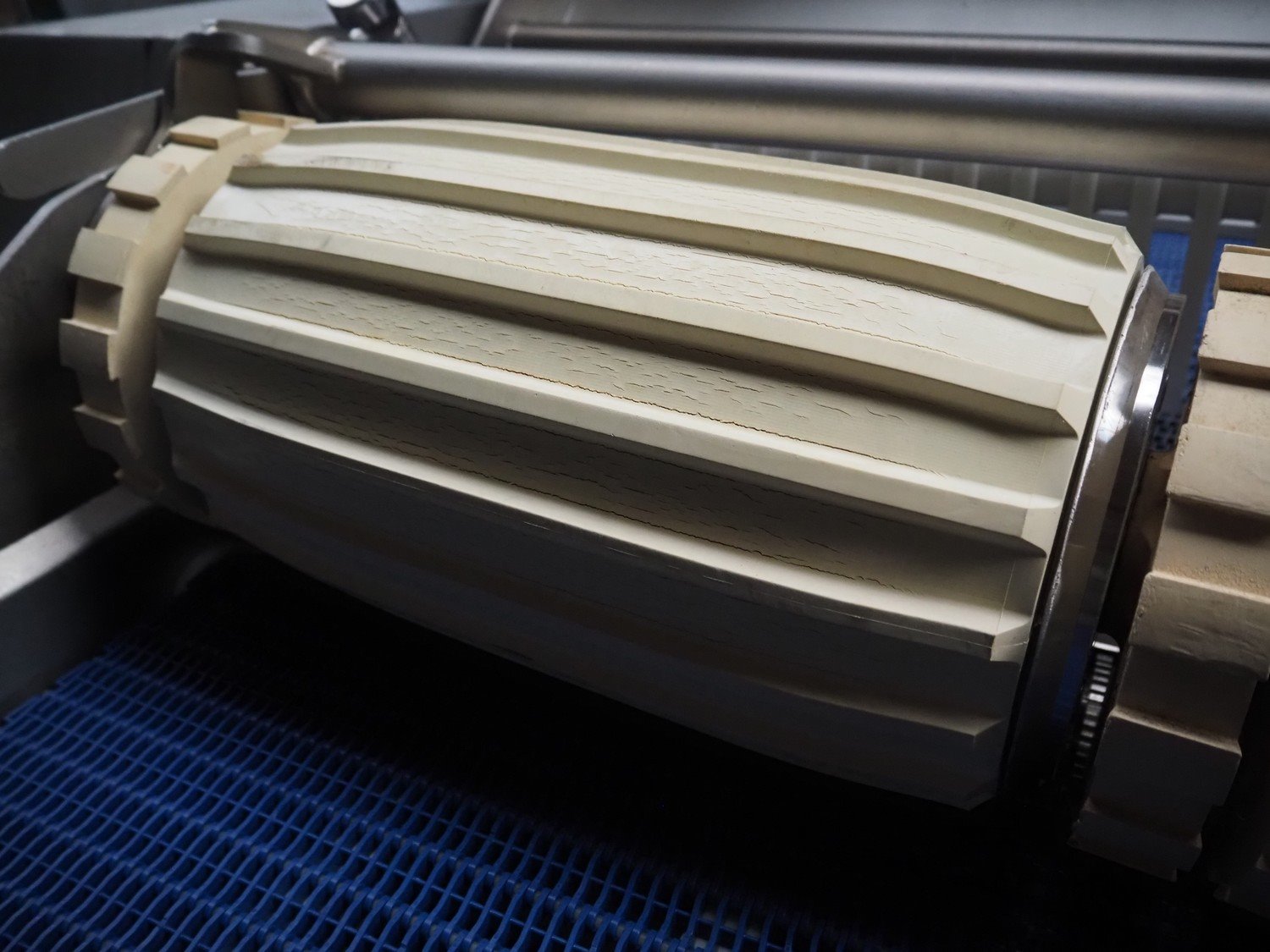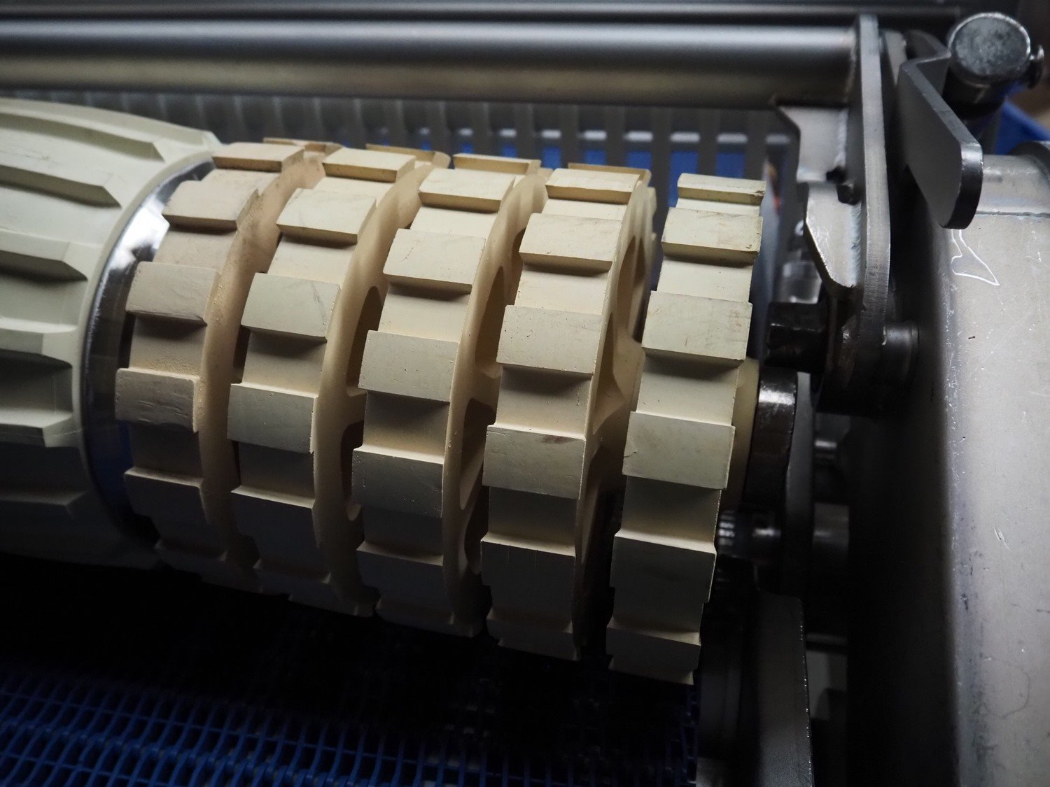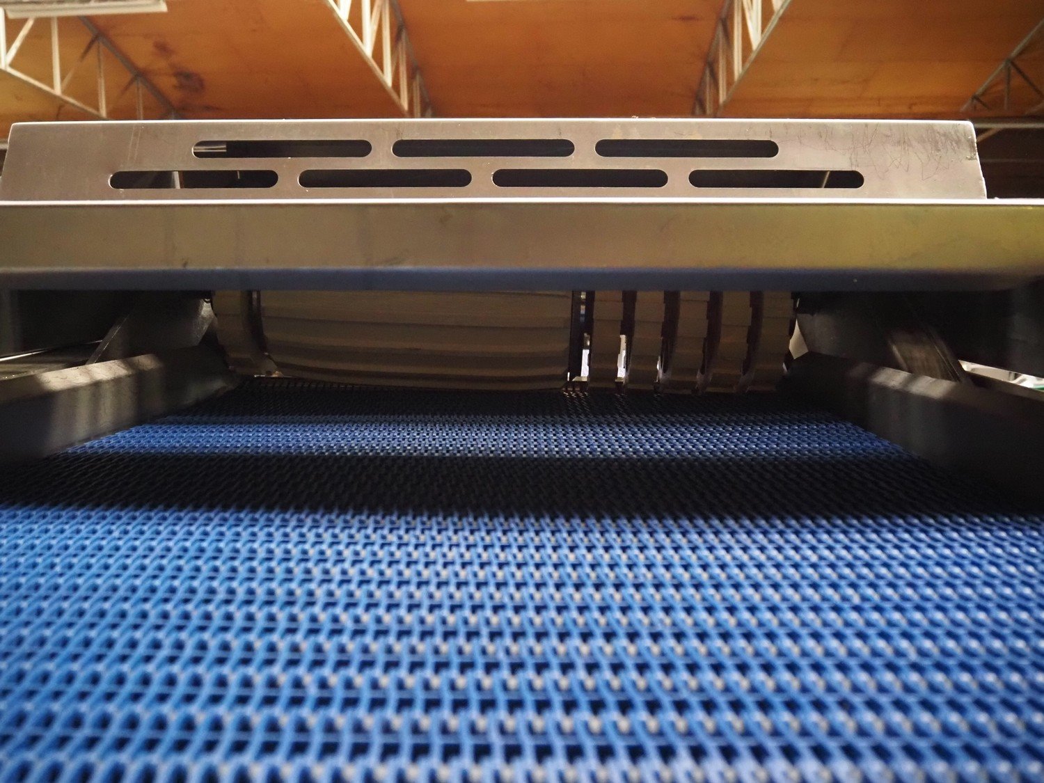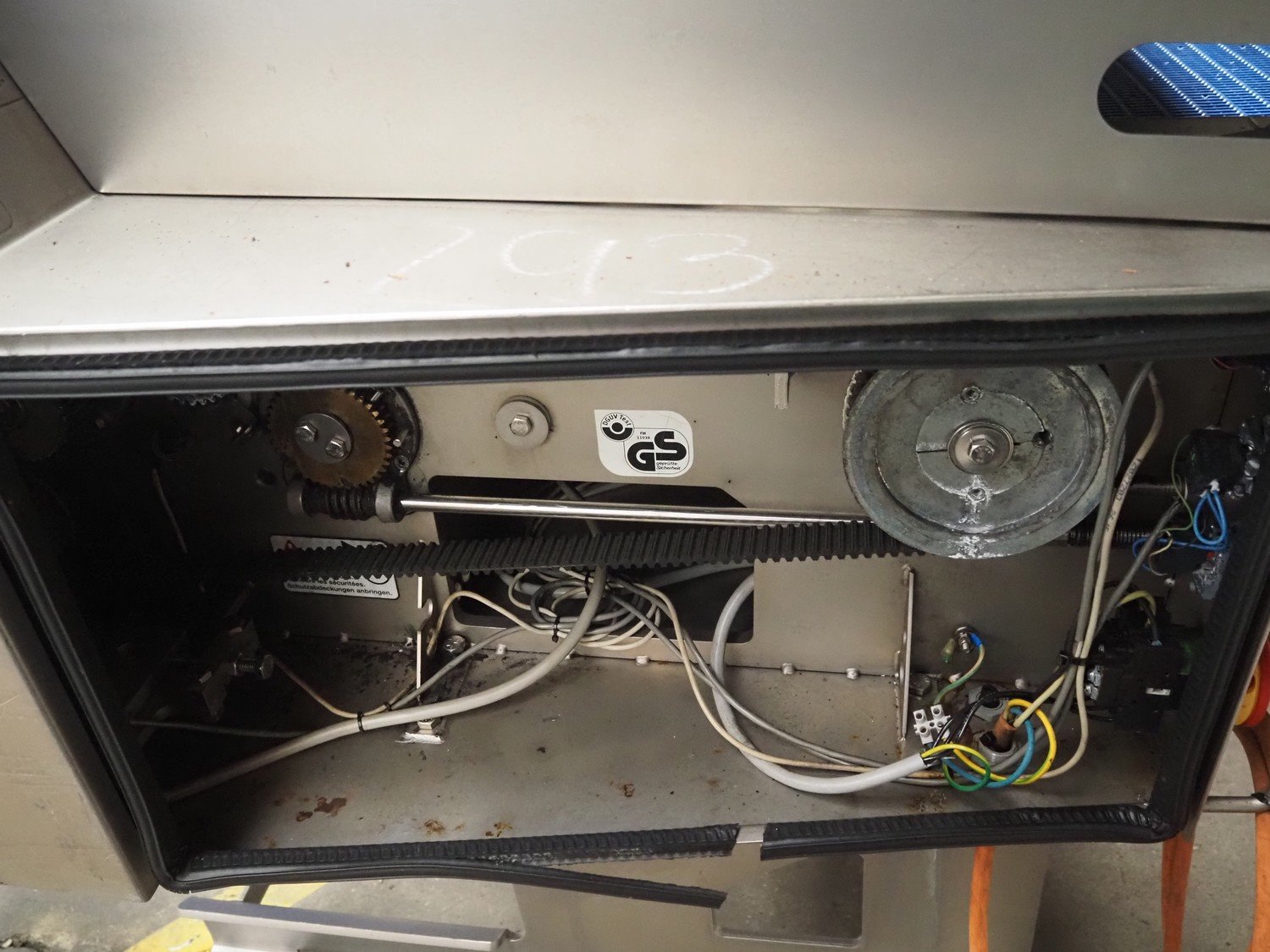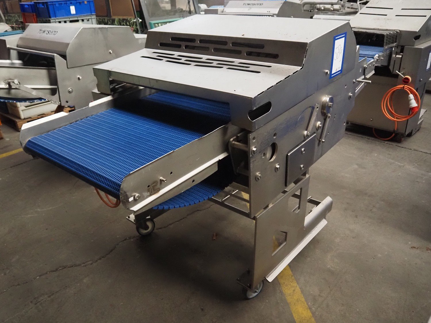 Marel Meat Processing mobile skinning and derinding machine, model: SK15-345 26 Inch, type: 9826745, serial number: 10141634, year of construction: 2015, 400 V, 3 Ph, 50 Hz, 3.5 A, 5 kA, weight: 447 kg, plastic mesh belt, belt width: 655 mm, working width: 665 mm, total dimensions: 2150 mm x 1200 mm x 1320 mm.