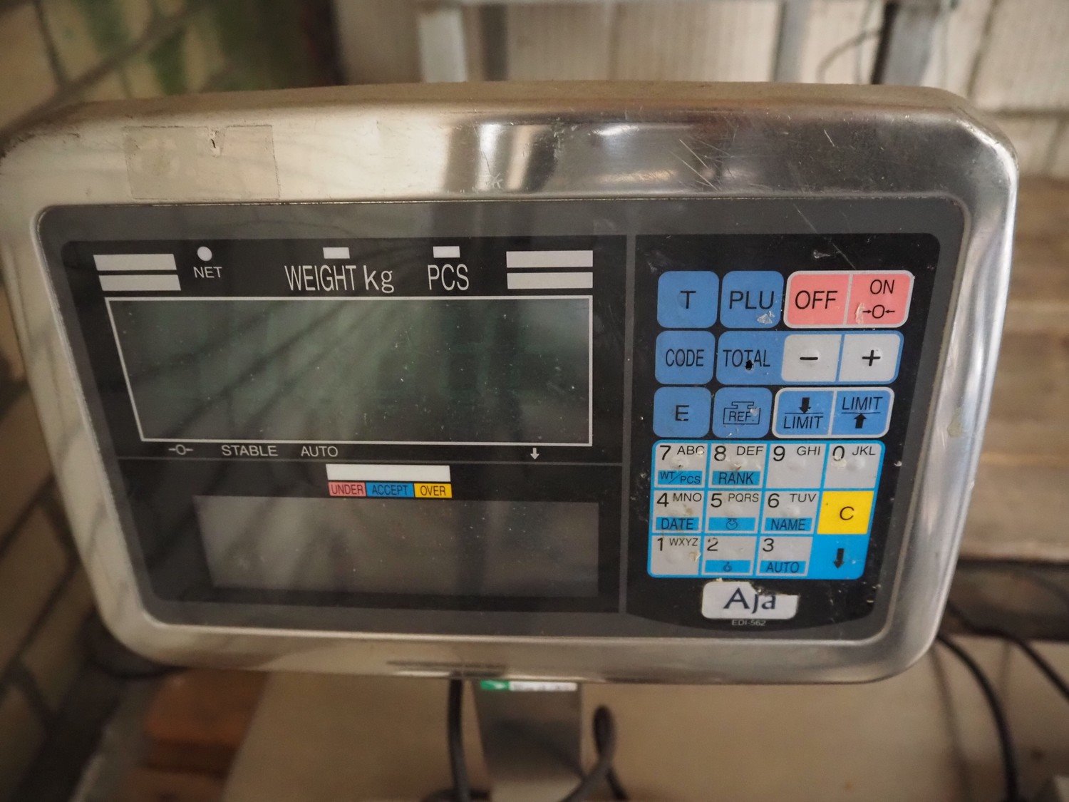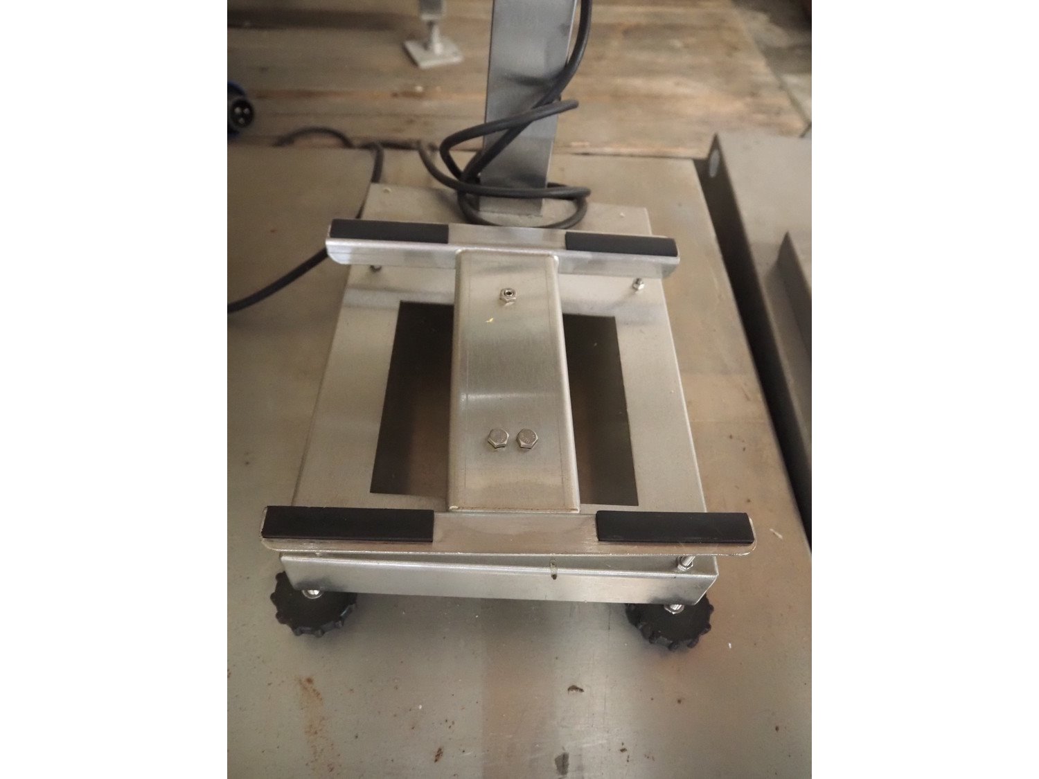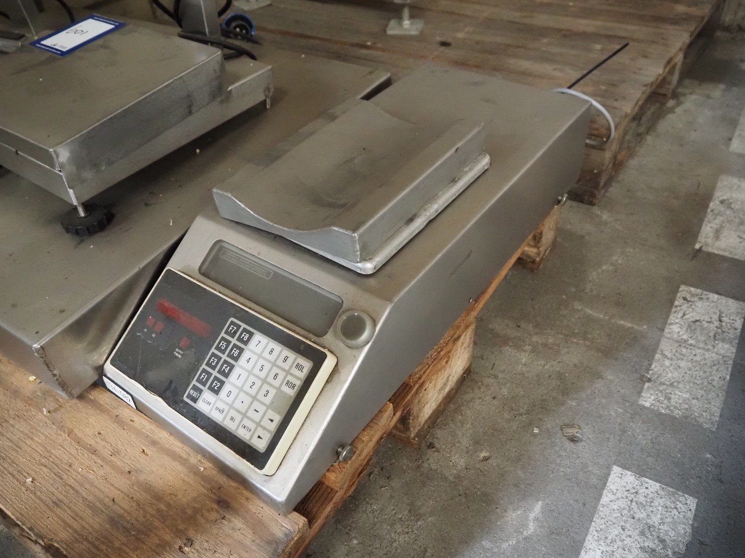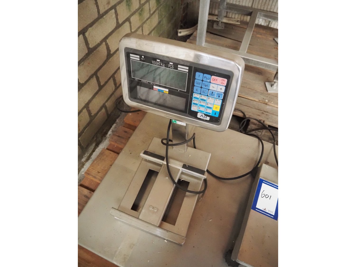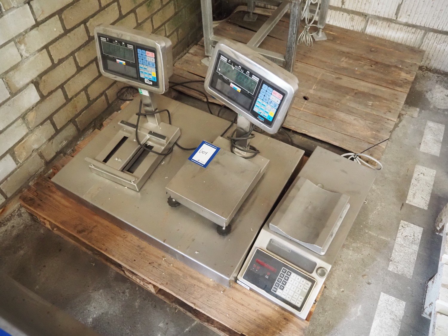 Pallet with 2 Aja weighing scales, dimensions scales: 240 mm x 240 mm, 1 scale missing, Weighing scale without indicator, dimensions: 800 mm x 600 mm, Buvv-Brown weighing scale, dimensions scale: 185 mm x 230 mm. Incomplete, technical condition unknown.