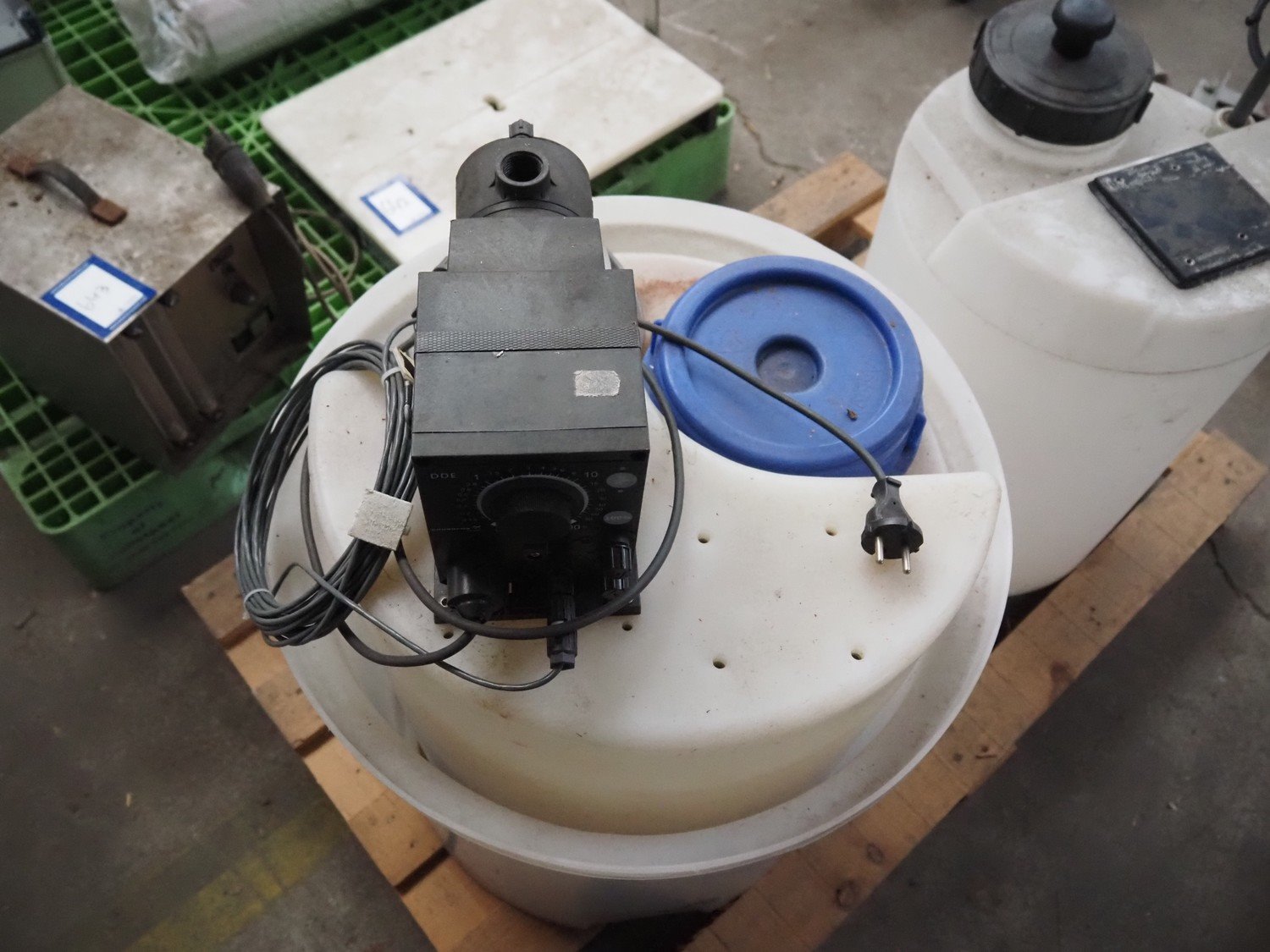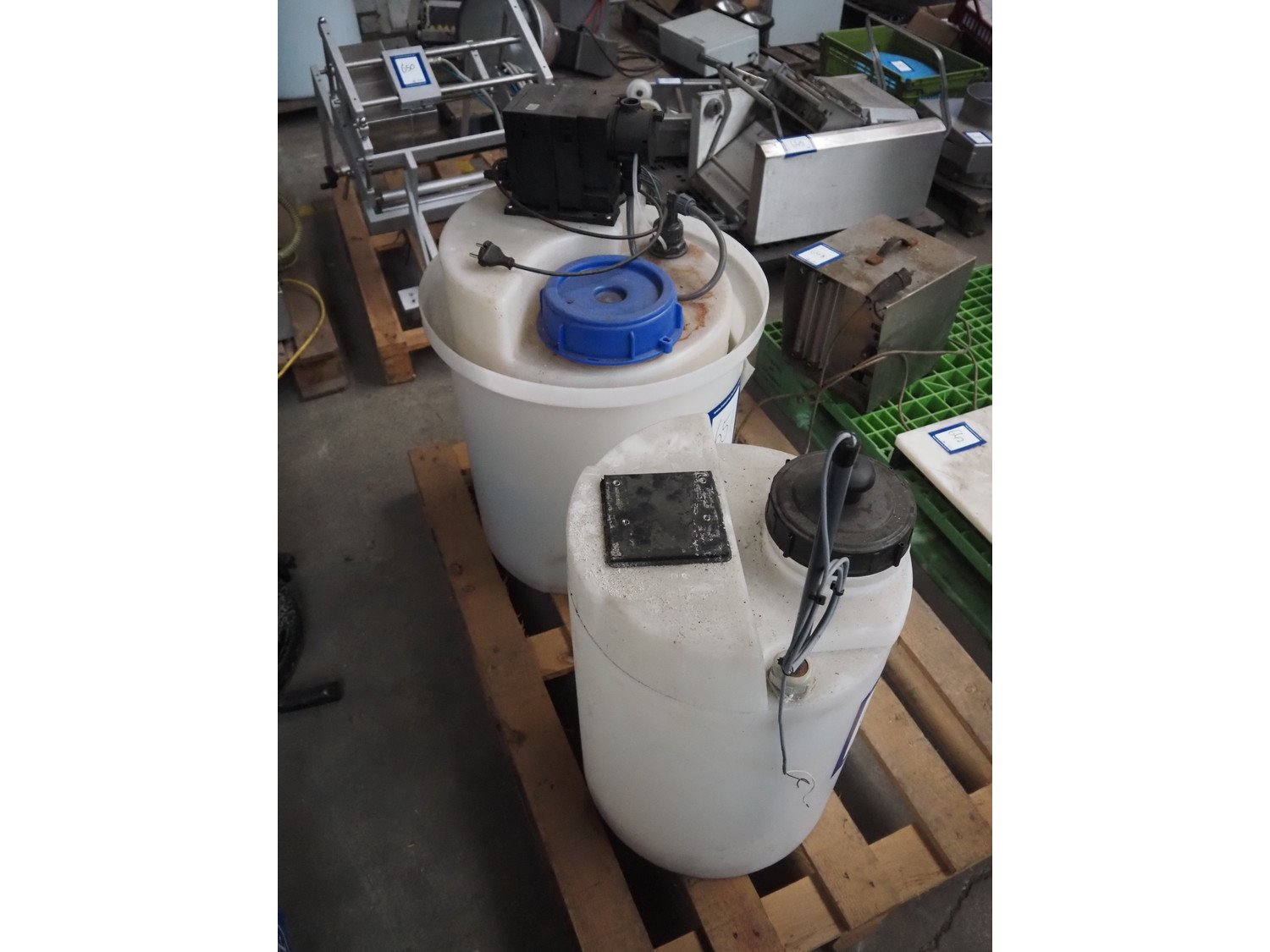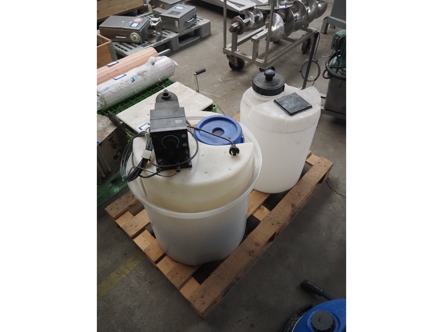 (2x) Plastic tubs (1x) with metering pump, volume: 100 liter, 60 liter.