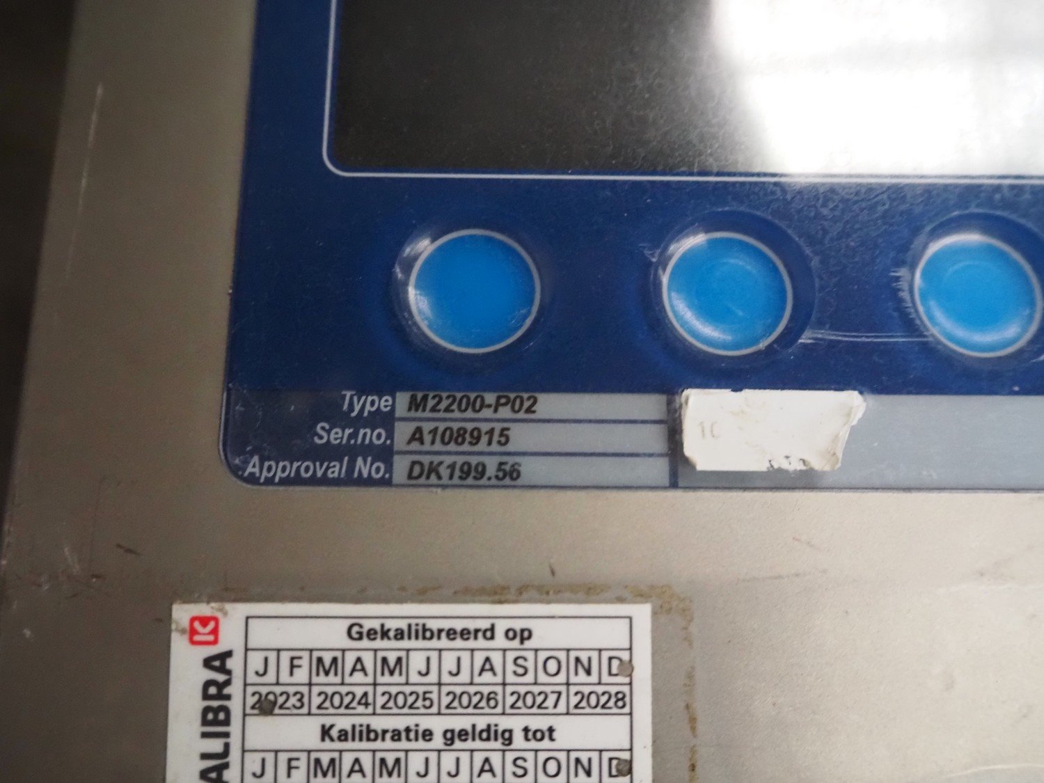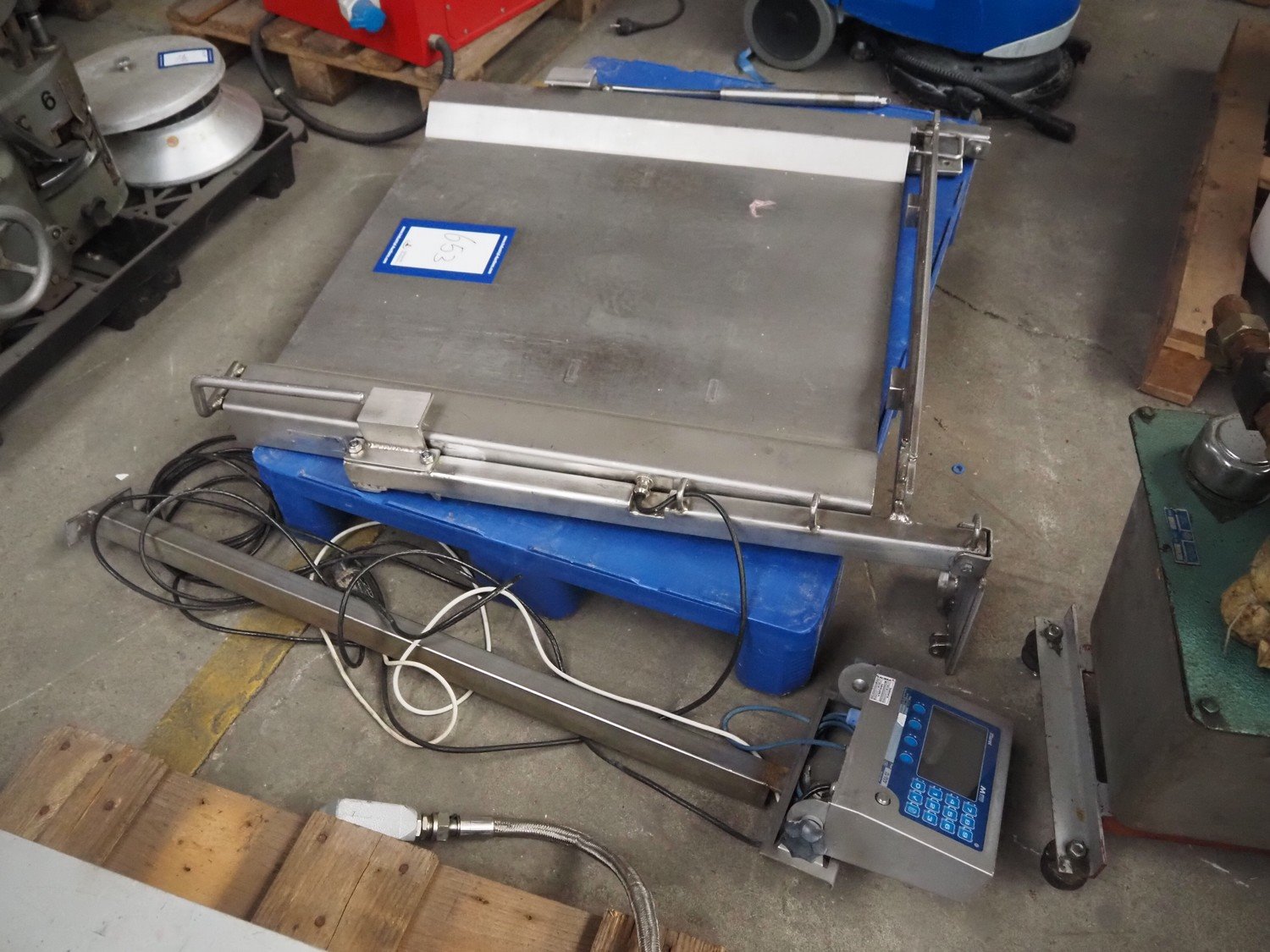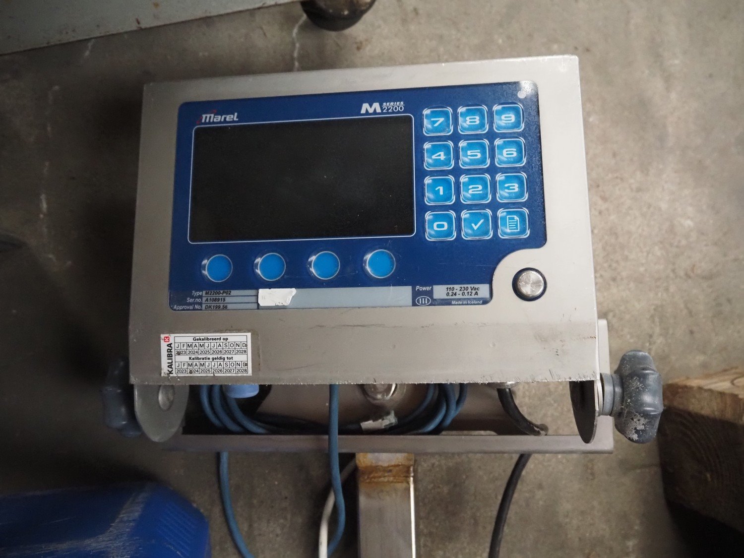 S/s floor weighing scale with Marel indicator, type: M2200-P02, serial number: A108915, 110-230 Vac, 0.24-0.12 A, dimensions scale: 900 mm x 900 mm.