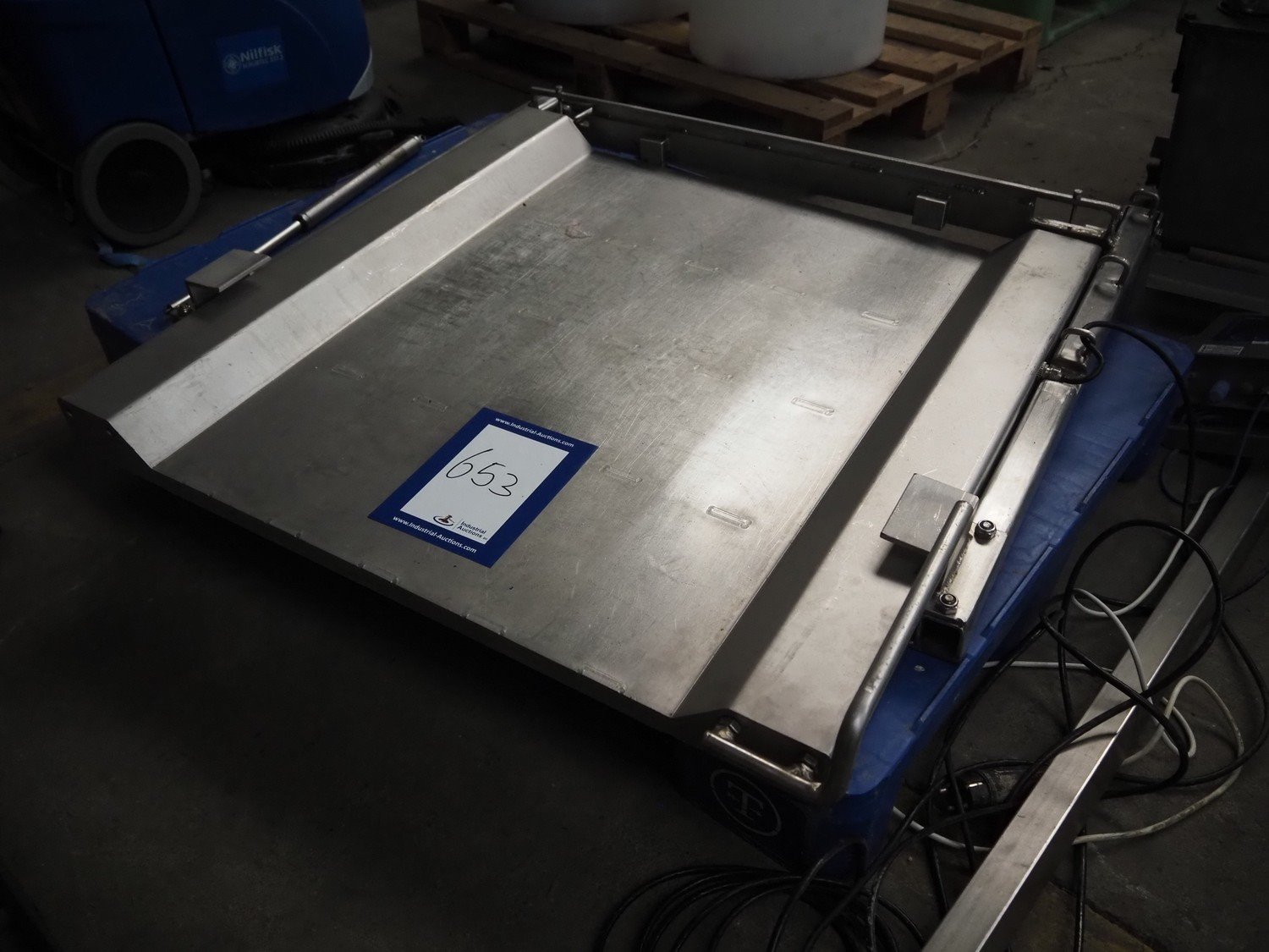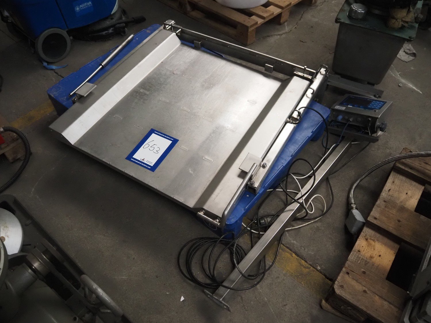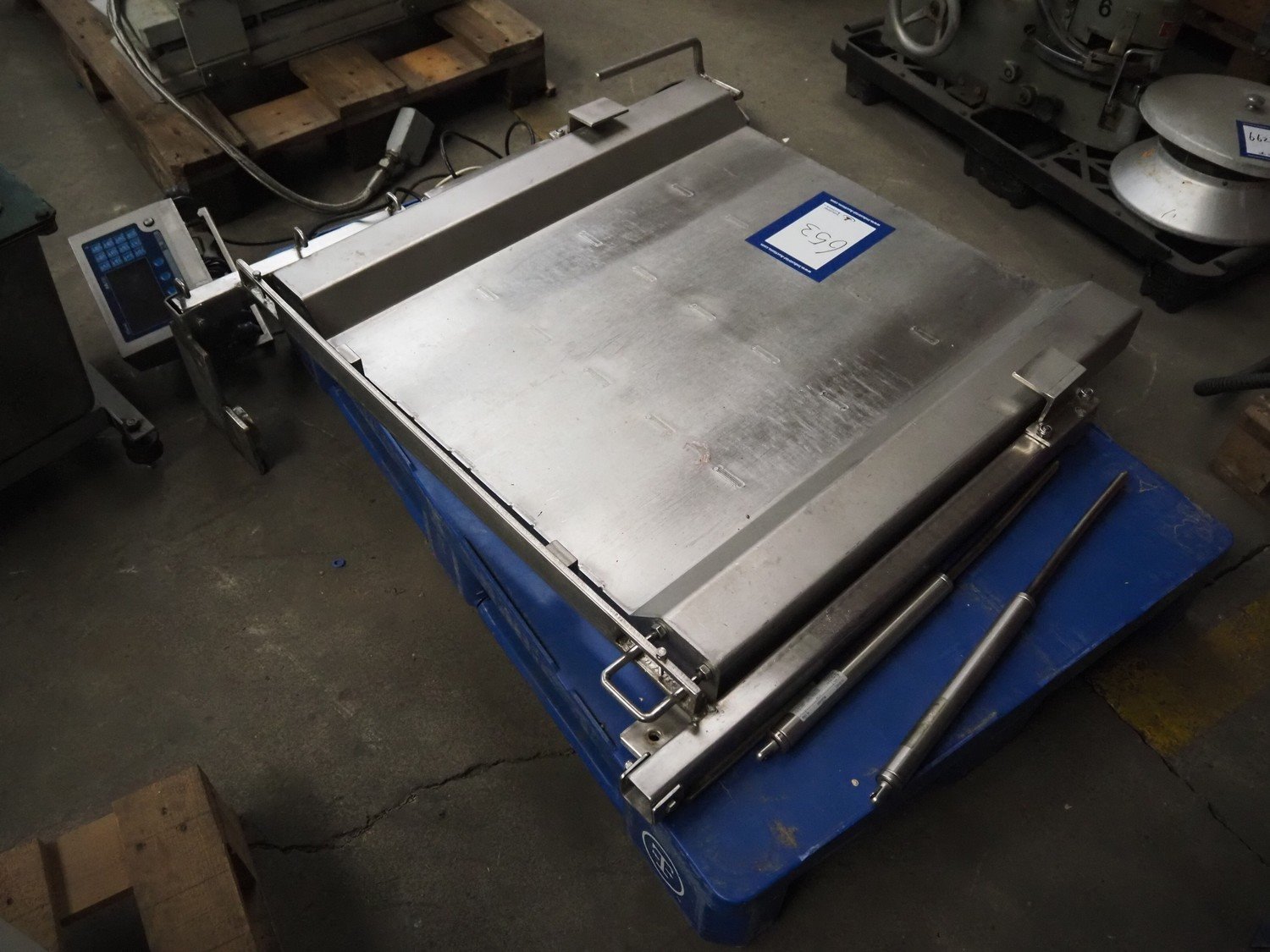 S/s floor weighing scale with Marel indicator, type: M2200-P02, serial number: A108915, 110-230 Vac, 0.24-0.12 A, dimensions scale: 900 mm x 900 mm.