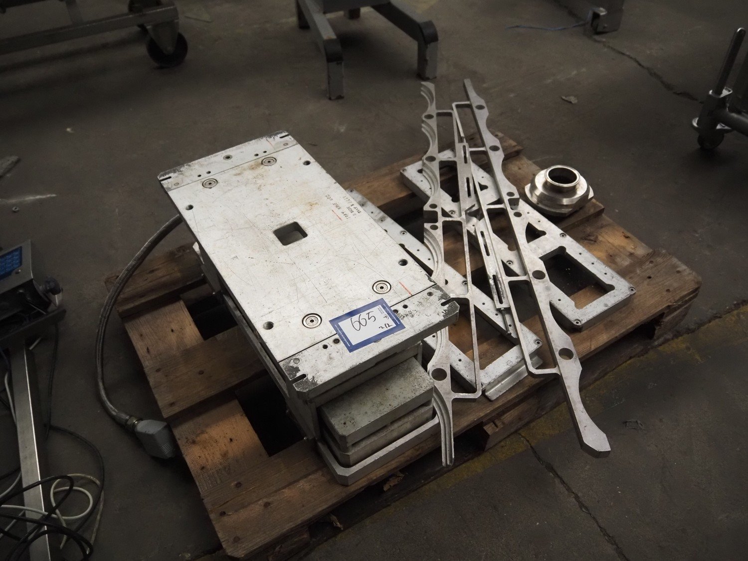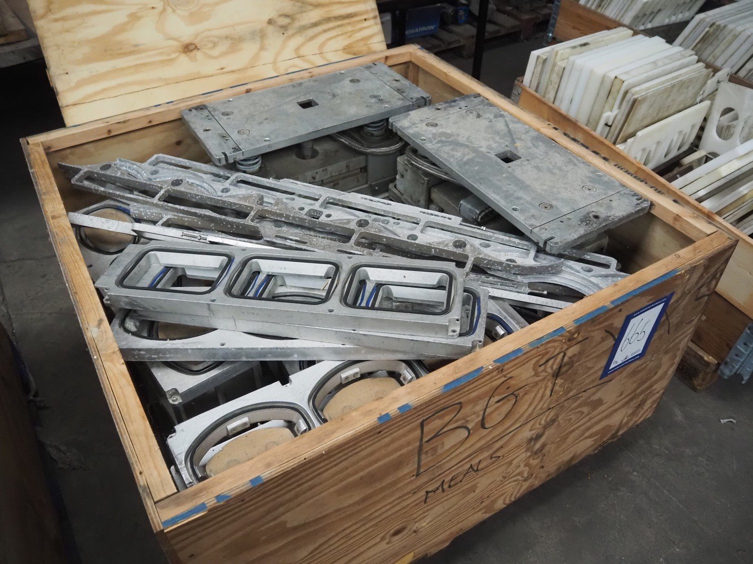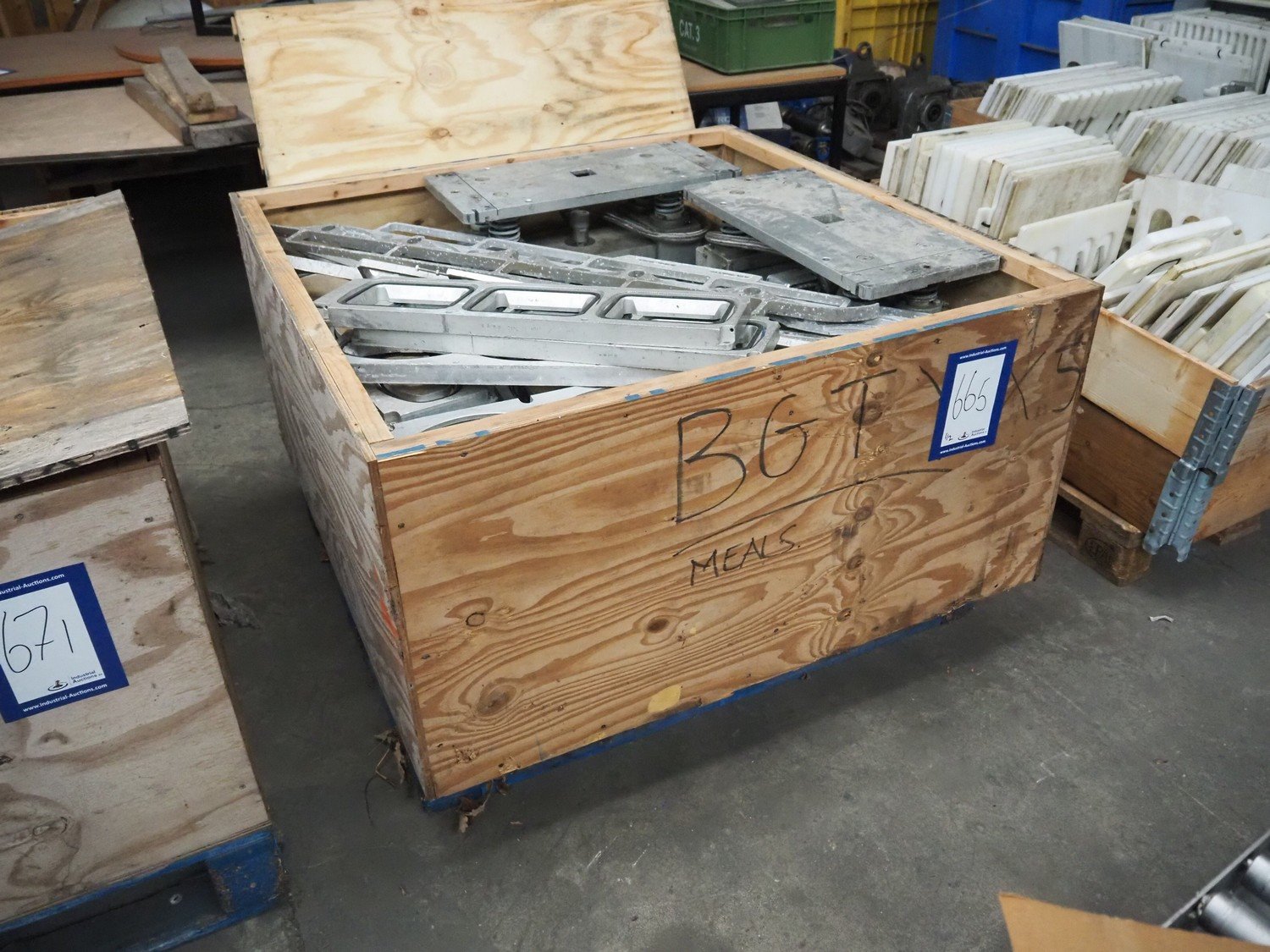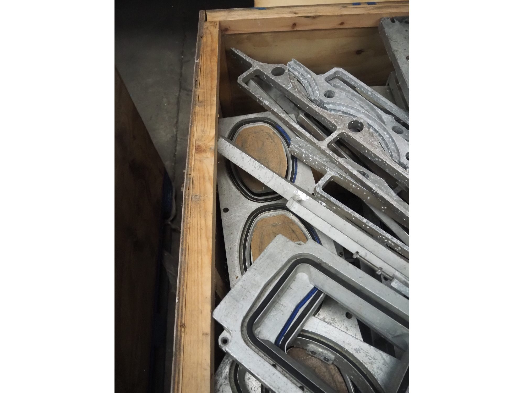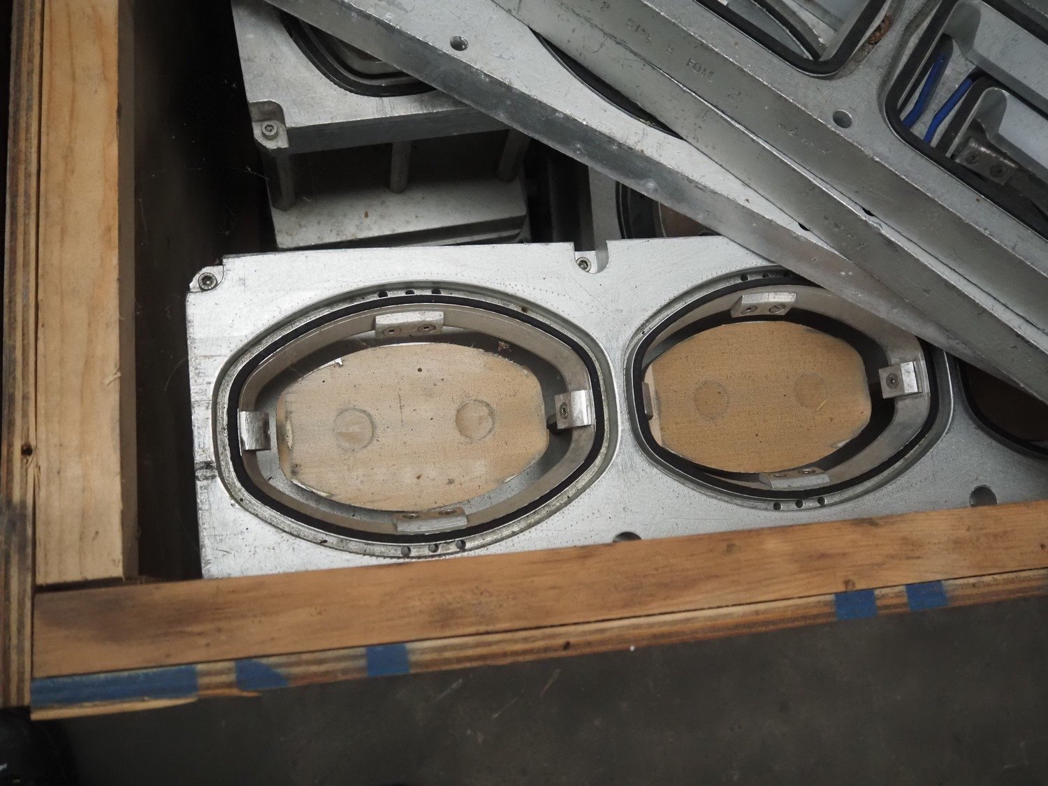 Wooden pallet box and pallet with various dye's for traysealer, dimensions pallet box: 1200 mm x 1200 mm x 850 mm dimensions pallet: 1200 mm x 800 mm x 450 mm.