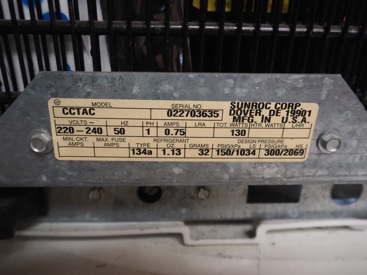Sunroc Corp. water dispenser, model: CCTAC, serial number: 022703635, 220-240 V, 1 Ph, 50 Hz, 0.75 A.