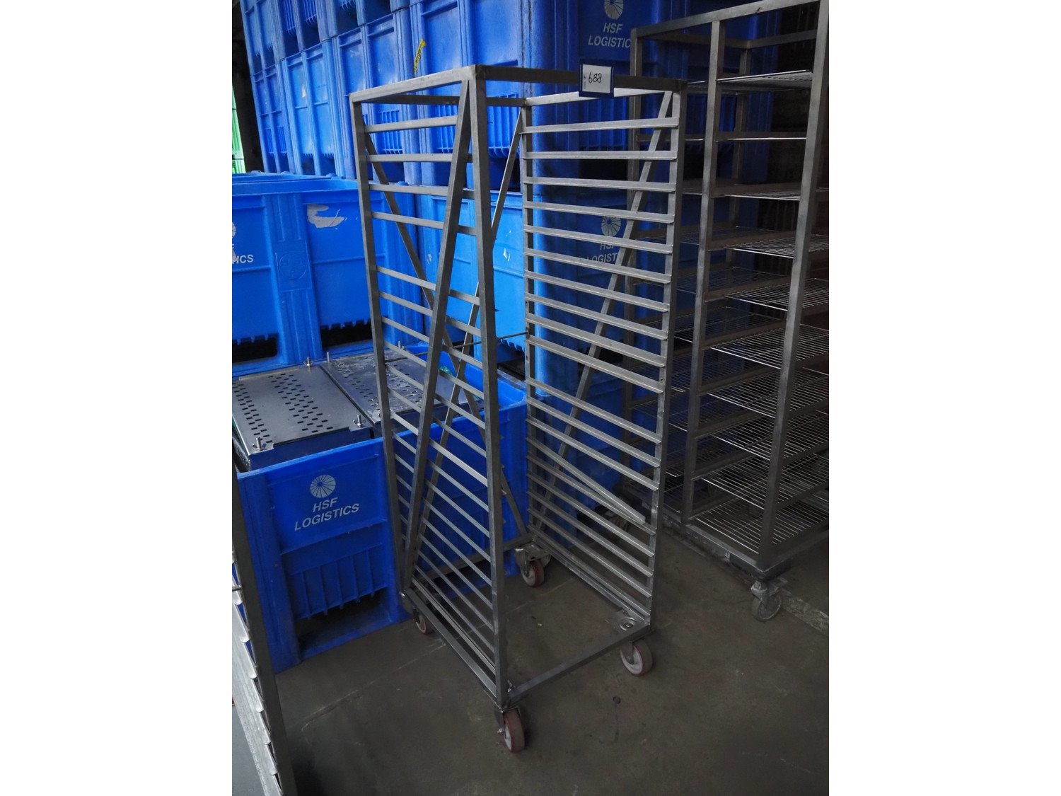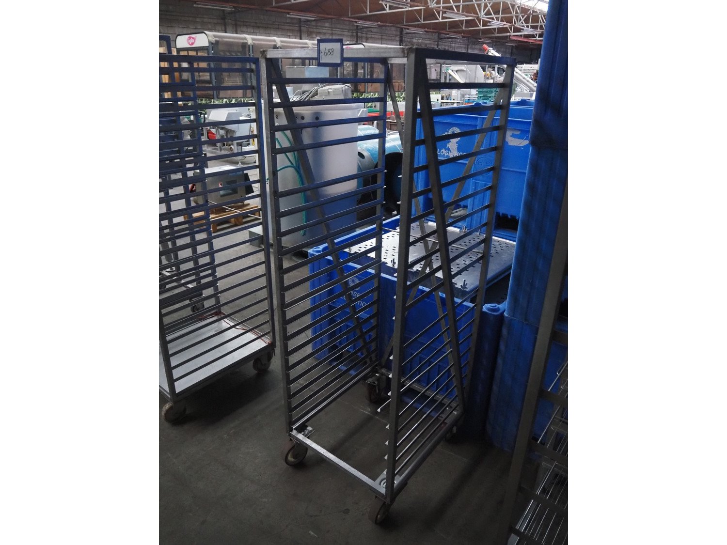 S/s trolley, 20 floors, floor dimensions: 680 mm x 530 mm, total dimensions: 680 mm x 590 mm x 1760 mm. Some floors are damaged.