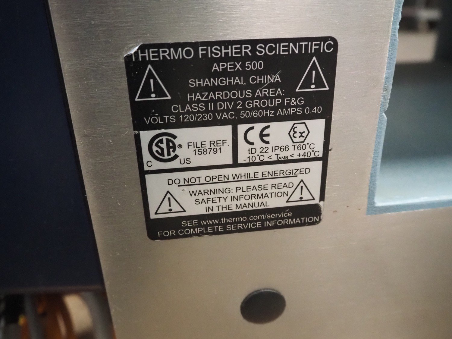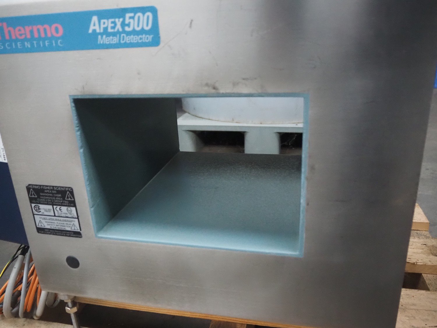 Thermo Scientific metal detector head, model: APEX 500, 120/230 V, 50/60 Hz, 0.4 A, clearance: 250 mm x 175 mm, total dimensions: 350 mm x 700 mm x 500 mm.