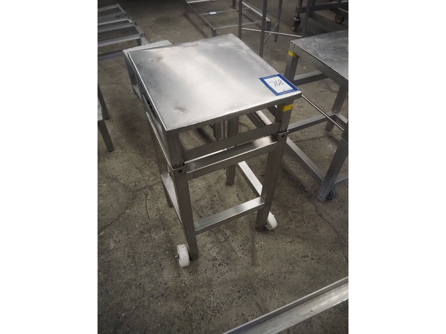 Mobile s/s table, dimensions: 450 mm x 400 mm x 840 mm.