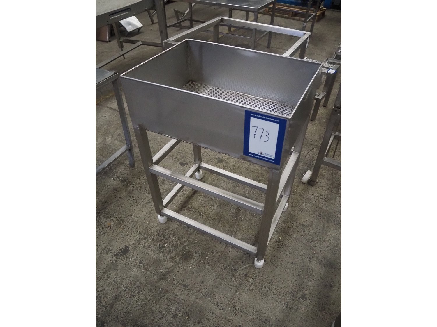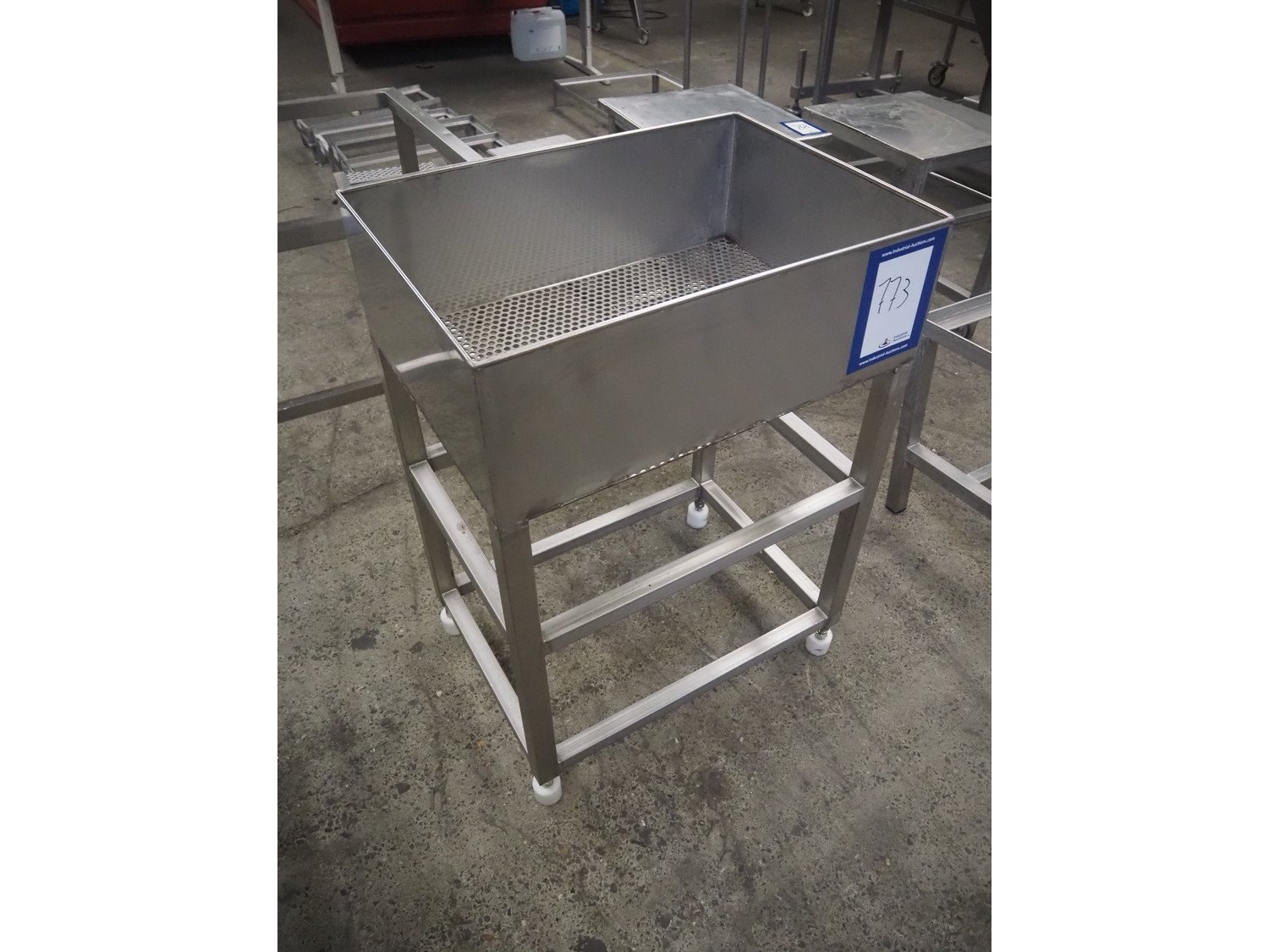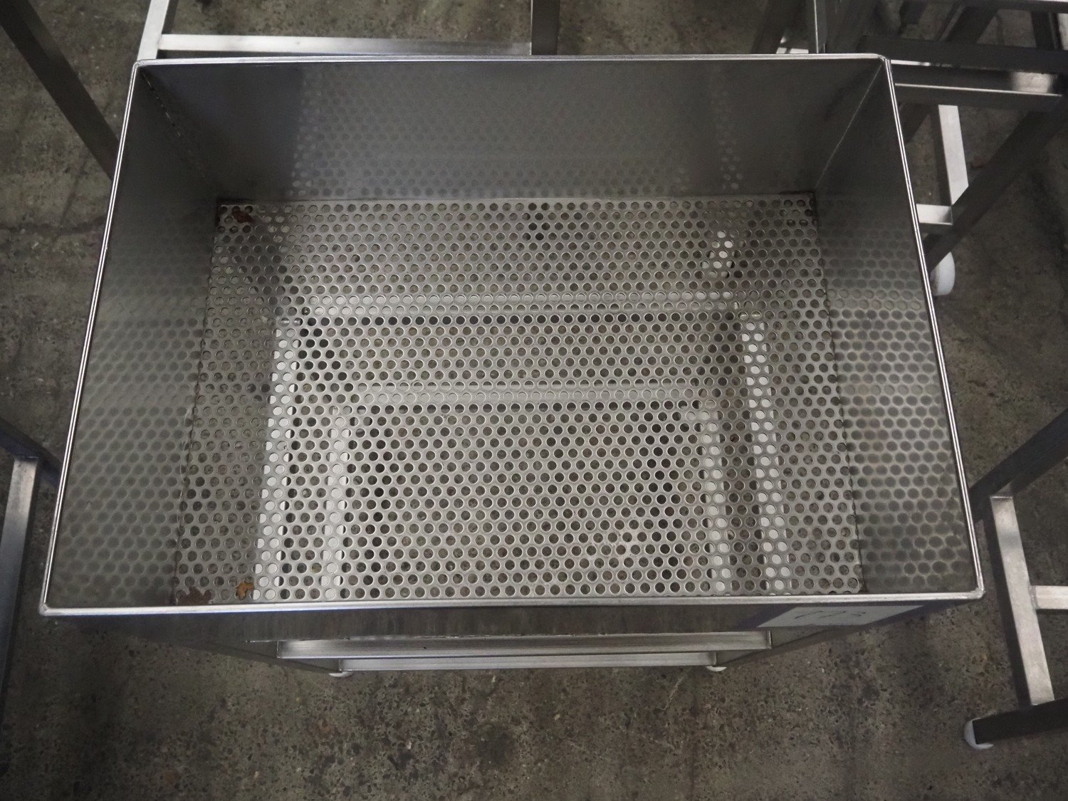 S/s perforated tub on s/s frame, perforations: Ø 10 mm, total dimensions: 700 mm x 500 mm x 1000 mm.