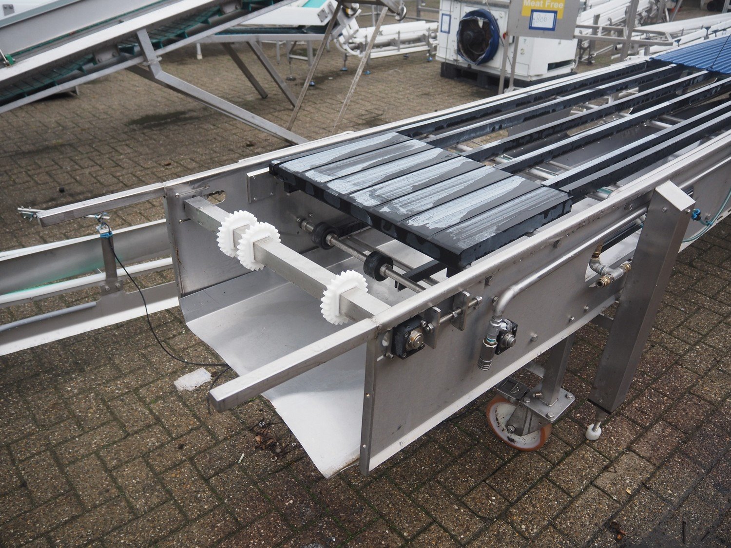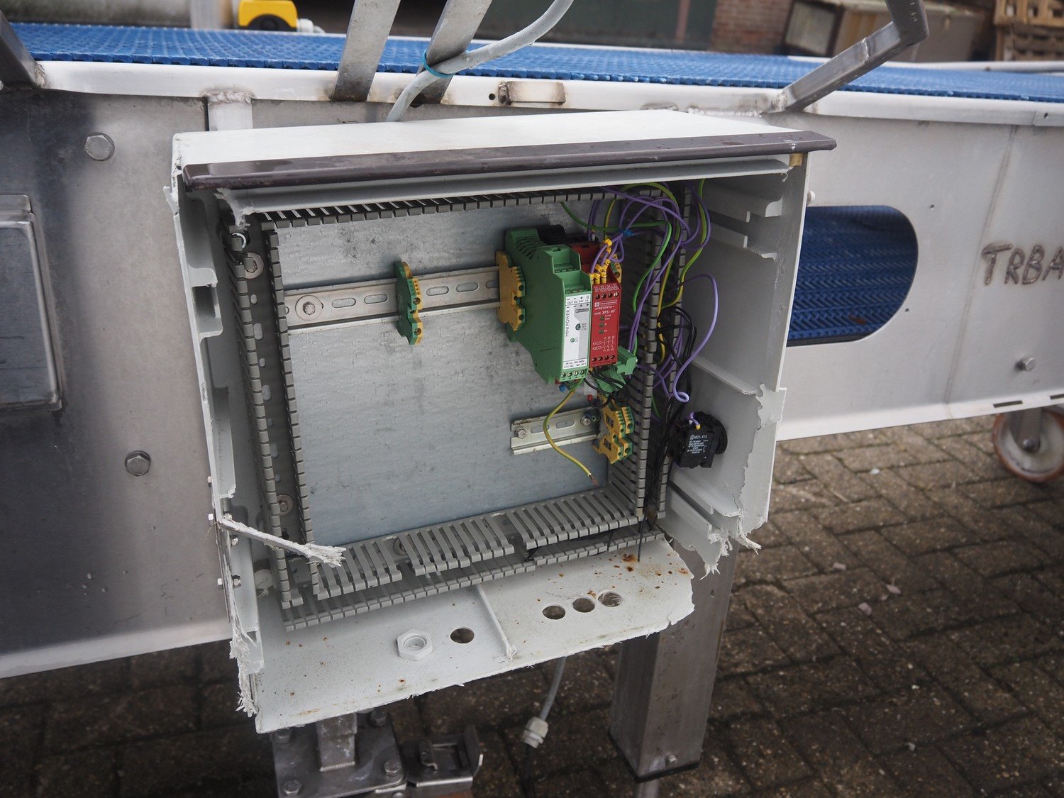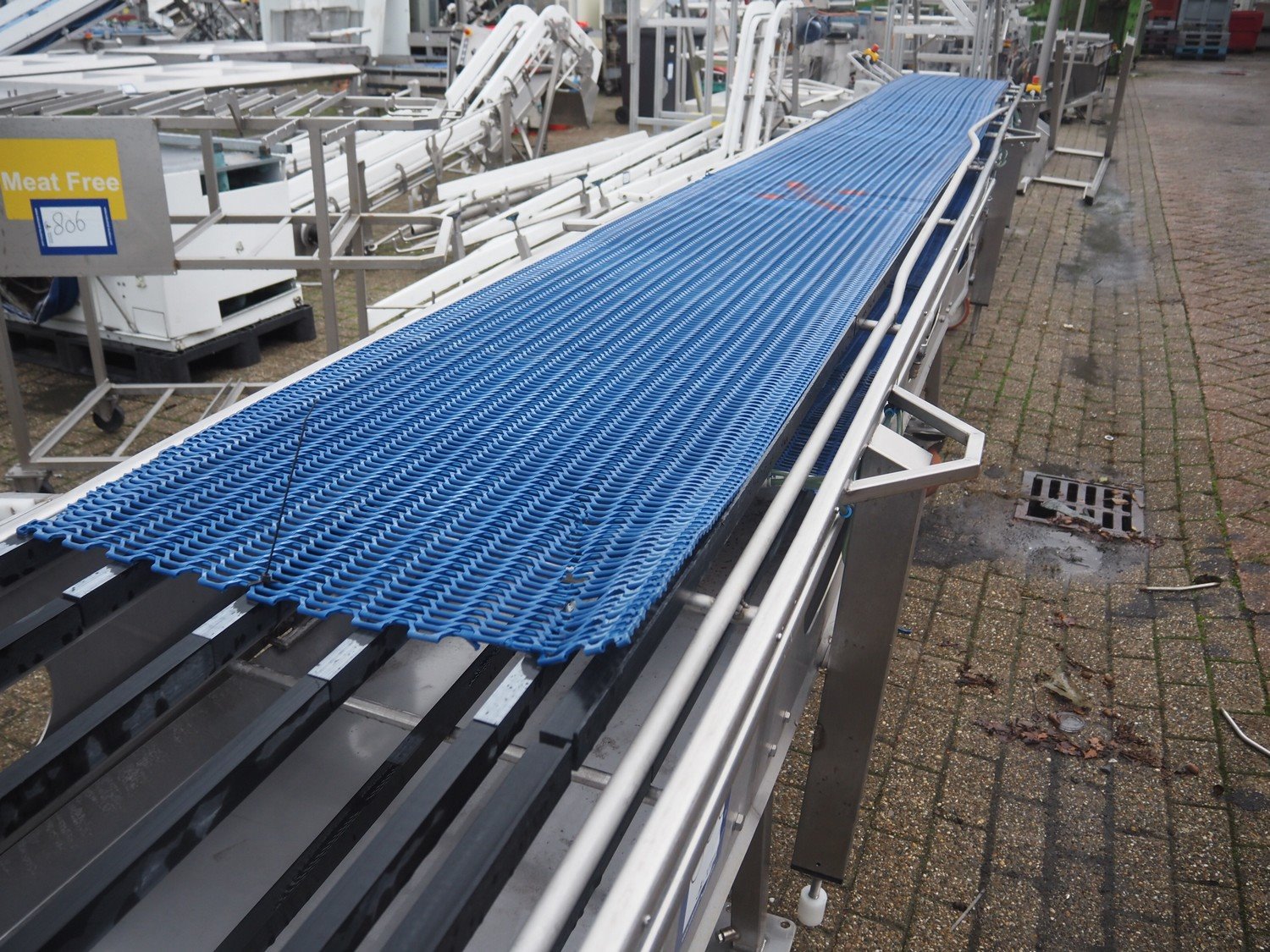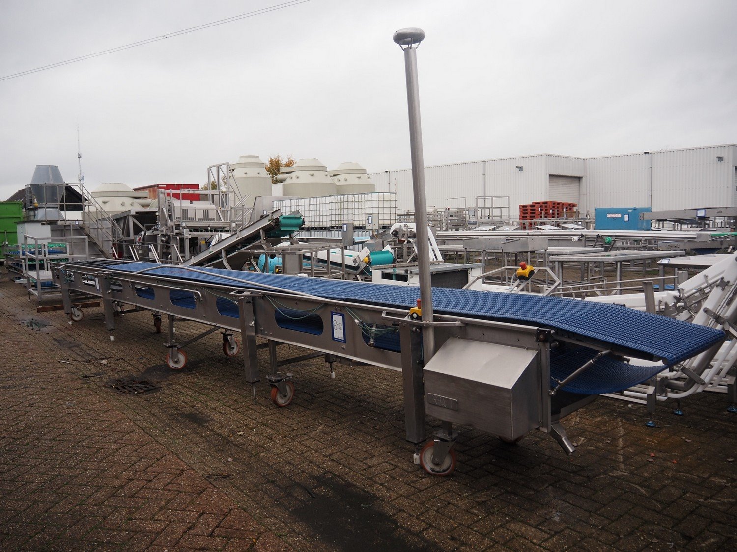 Mobile transport belt, plastic mesh belt, belt width: 395 mm, total dimensions: 9900 mm x 1200 mm x 2400 mm. Incomplete. Belt is broken.