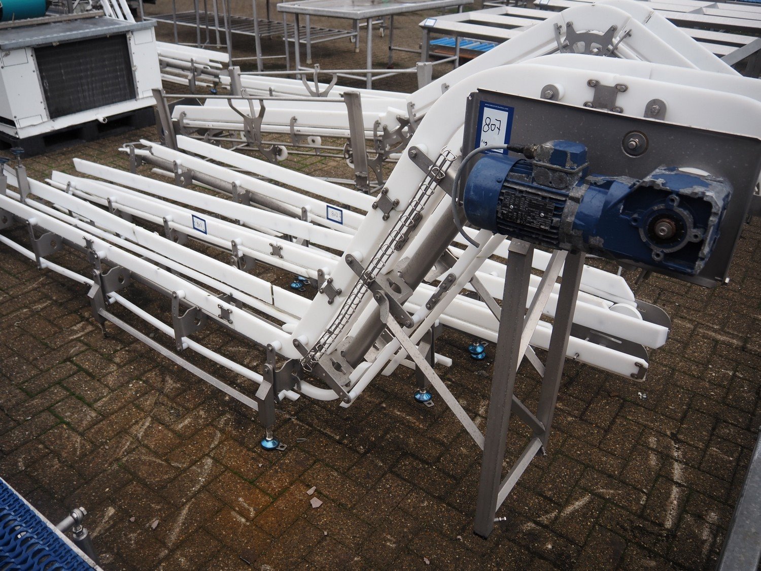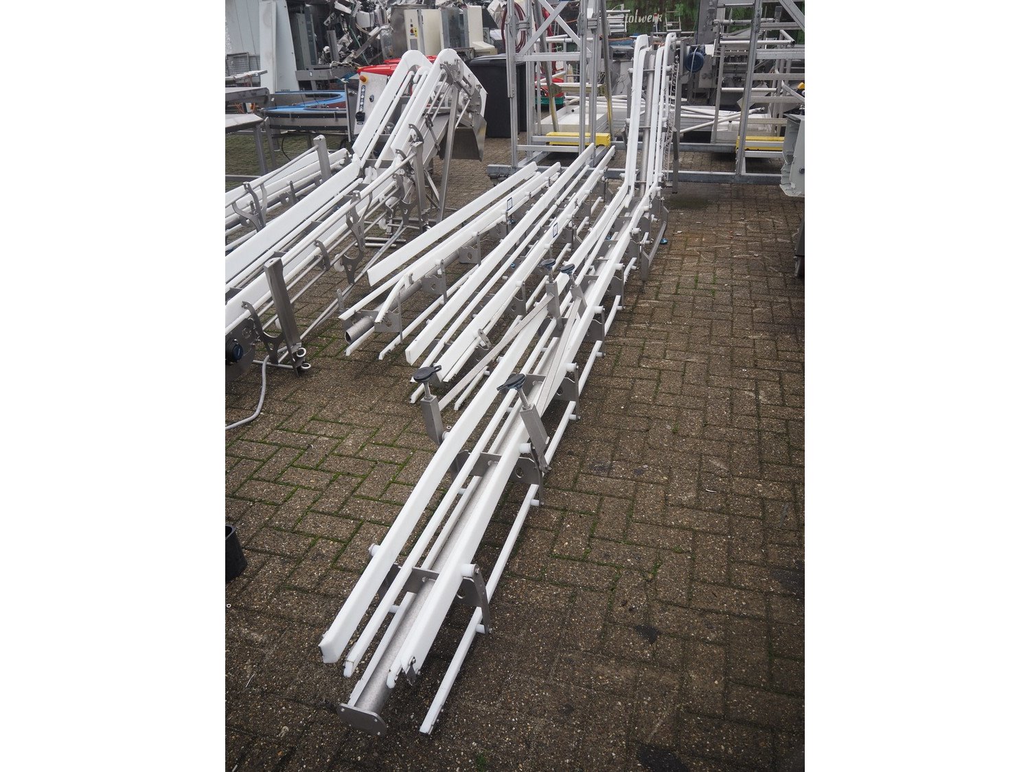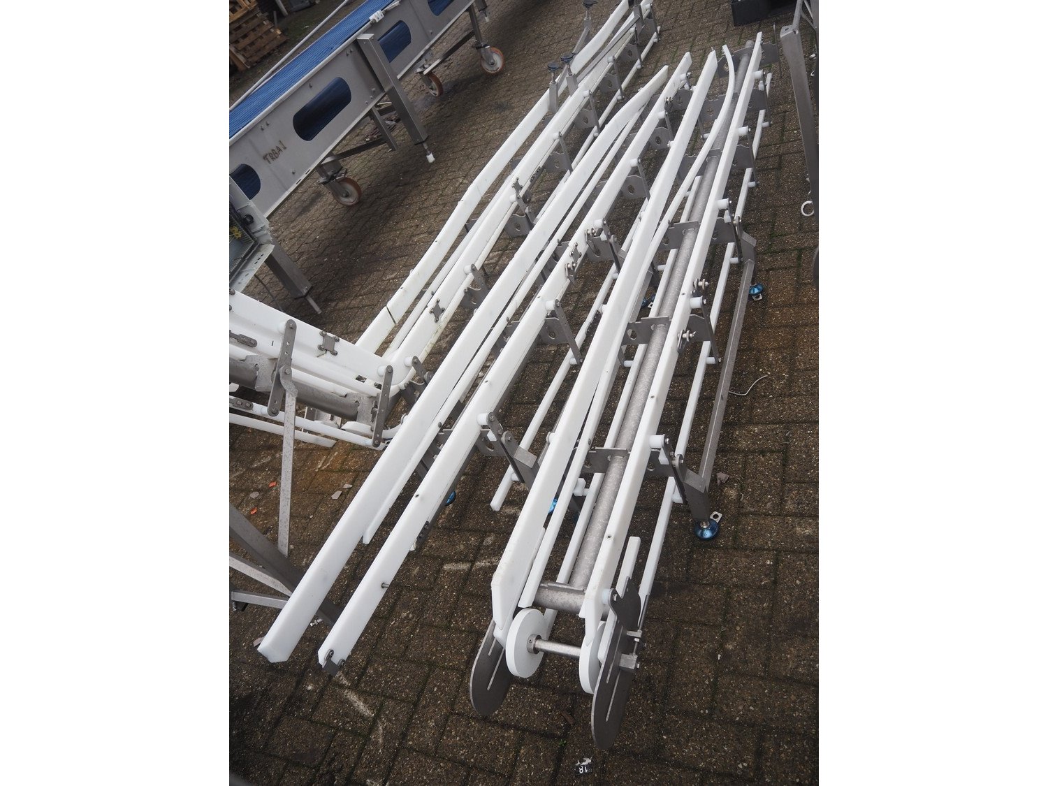 Marel s/s frame for elevating belt, model: X9952, type: 4811707, serial number: 10431849, year of construction: 2019, maximum belt width: 180 mm, dimensions: (1x) 5000 mm x 650 mm x 1400 mm, (2x) 3700 mm x 400 mm x 500 mm.