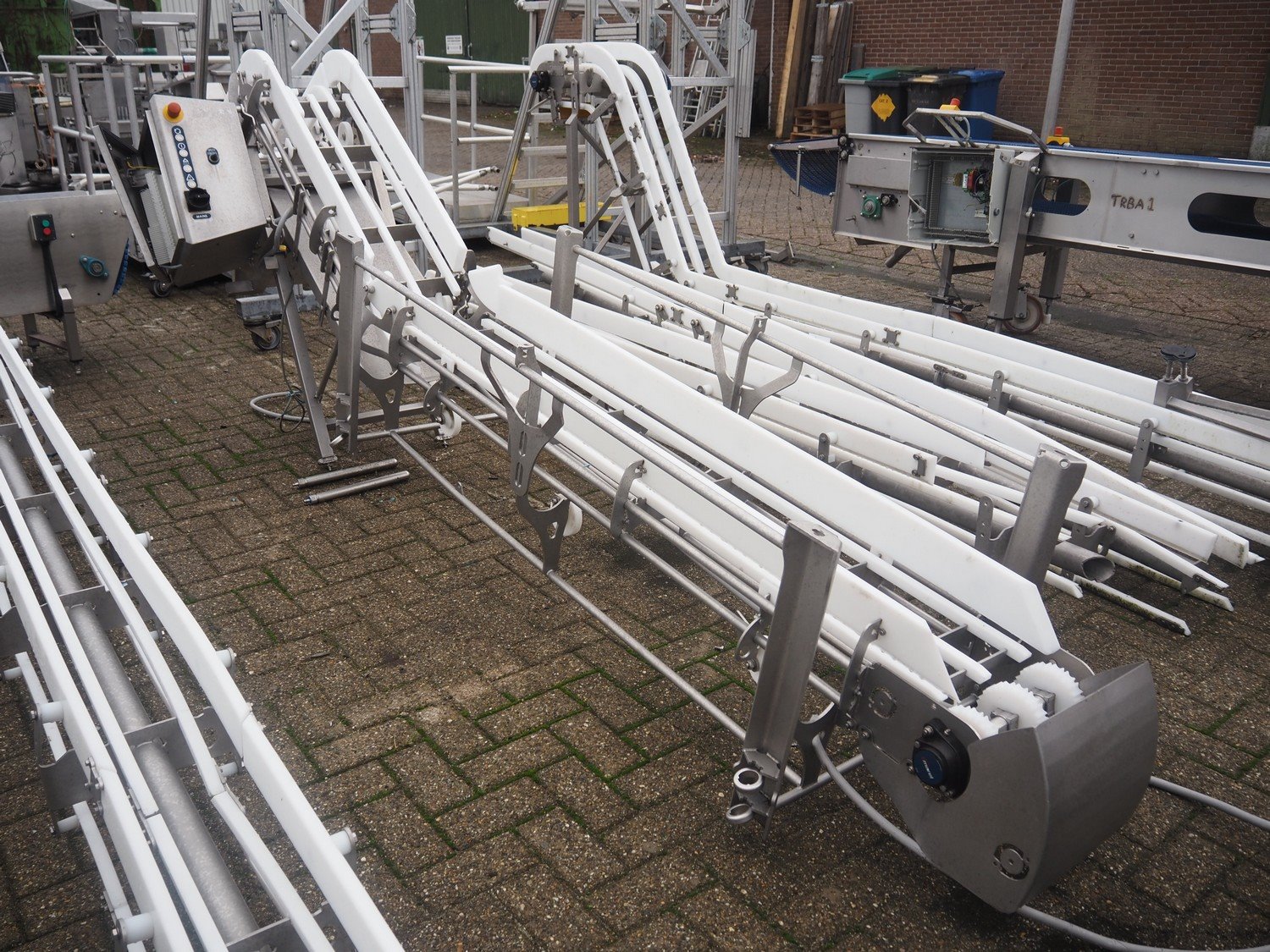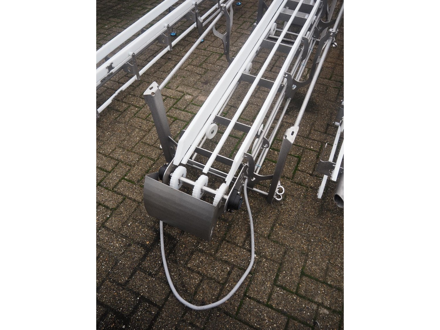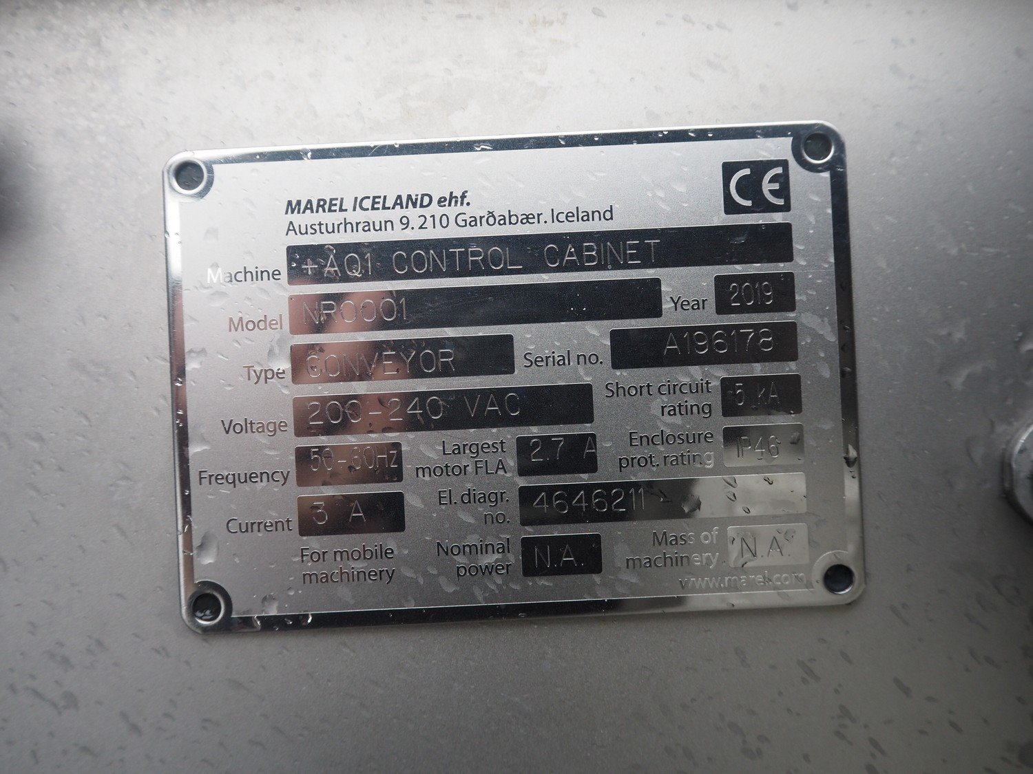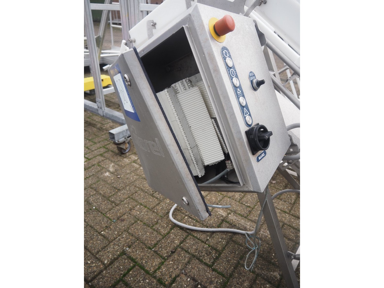 Marel s/s frame for elevating belt, model: NR0001, type: Conveyor, serial number: A196178, year of construction: 2019, 200/240 V, 50/60 Hz, 3 A, maximum belt width: 260 mm, total dimensions: 3800 mm x 1000 mm x 1400 mm.