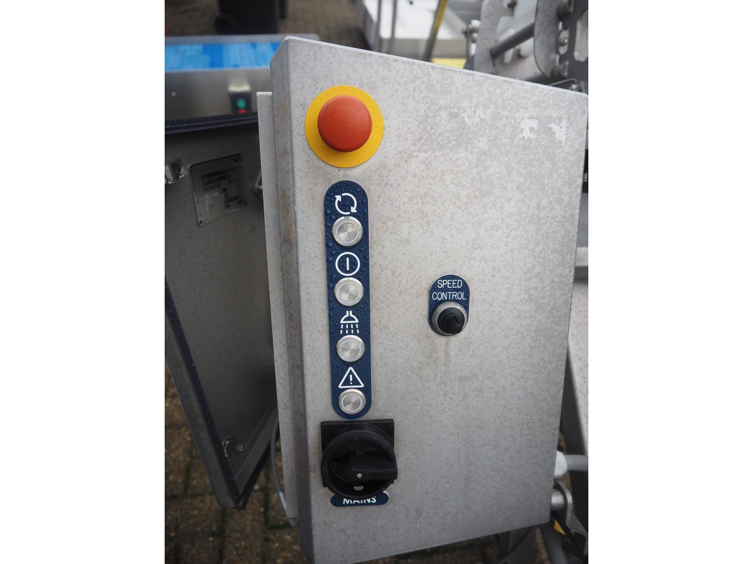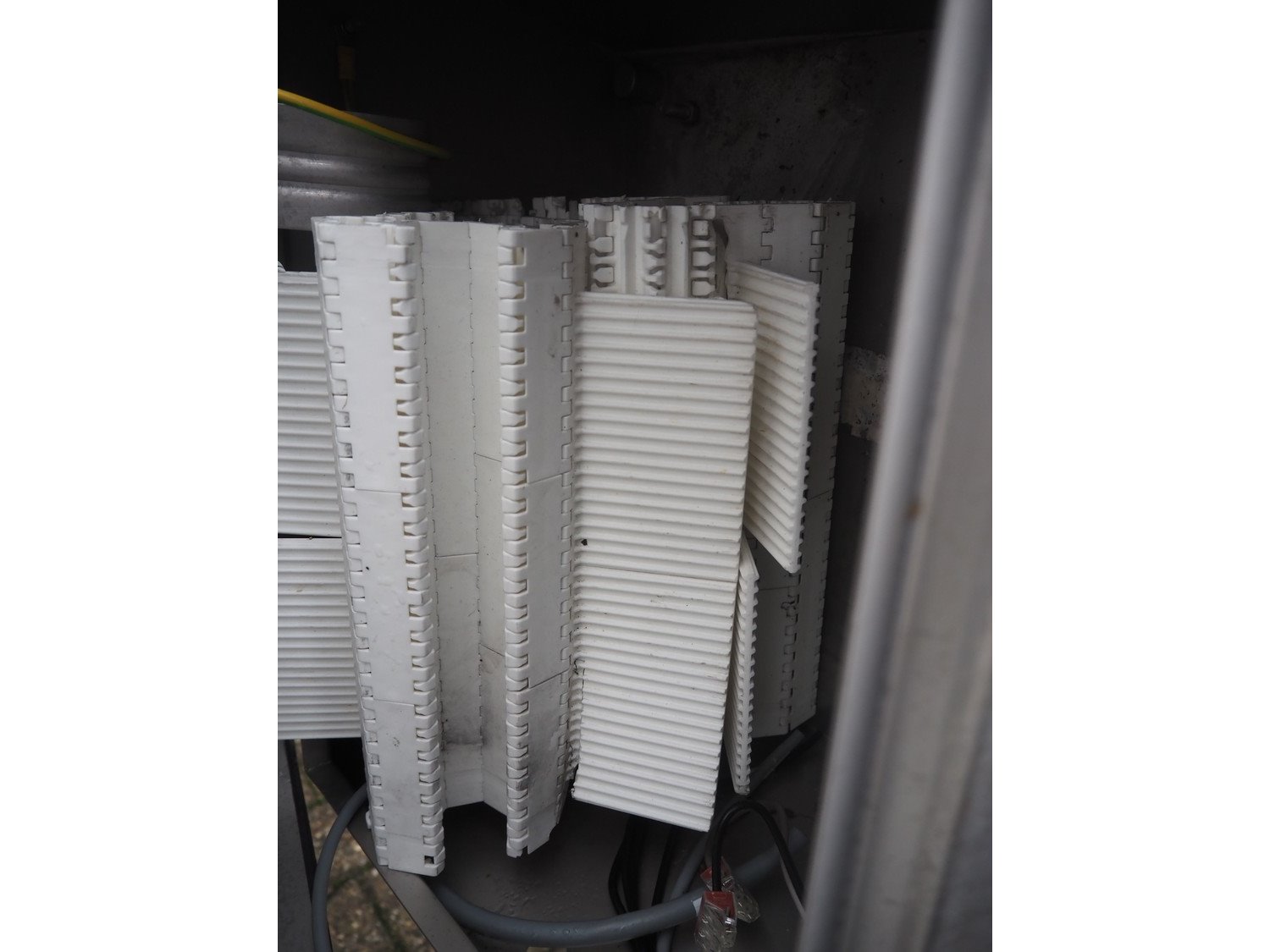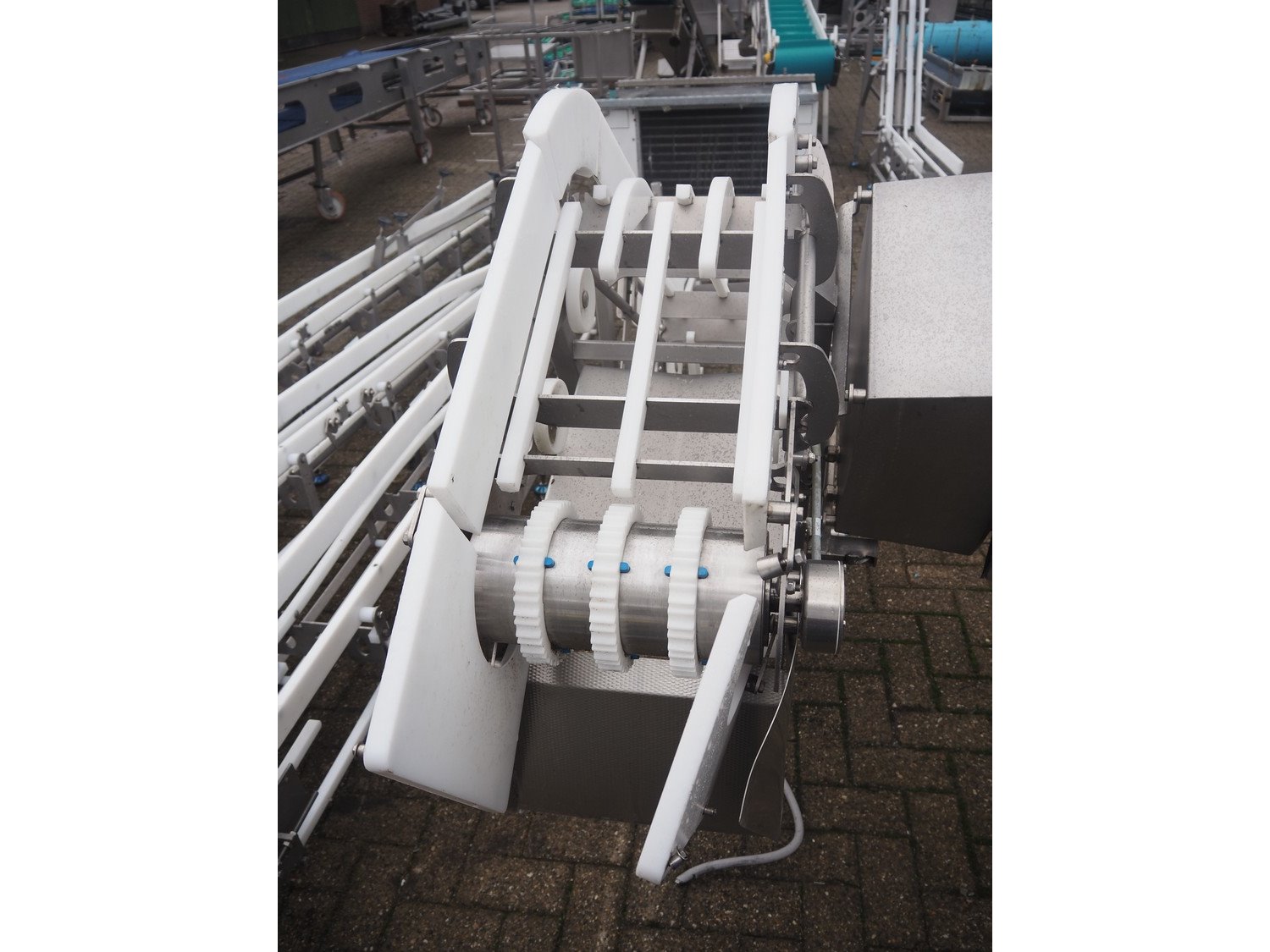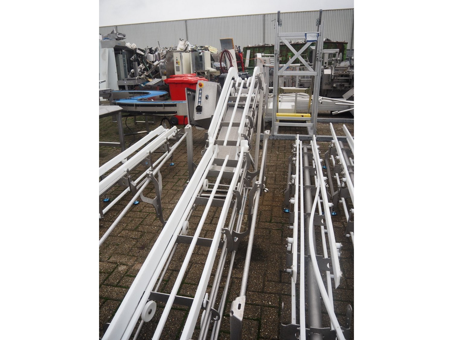Marel s/s frame for elevating belt, model: NR0001, type: Conveyor, serial number: A196178, year of construction: 2019, 200/240 V, 50/60 Hz, 3 A, maximum belt width: 260 mm, total dimensions: 3800 mm x 1000 mm x 1400 mm.