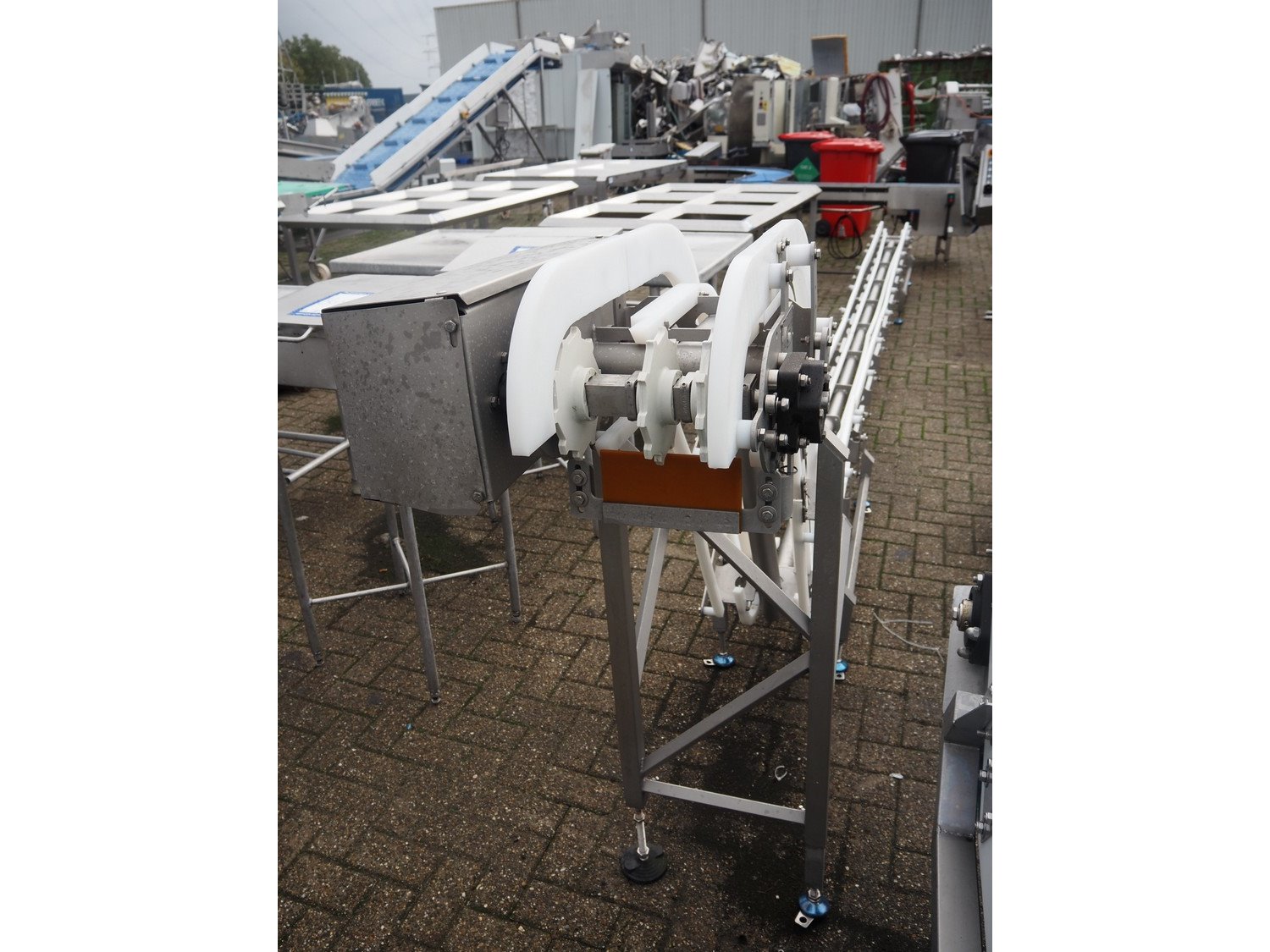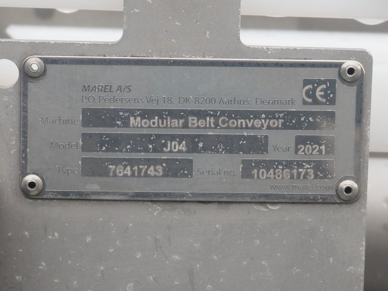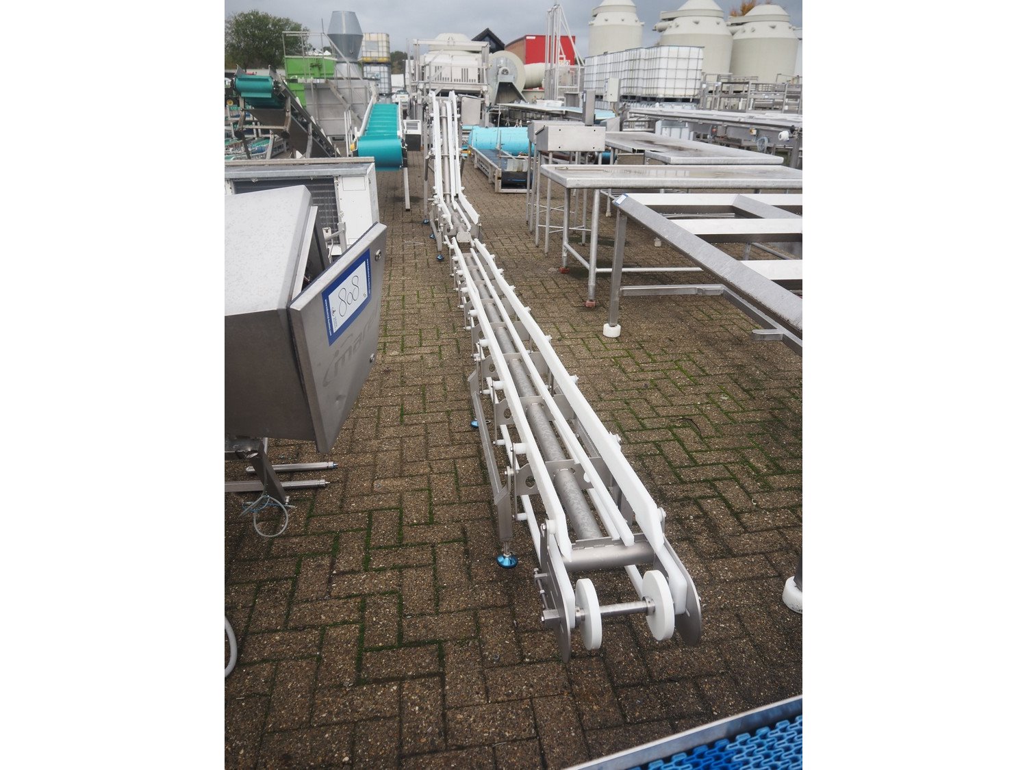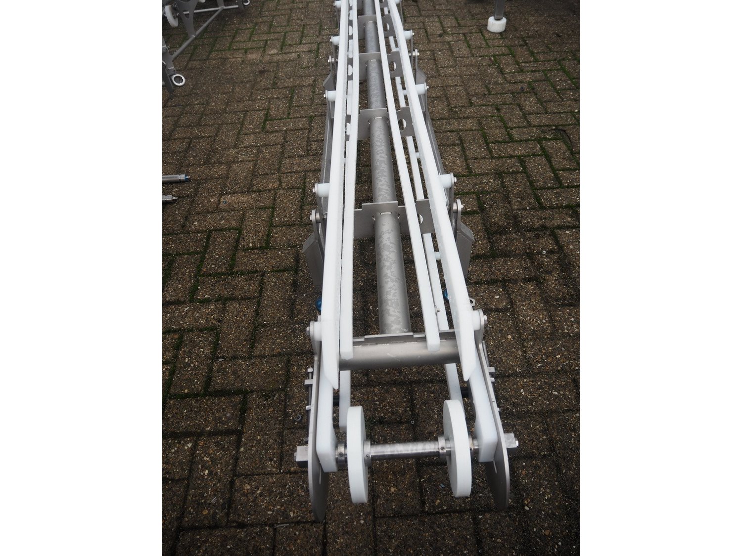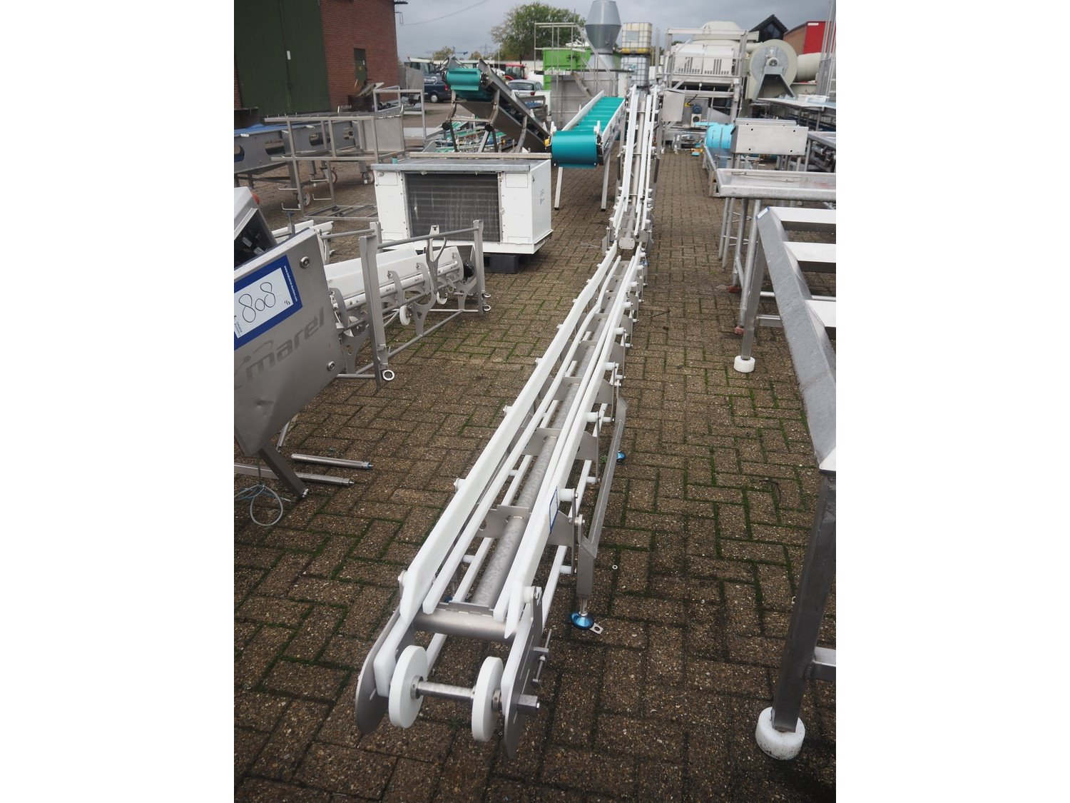 Marel s/s frame for elevating belt, model: J04, type: 7641743, serial number: 10486173, year of construction: 2021, maximum belt width: 300 mm, total dimensions: 6800 mm x 600 mm x 1350 mm.