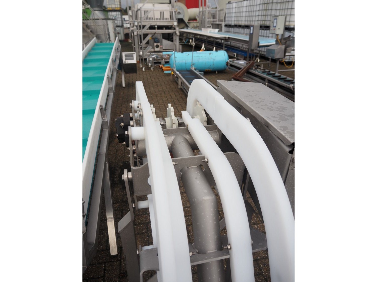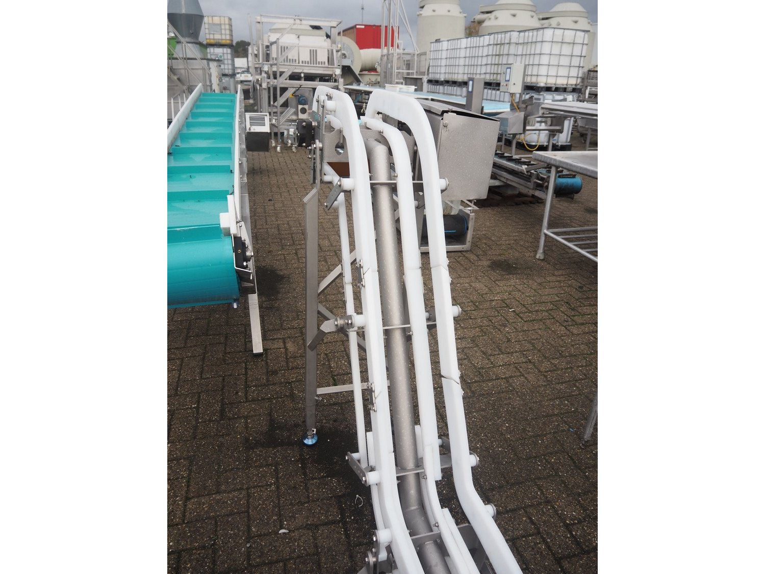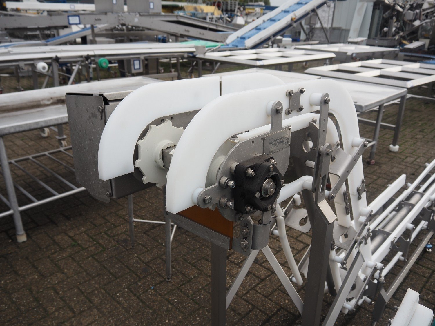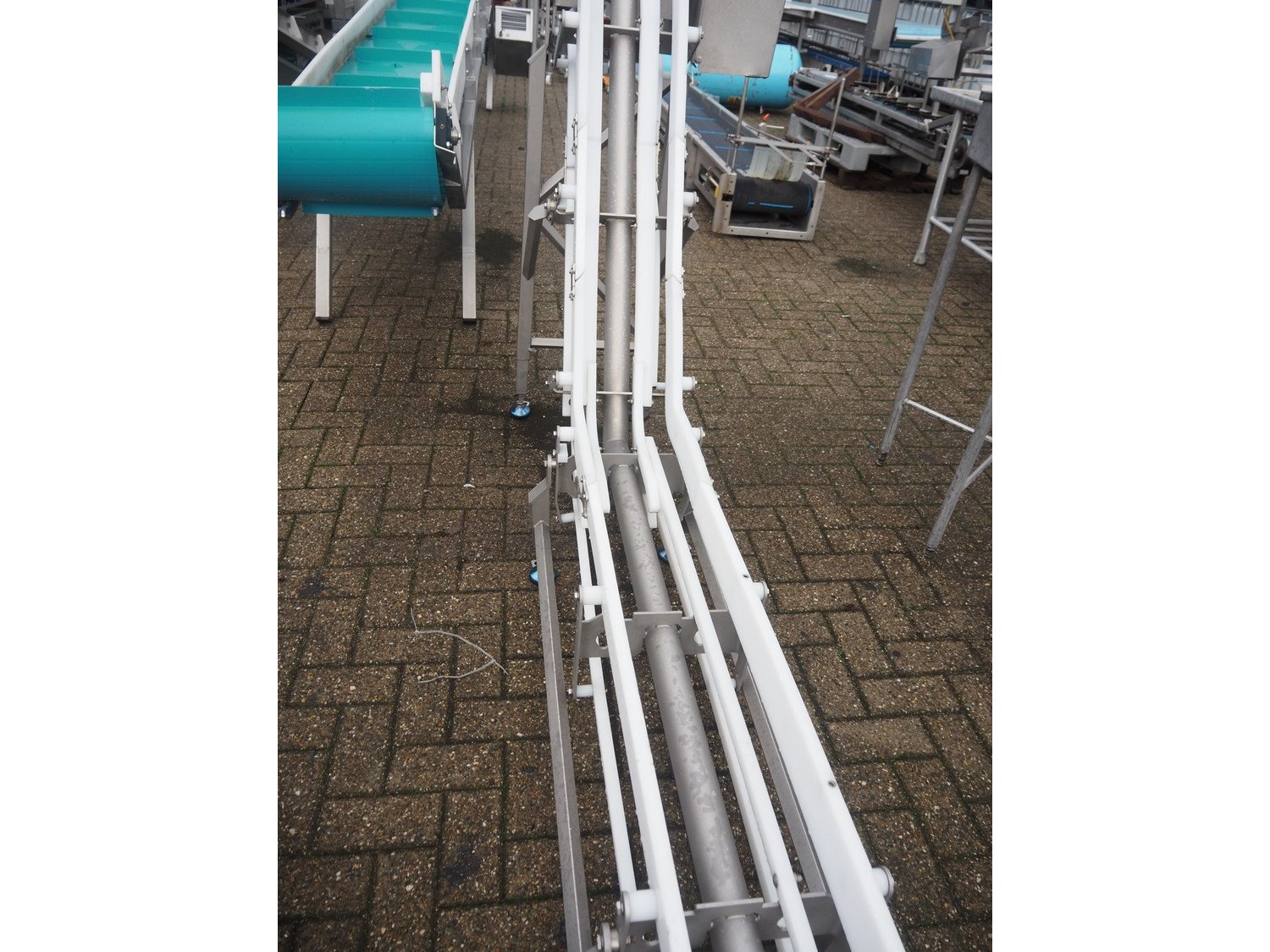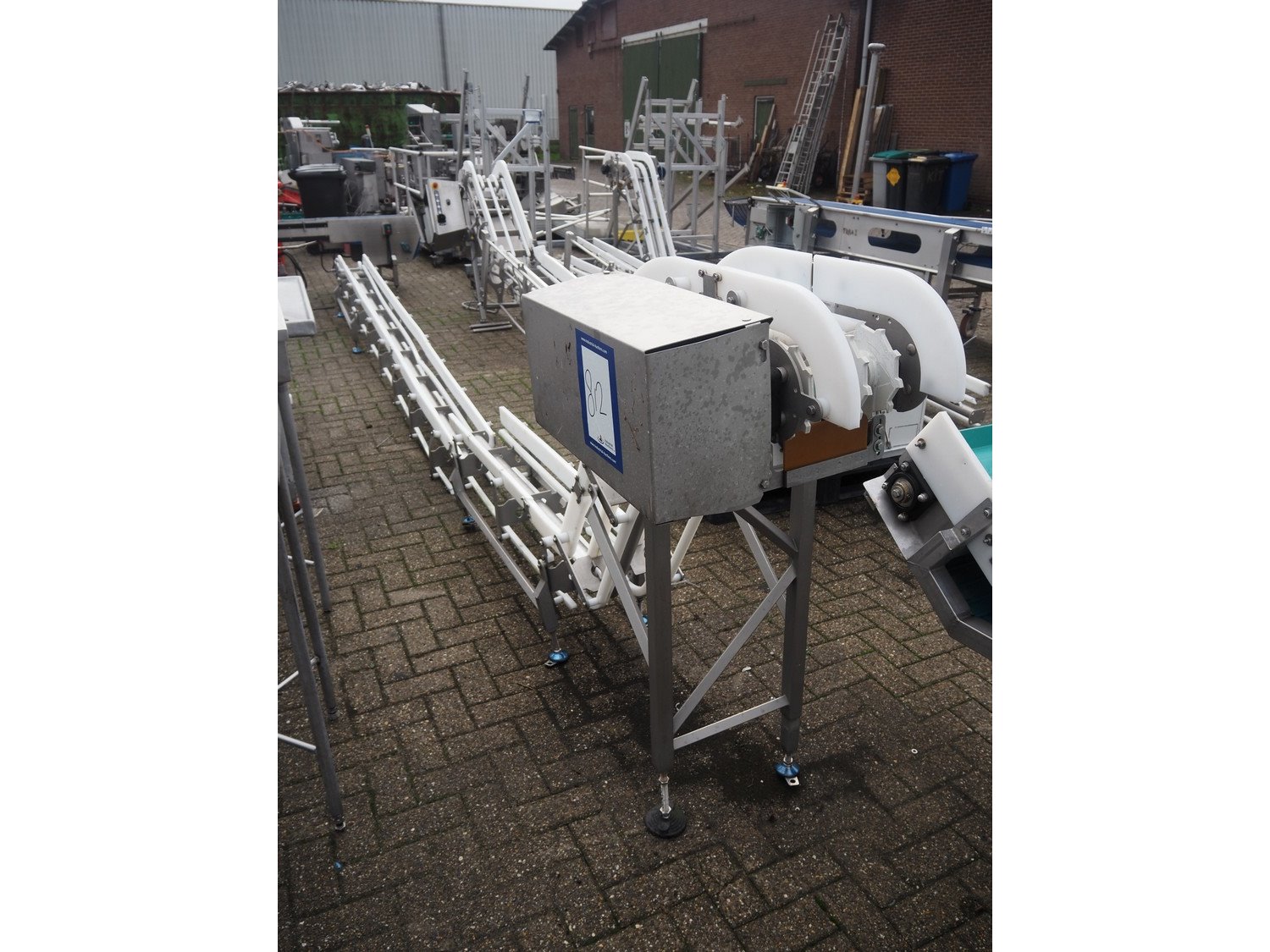 Marel s/s frame for elevating belt, model: J04, type: 7641743, serial number: 10486173, year of construction: 2021, maximum belt width: 300 mm, total dimensions: 6800 mm x 600 mm x 1350 mm.