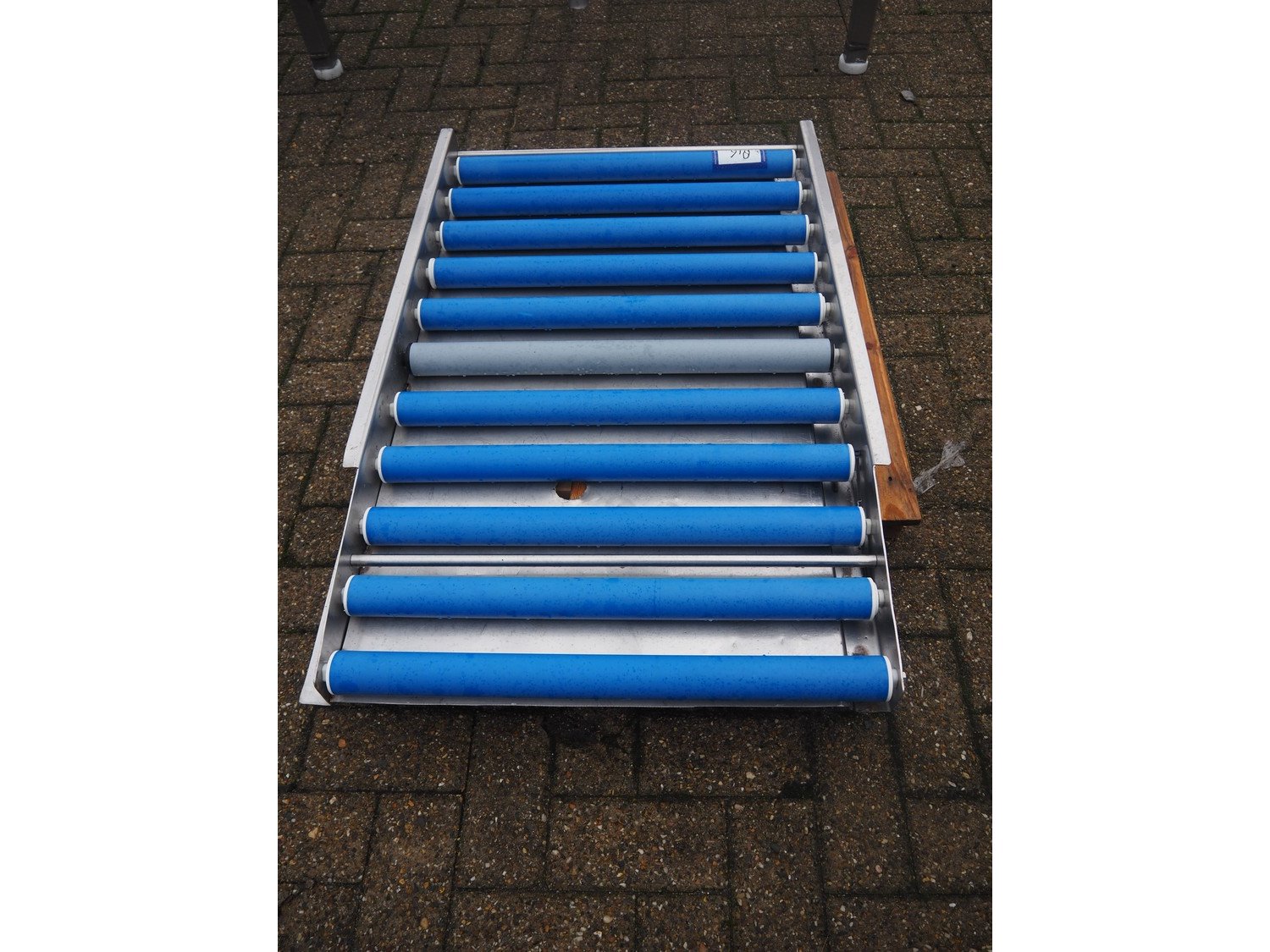Roller conveyor, plastic rollers, roller width: 630 mm, total dimensions: 1100 mm x 700 mm x 80 mm.