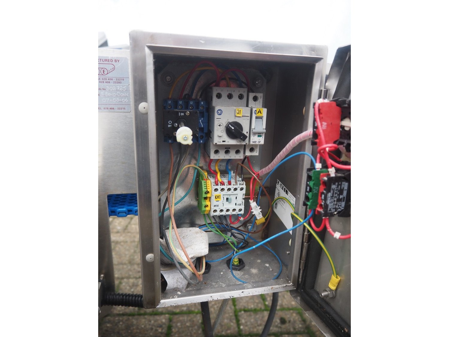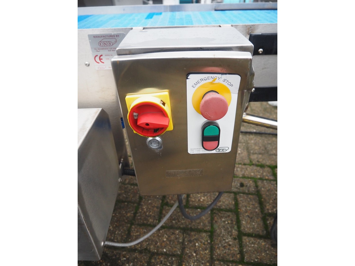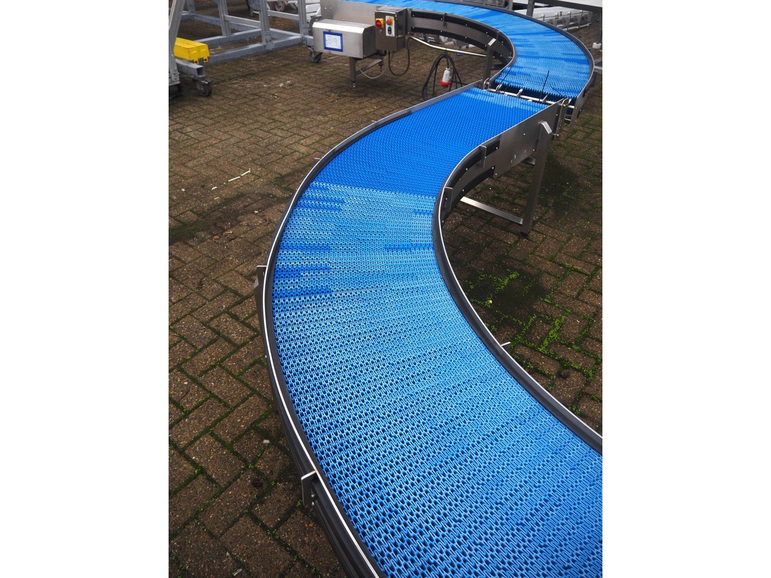 ENE ltd S-shaped conveyor, type: S Bend Conv., serial number: 302725, year of constructions: 2006, s/s frame, plastic mesh belt, belt width: 450 mm, total dimensions: 2850 mm x 1600 mm x 740 mm and 2300 mm x 2500 mm x 740 mm.