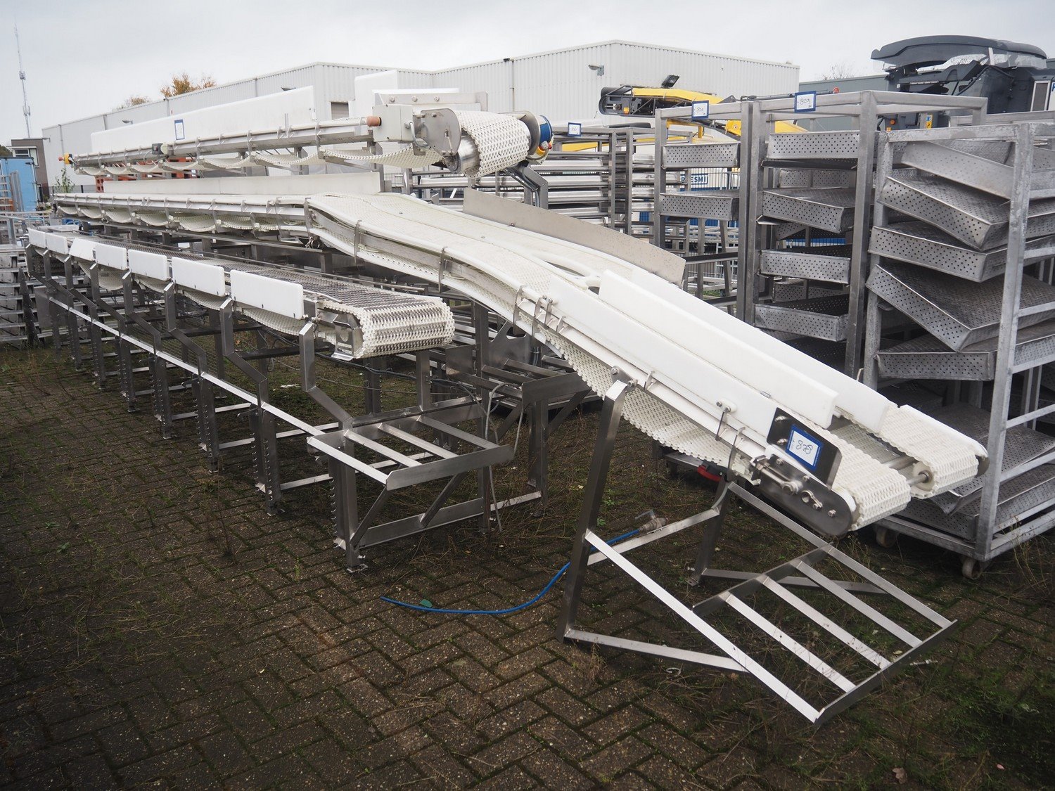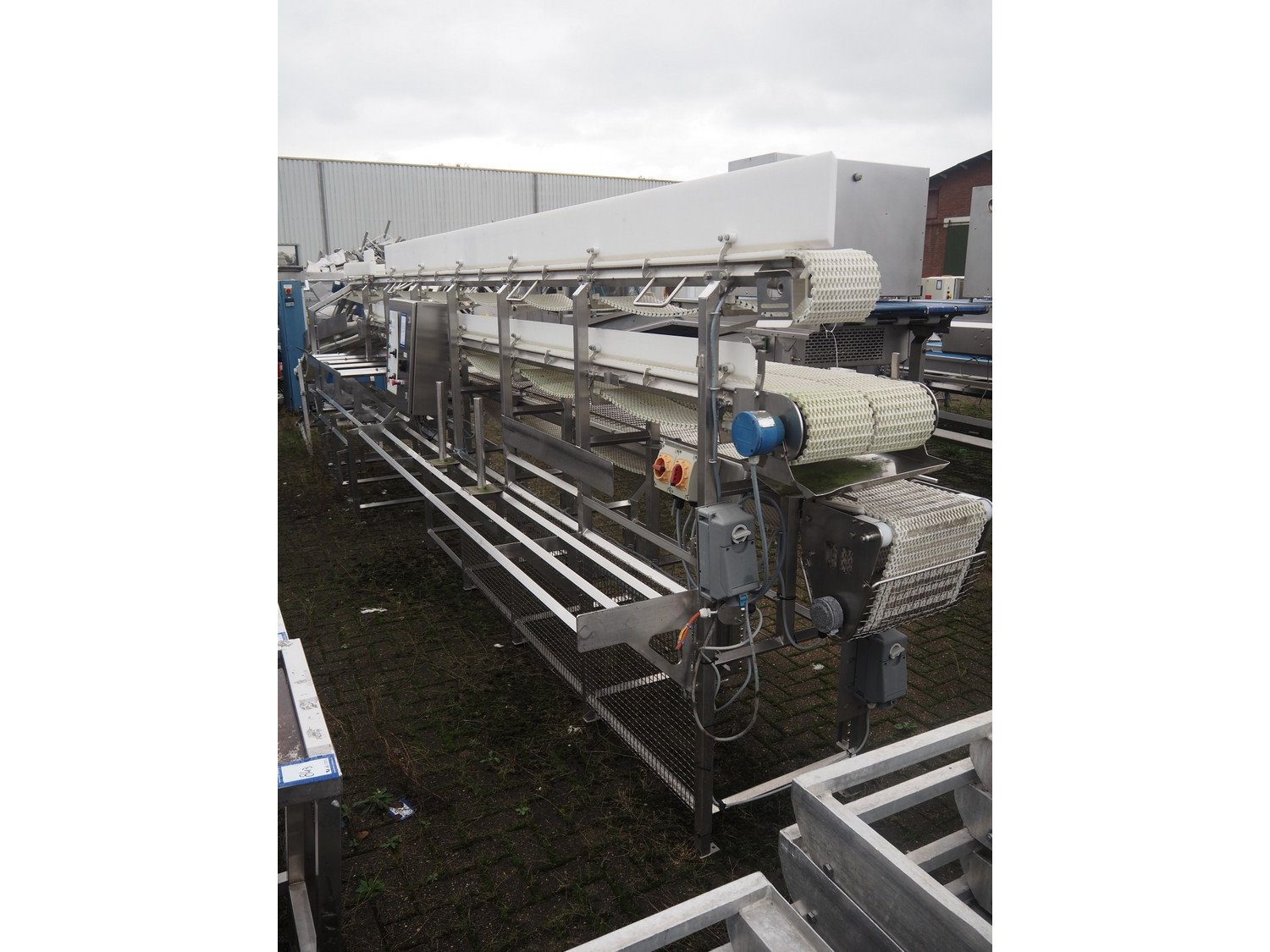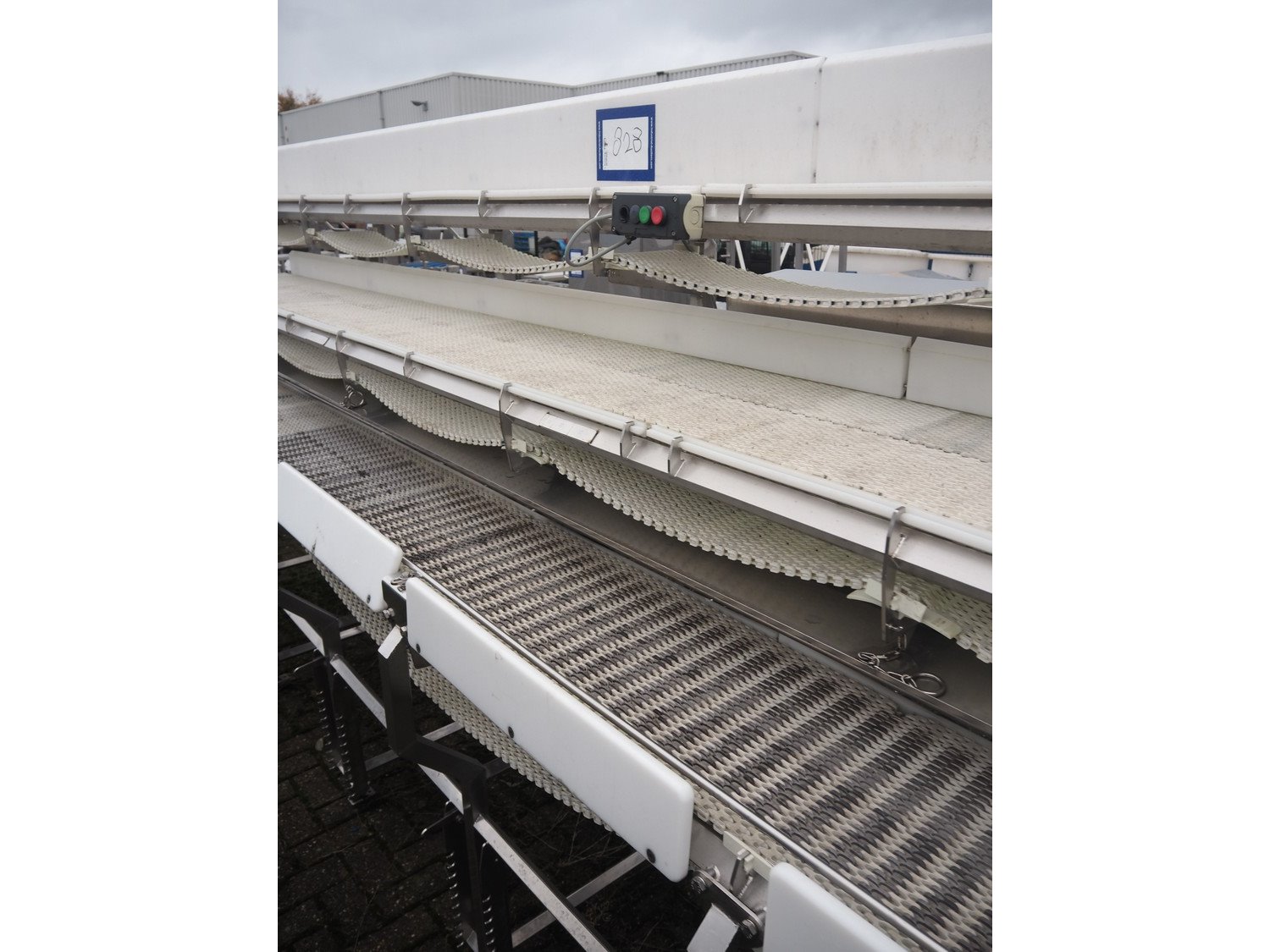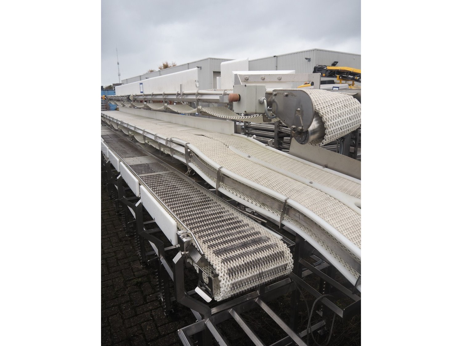 Carnitech 3-lane sorting belt, s/s frame, type: PM45 number: CN24440.00, year of construction: 2005, 4 plastic mesh belts, belt width: (1x) 350 mm, (2x) 200 mm, (1x) 200 mm, 7 places for ergo steps, total dimensions: 8000 mm x 1250 mm x 1950 mm.