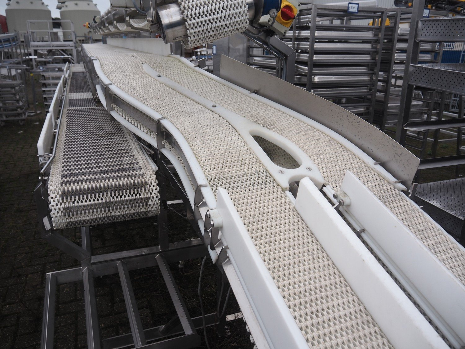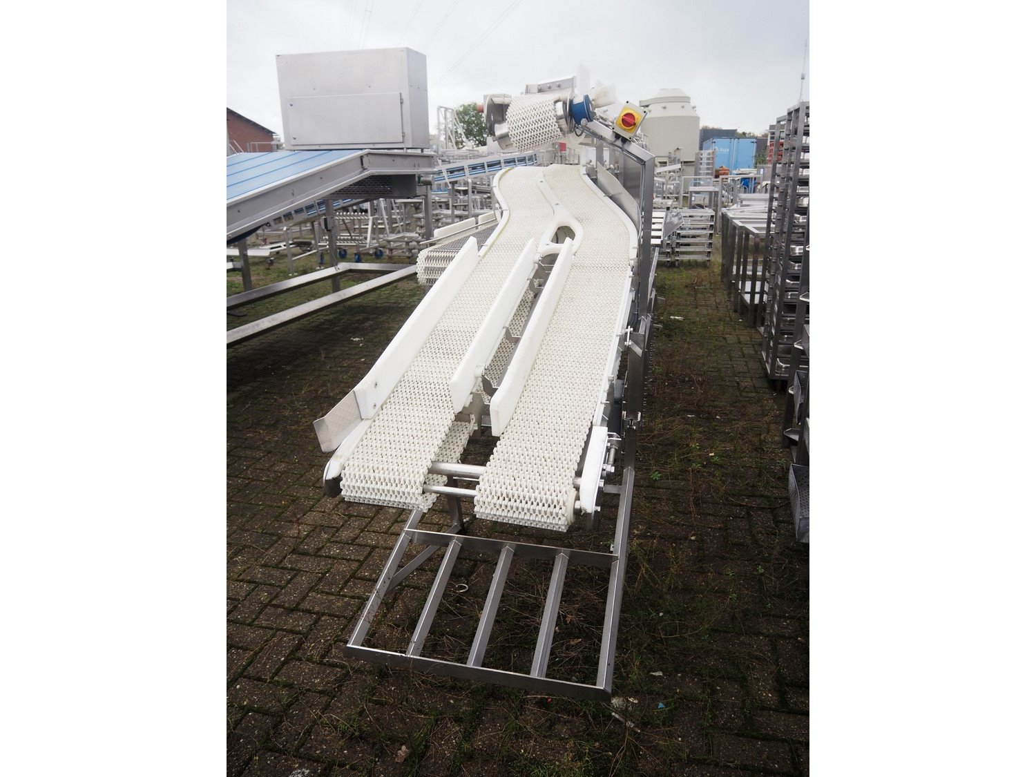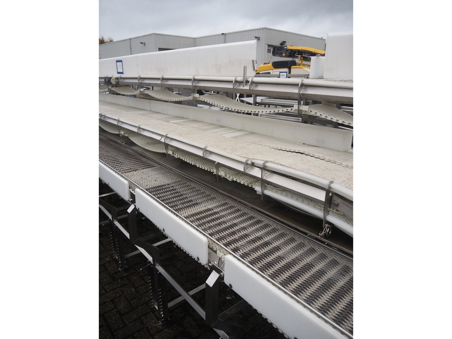 Carnitech 3-lane sorting belt, s/s frame, type: PM45 number: CN24440.00, year of construction: 2005, 4 plastic mesh belts, belt width: (1x) 350 mm, (2x) 200 mm, (1x) 200 mm, 7 places for ergo steps, total dimensions: 8000 mm x 1250 mm x 1950 mm.