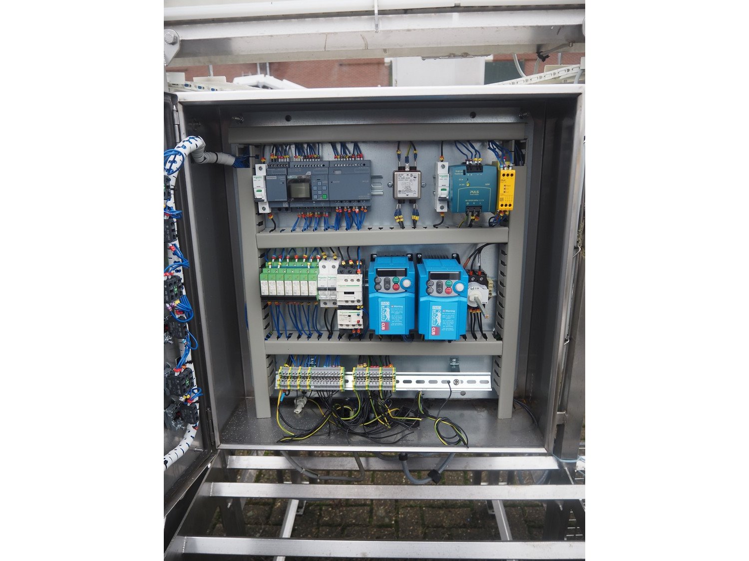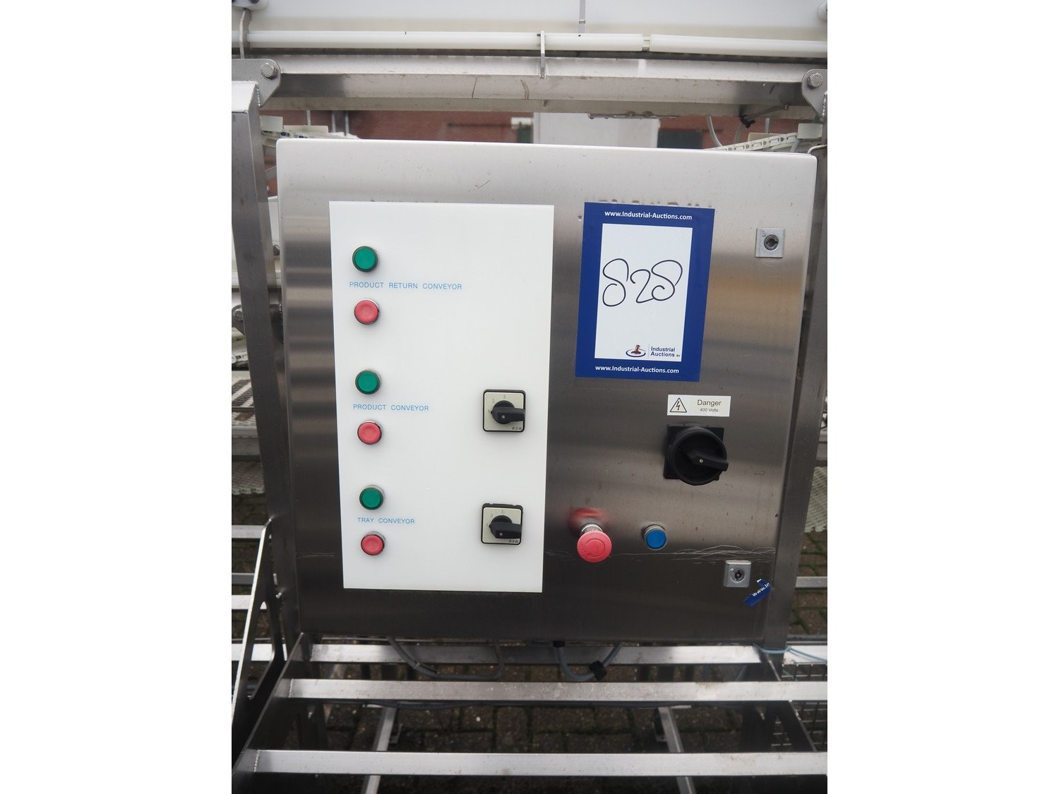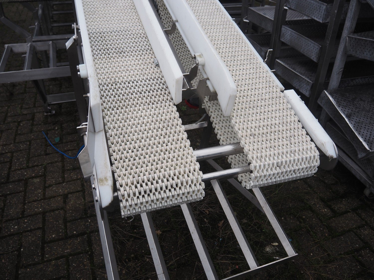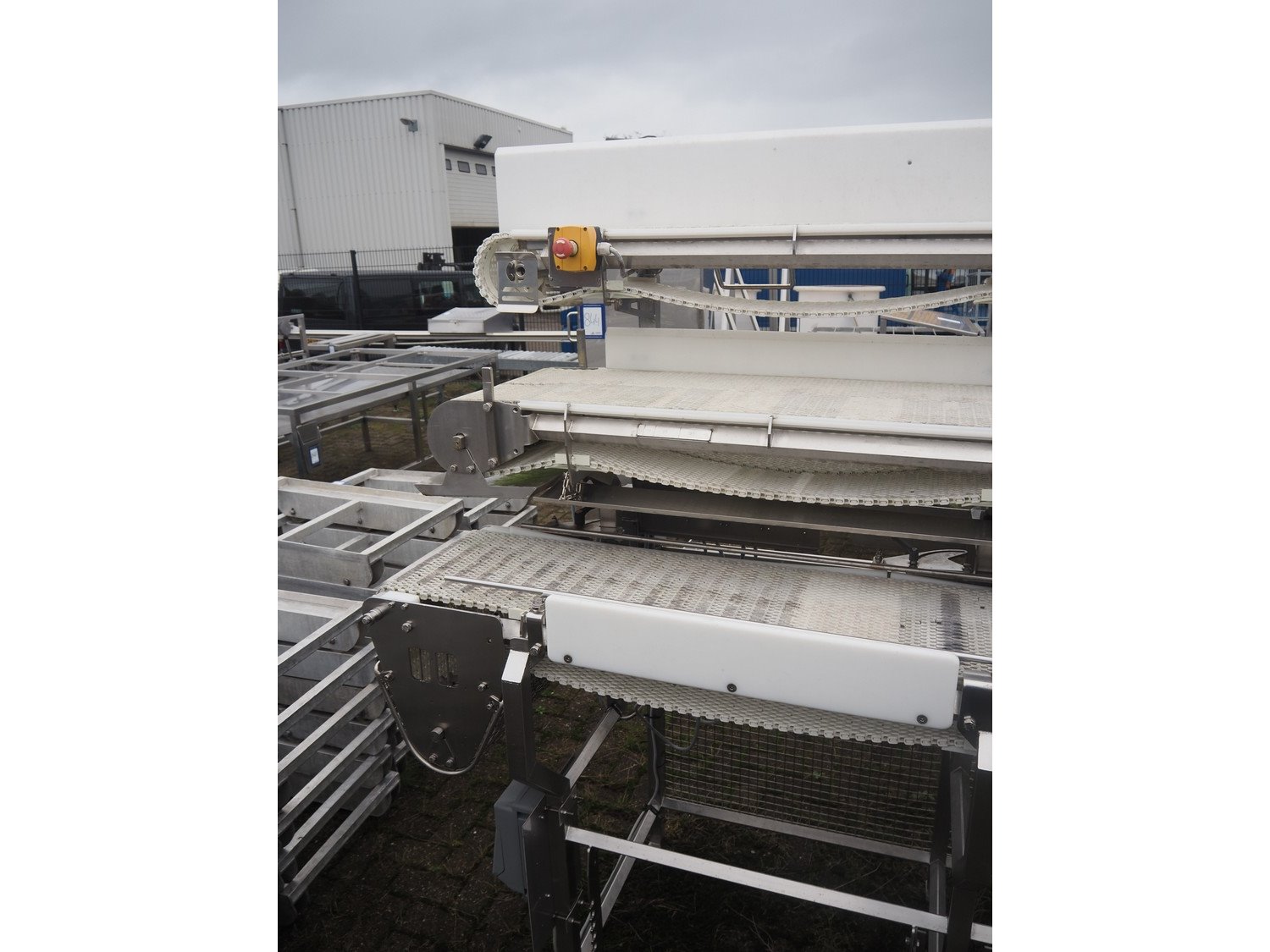 Carnitech 3-lane sorting belt, s/s frame, type: PM45 number: CN24440.00, year of construction: 2005, 4 plastic mesh belts, belt width: (1x) 350 mm, (2x) 200 mm, (1x) 200 mm, 7 places for ergo steps, total dimensions: 8000 mm x 1250 mm x 1950 mm.