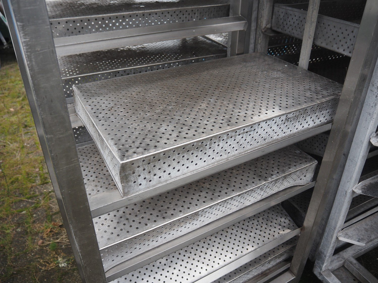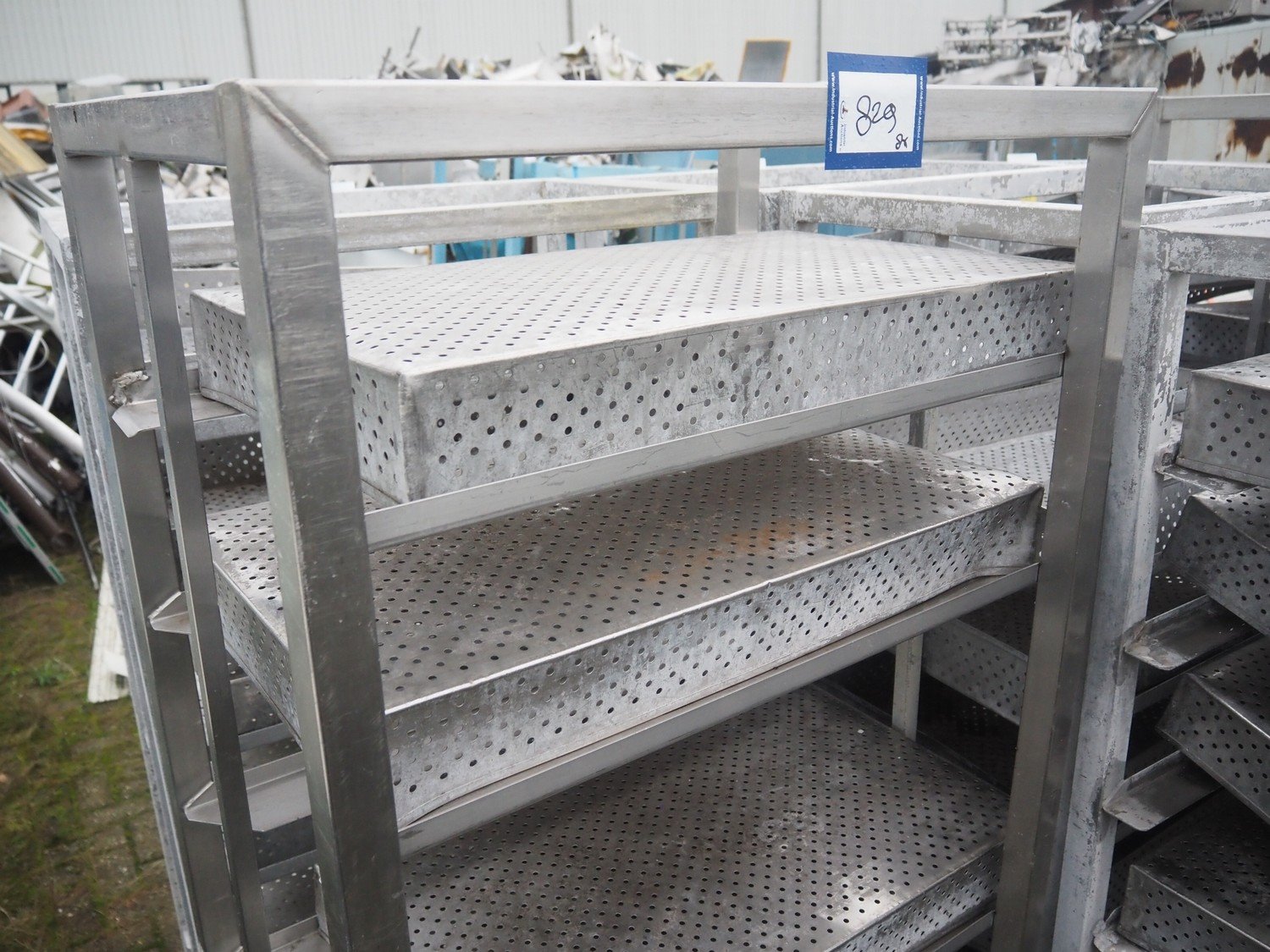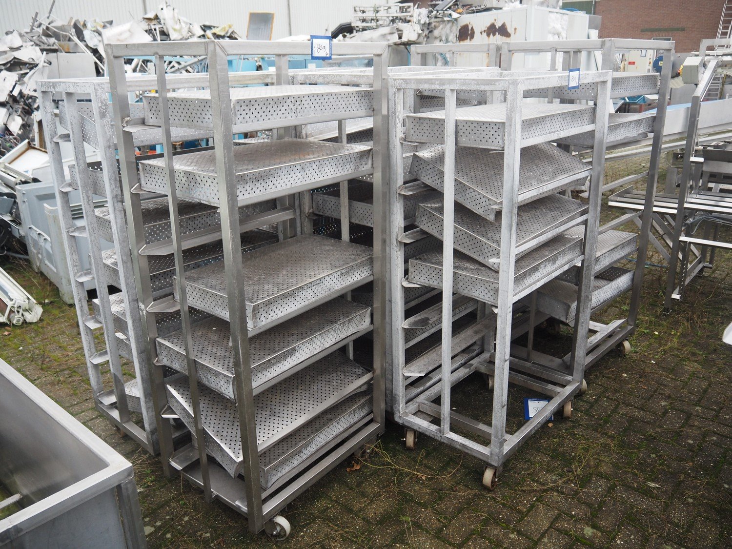8 s/s trolleys with large amount of s/s bins with drains, diameter drains: 6 mm, dimensions bins: 750 mm x 440 mm x 100 mm, dimensions trolleys: (5x) 550 mm x 820 mm x 1660 mm and (3x) 550 mm x 820 mm x 1780 mm.