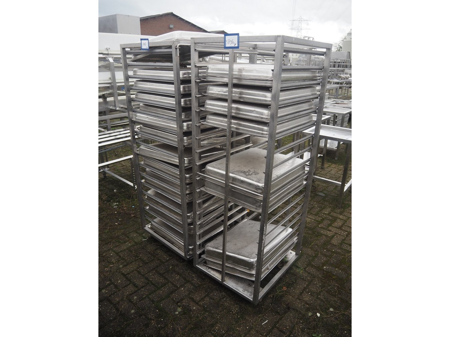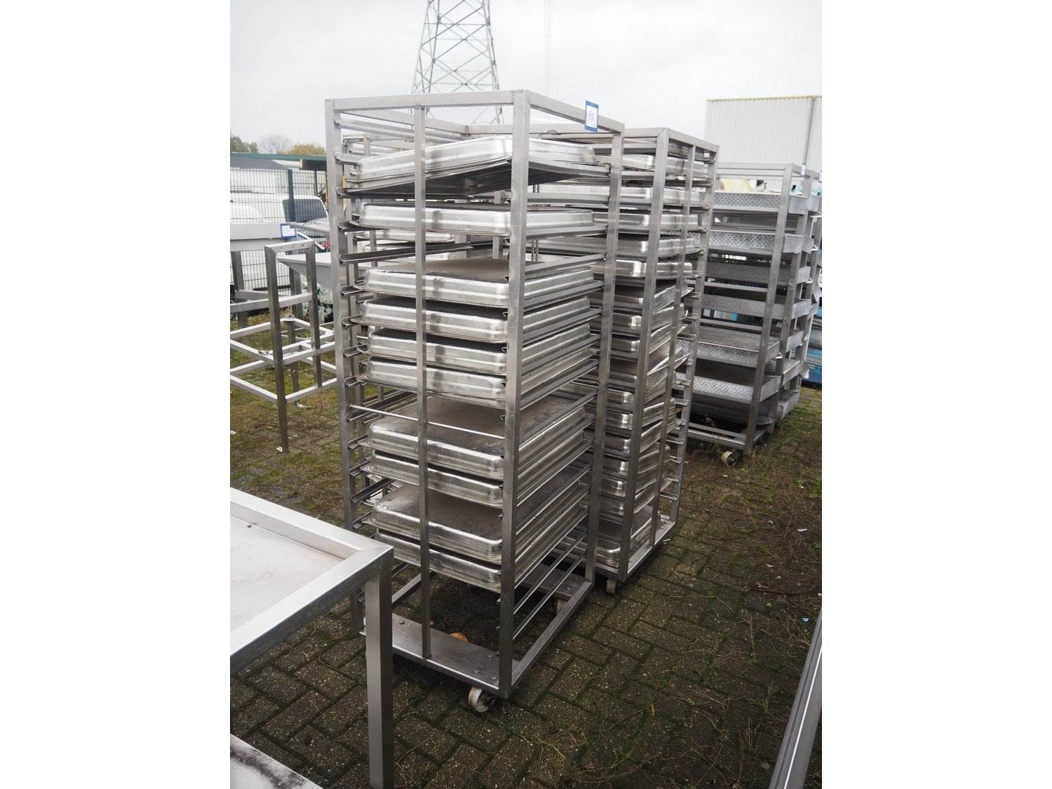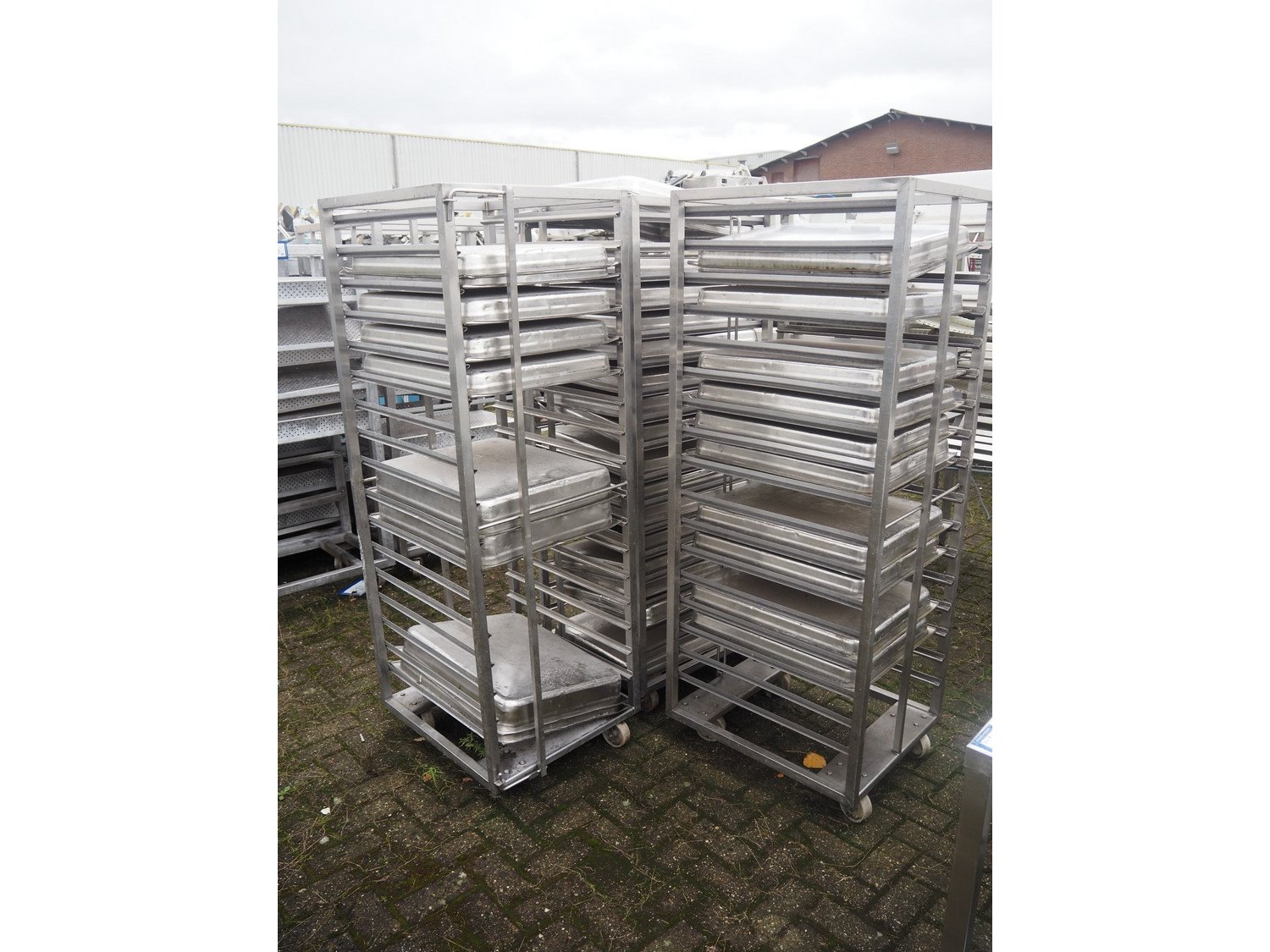 3 s/s trolleys with 28 s/s bins, dimensions bins: (28x) 520 mm x 640 mm x 65 mm, dimensions trolleys: (3x) 600 mm x 720 mm x 1780 mm.