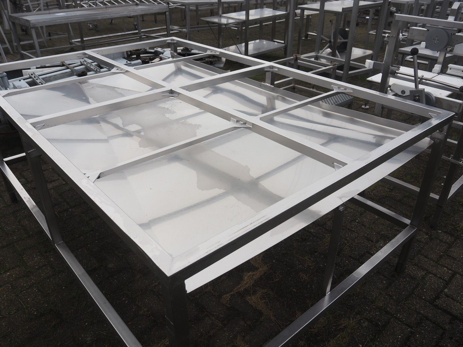 S/s table with dip tray, dimensions: 2320 mm x 1450 mm x 910 mm.