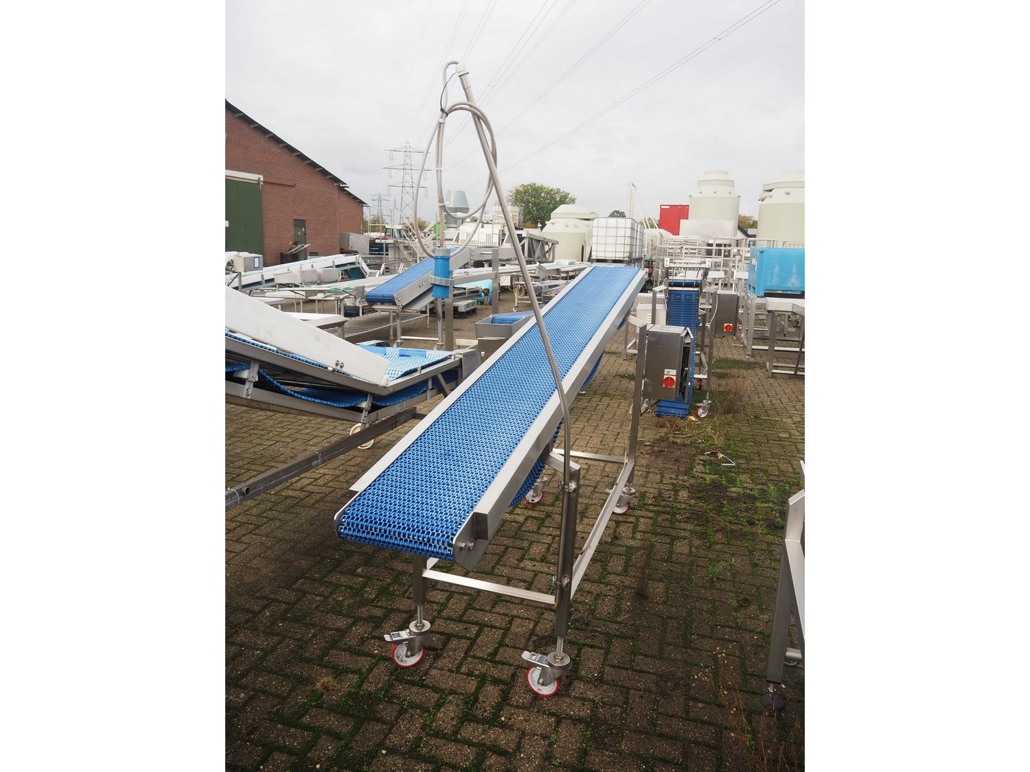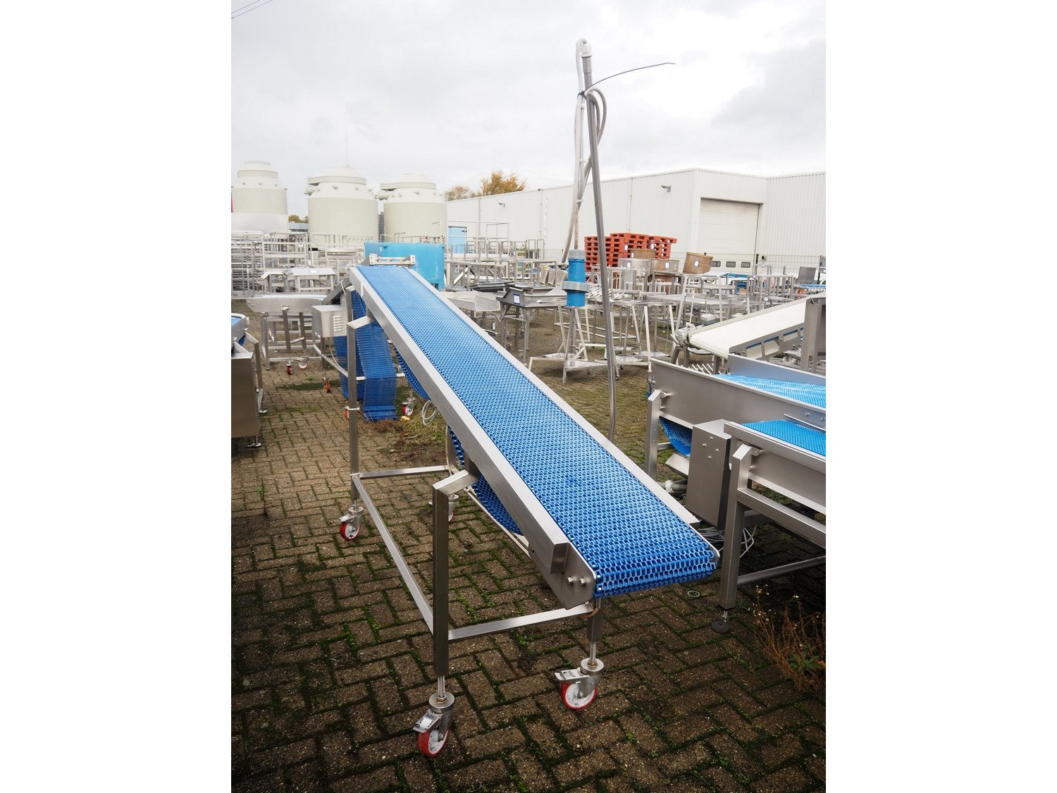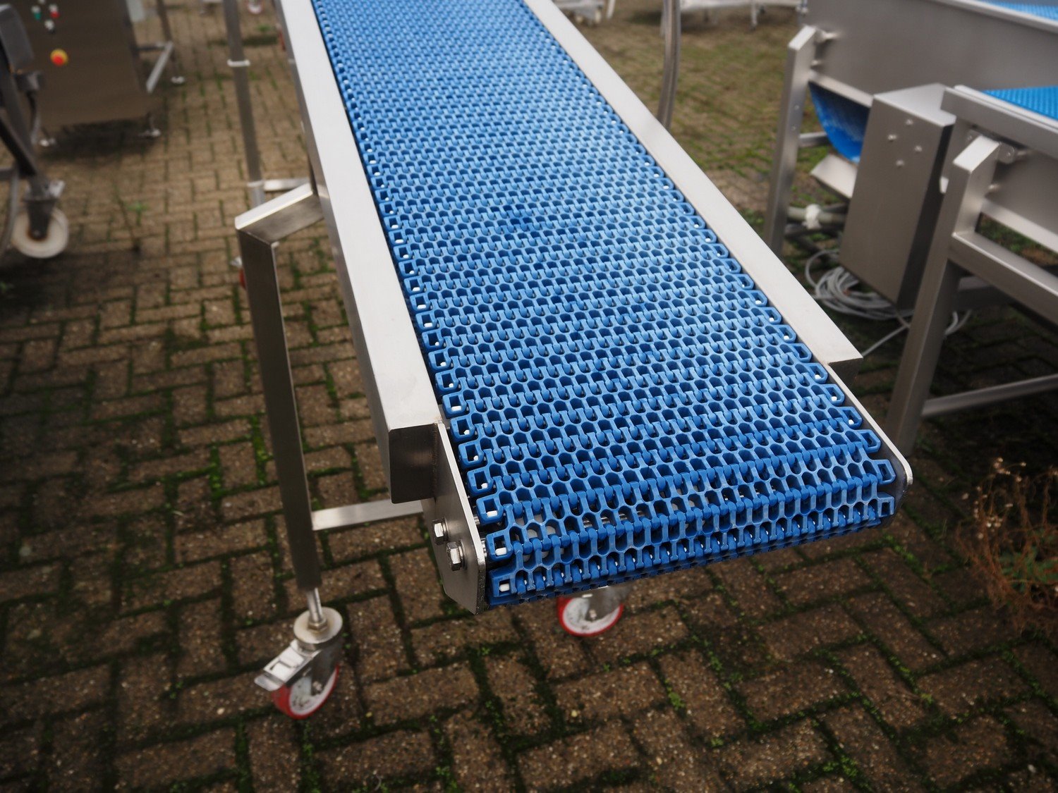 L.A.C. Conveyor Systems mobile elevating belt, s/s frame, plastic mesh belt, belt width: 300 mm, elevating height: 1460 mm, total dimensions: 3200 mm x 800 mm x 1500 mm.