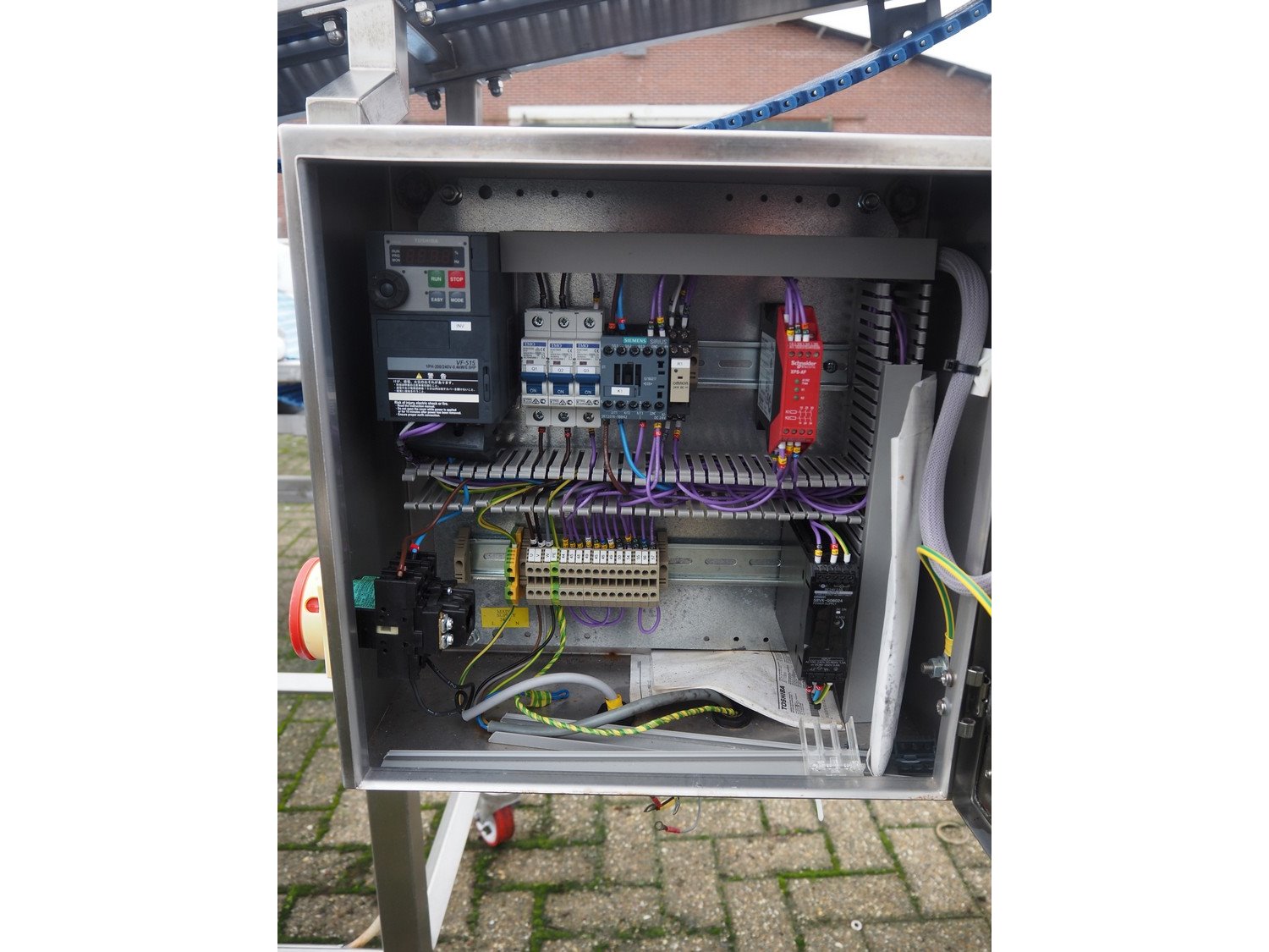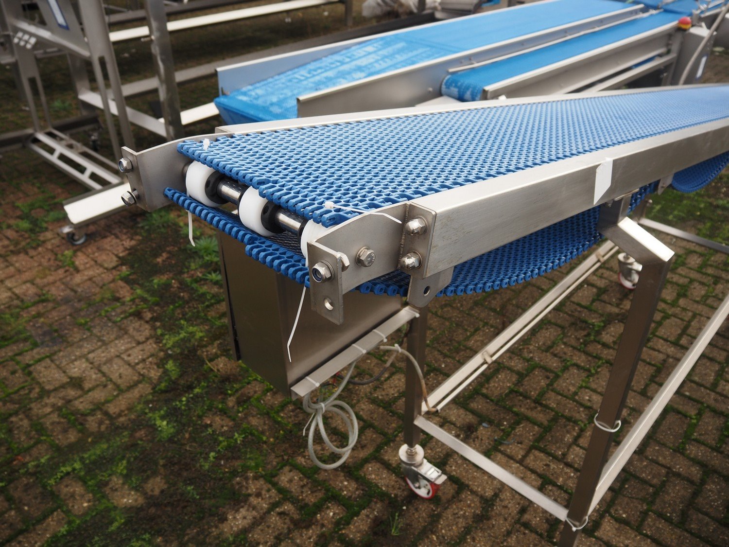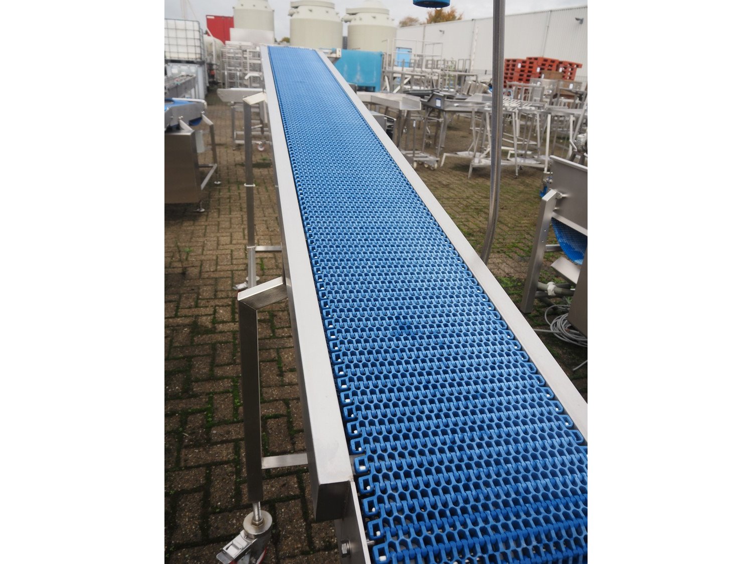 L.A.C. Conveyor Systems mobile elevating belt, s/s frame, plastic mesh belt, belt width: 300 mm, elevating height: 1460 mm, total dimensions: 3200 mm x 800 mm x 1500 mm.
