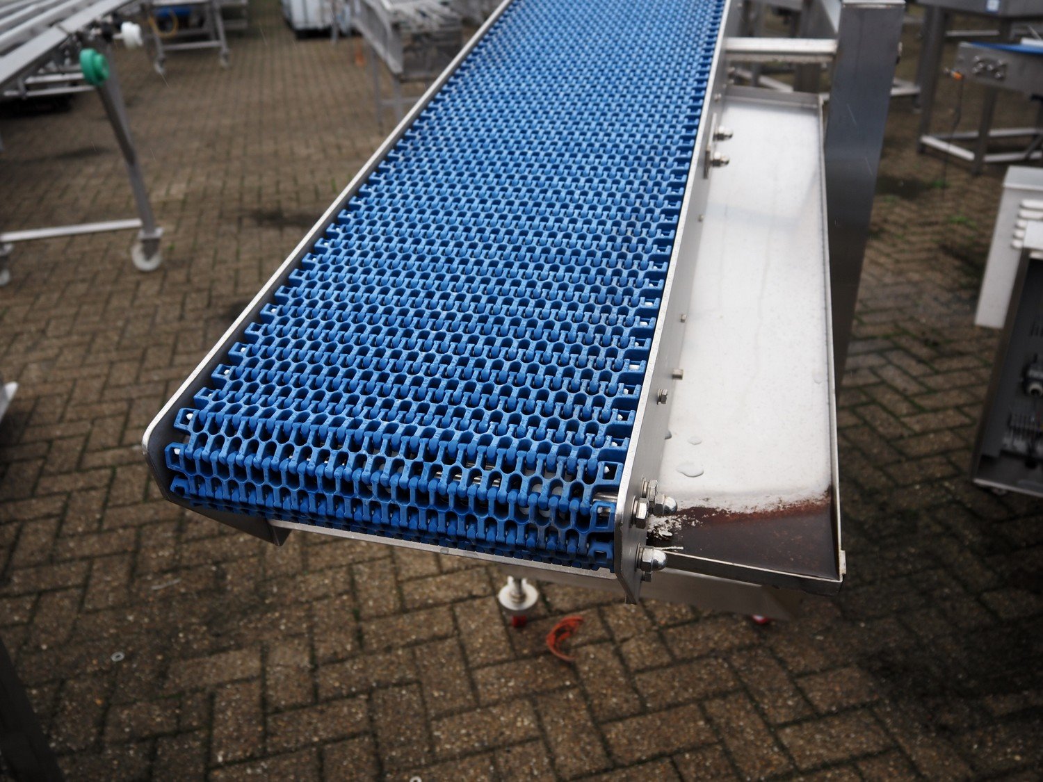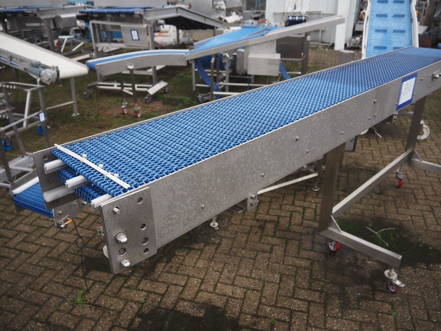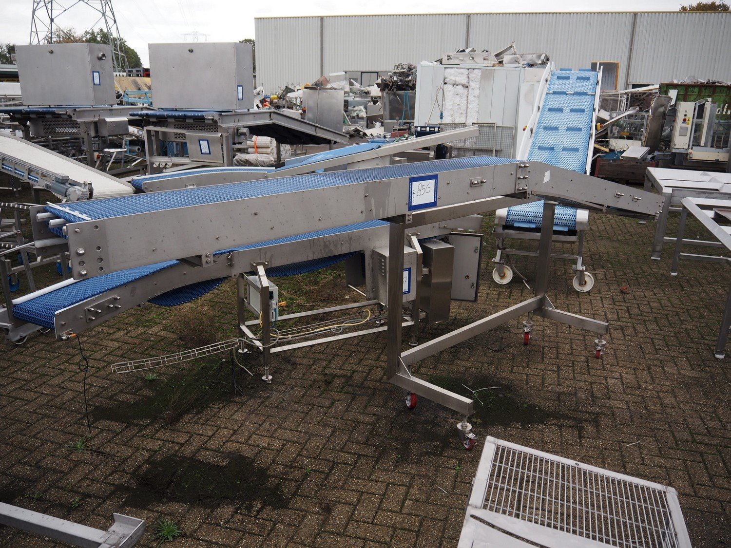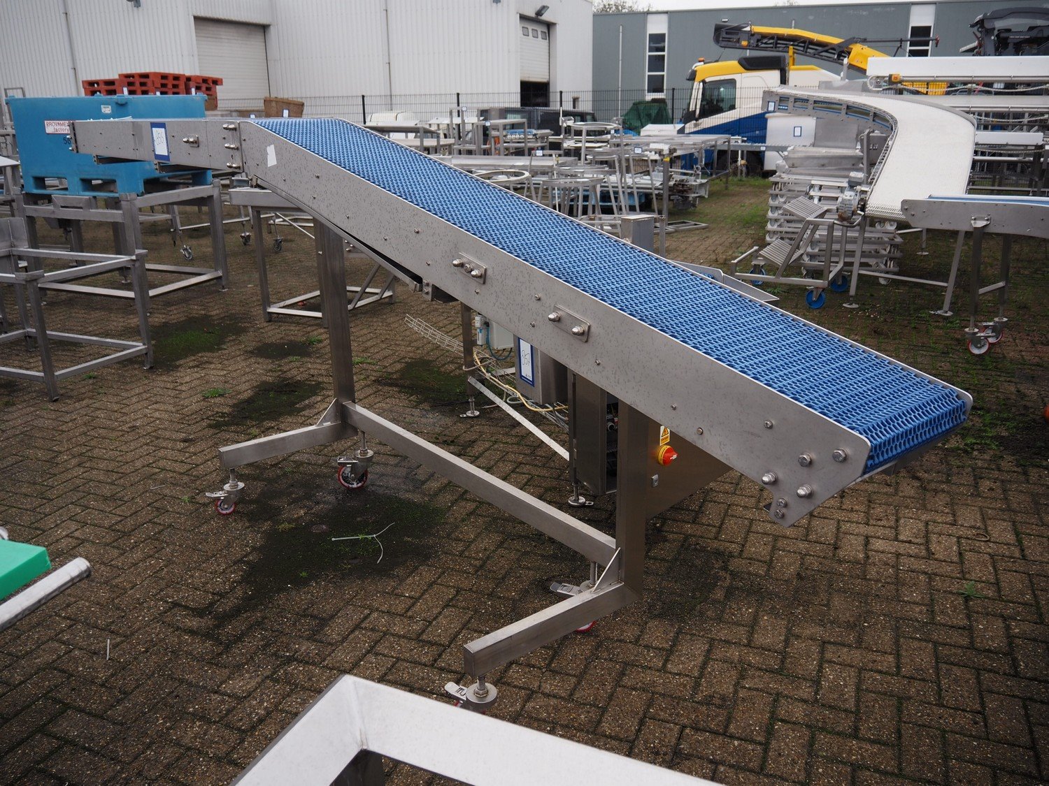 L.A.C. Conveyor Systems mobile elevating belt, s/s frame, plastic mesh belt, belt width: 300 mm, elevating height: 1520 mm, total dimensions: 4500 mm x 600 mm x 1550 mm. Incomplete.