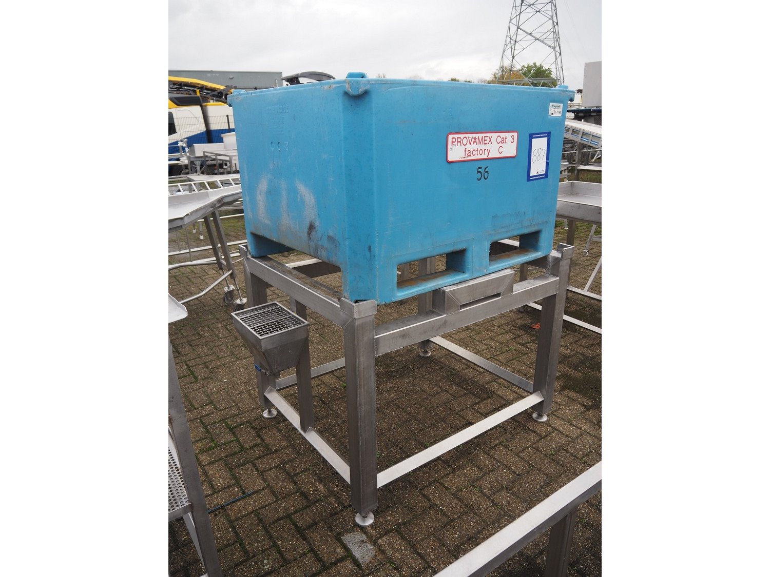 S/s frame with plastic pallet box, frame dimensions: 1250 mm x 1050 mm x 960 mm, pallet box dimensions: 1200 mm x 1000 mm x 750 mm.