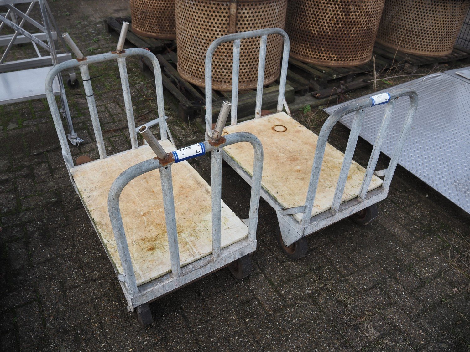 2 steel trolleys, dimensions: (1x) 960 mm x 560 mm x 840 mm, (1x) 960 mm x 560 mm x 960 mm.