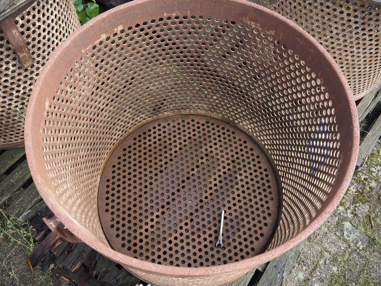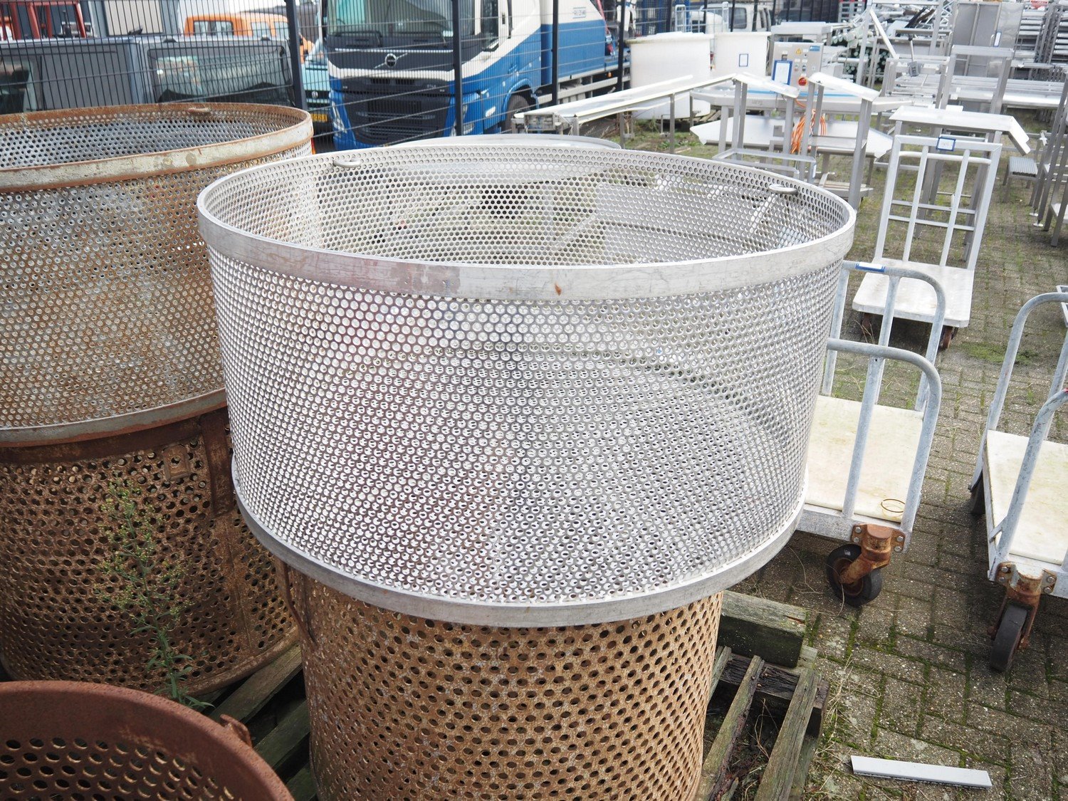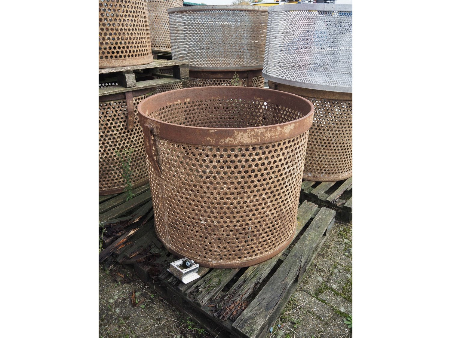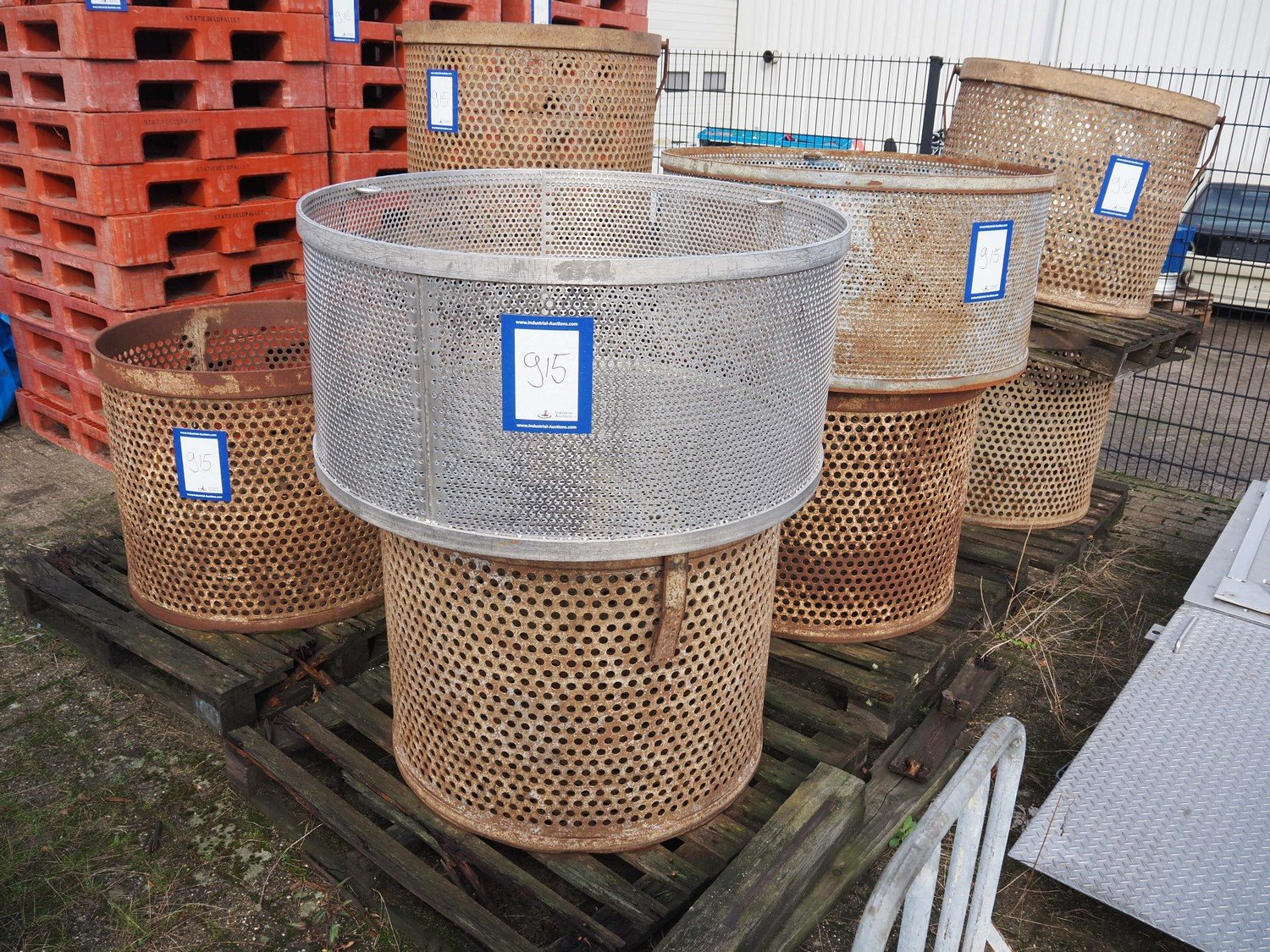 10 steel round autoclave baskets, diameter: (2x) 1070 mm / height: (2x) 500 mm and diameter: (8x) 900 mm / height: (8x) 750 mm.
