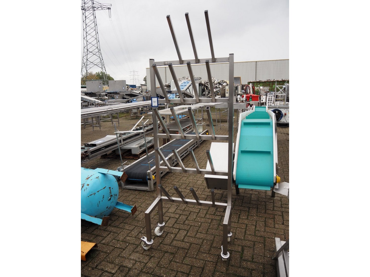 S/s mobile boot rack, 10 pairs, dimensions: 800 mm x 370 mm x 2200 mm. 1 peg is missing.