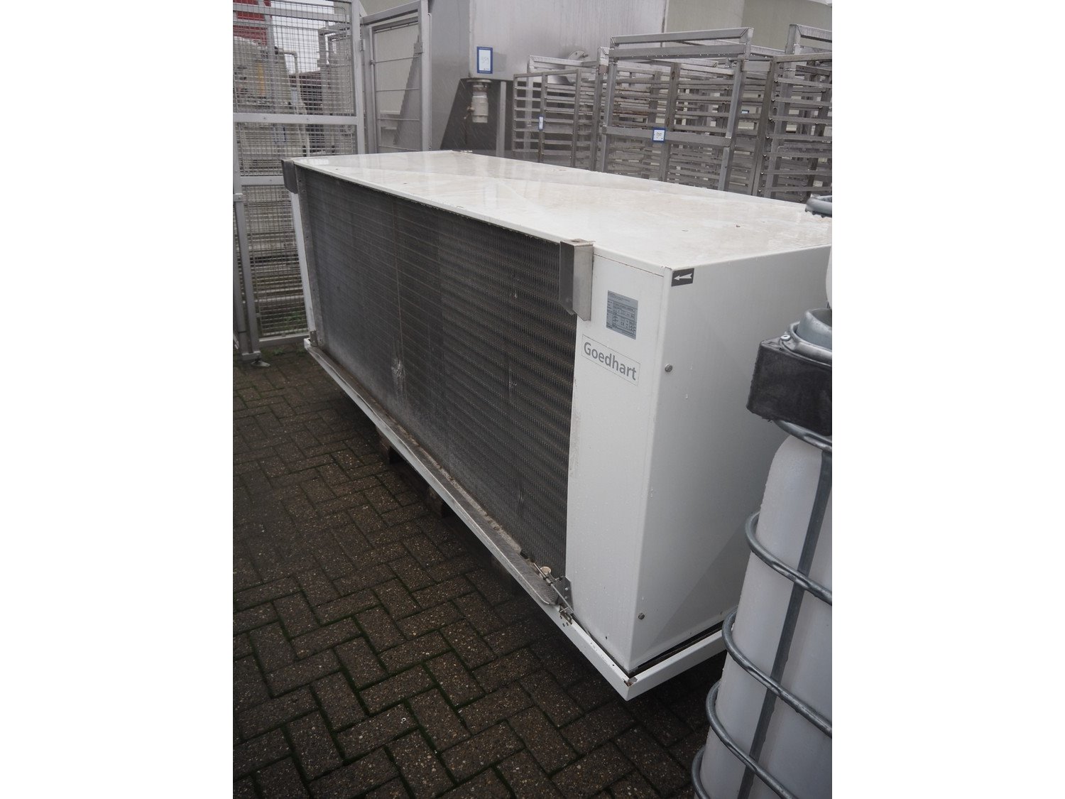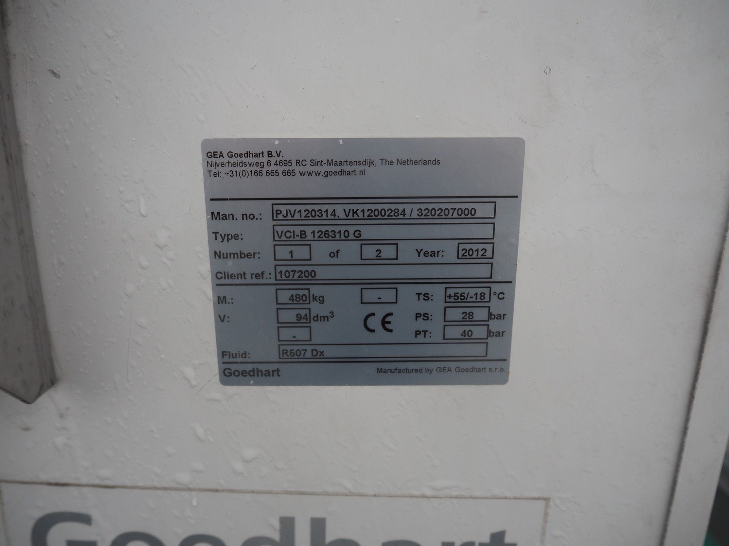 GEA Goedhart evaporator, 2 fans, type: VCI-B 126310 G, manufacturing number: PJV120314, VK1200284/320207000, year of construction: 2012, volume: 94 dm³, PS: 28 bar, TS: +55/-18 °C, PT: 40 bar, refrigerant: R507 Dx, dimensions: 2900 mm x 1050 mm x 1100 mm.