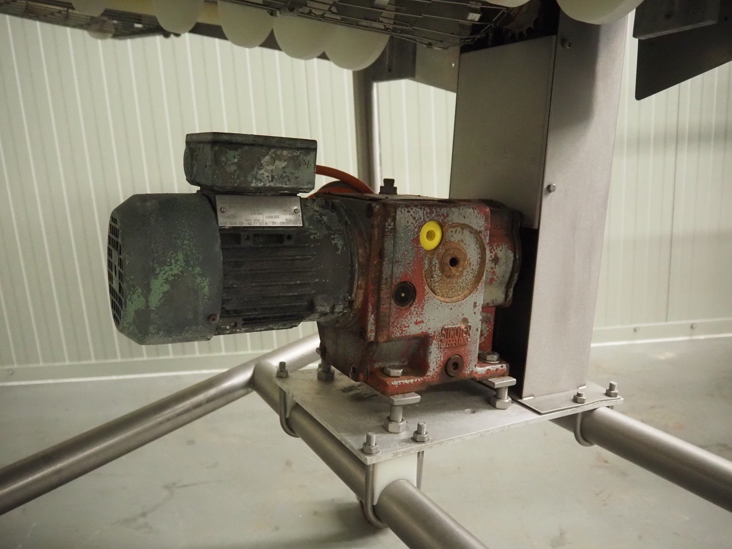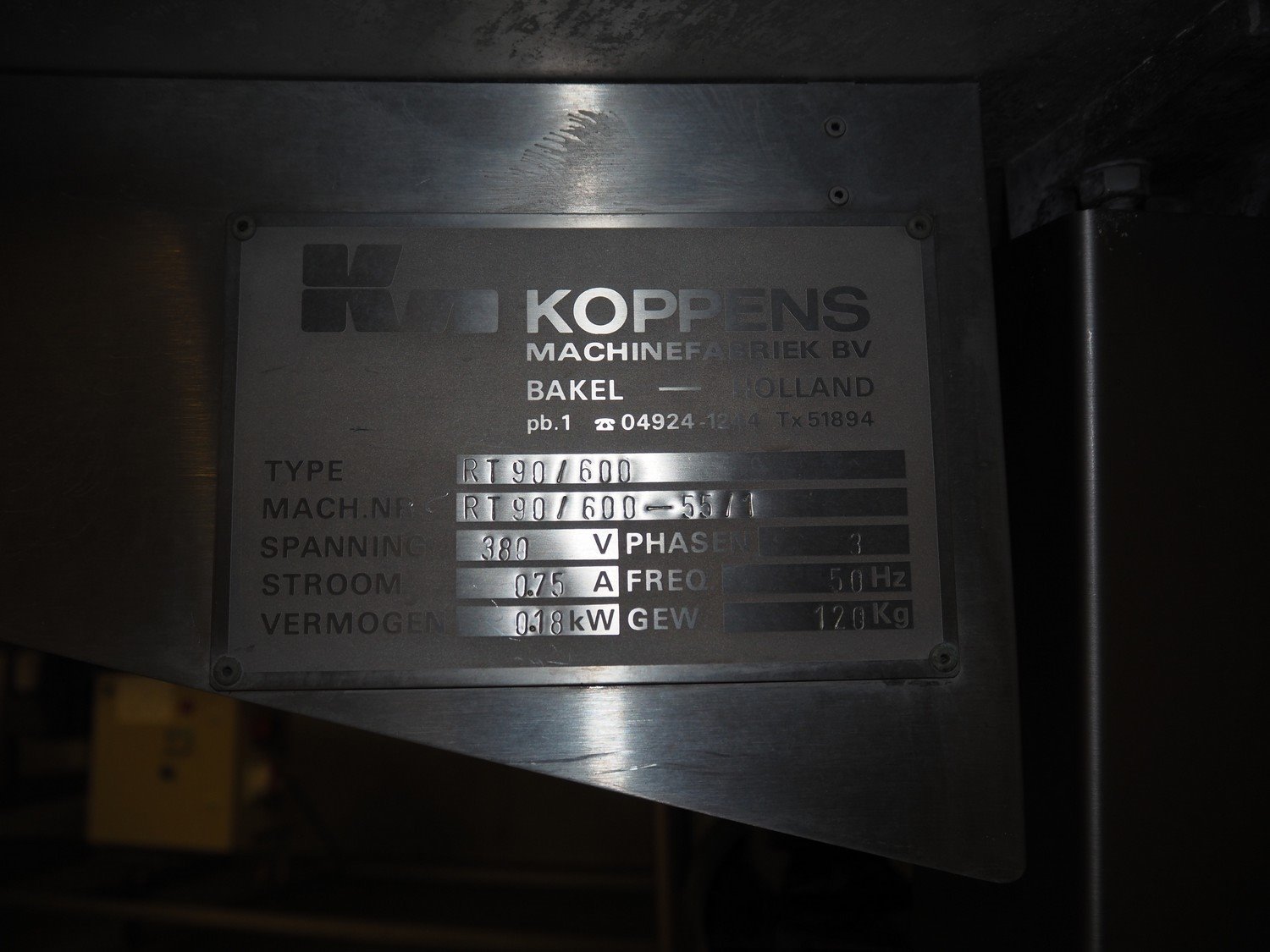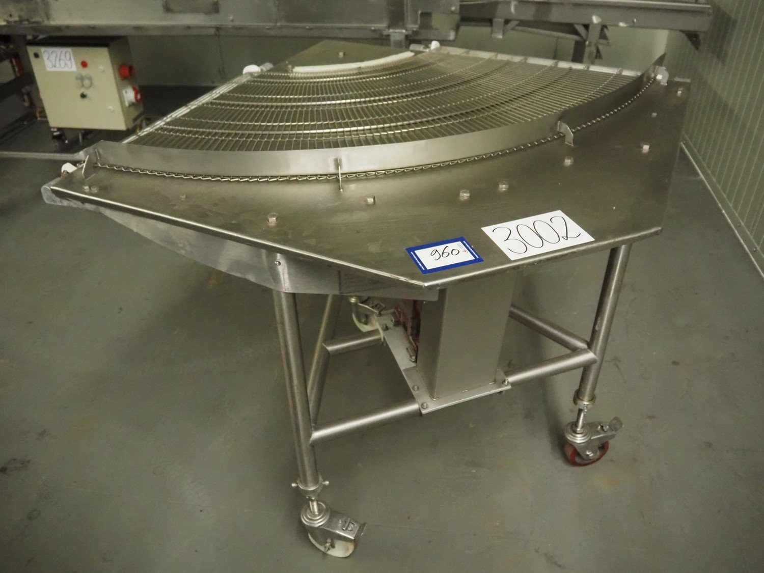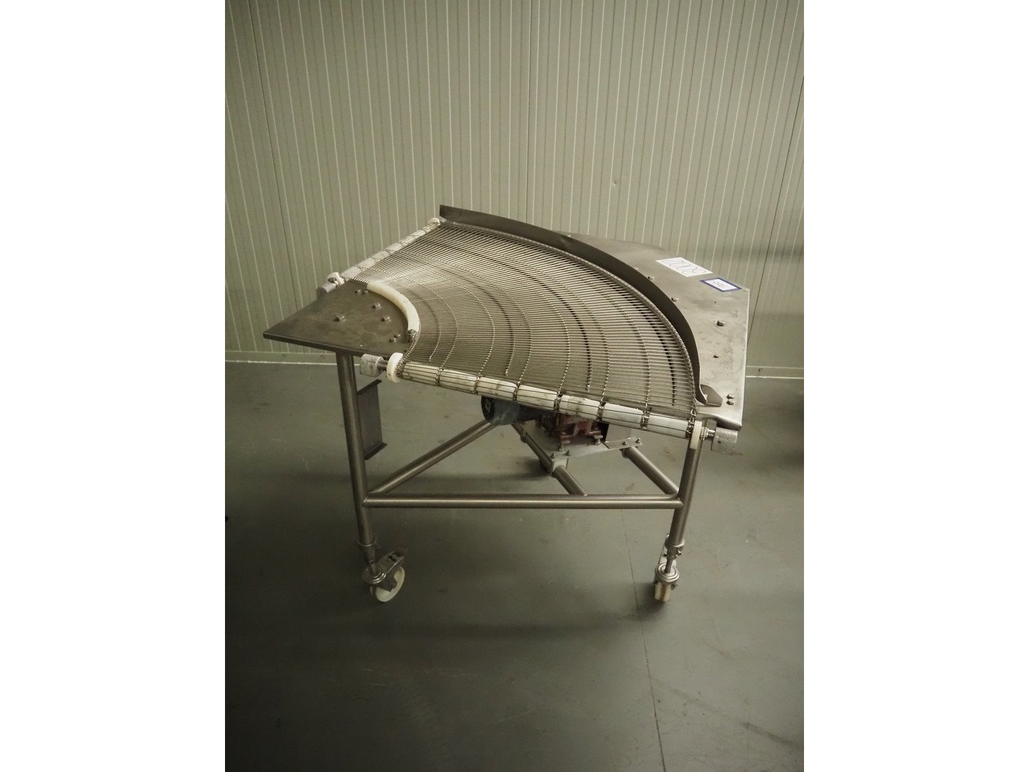 Koppens mobile curve conveyor with 90° curve, s/s frame, s/s mesh belt, type: RT 90/600, machine number: RT 90/600-55/1, 380 V, 3 Ph, 50 Hz, 0.75 A, 0.18 kW, weight: 120 kg, belt width: 600 mm, total dimensions: 1100 mm x 1100 mm x 1050 mm.