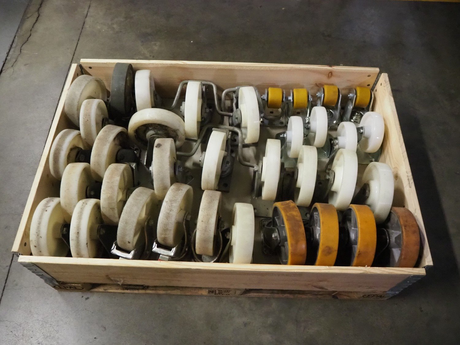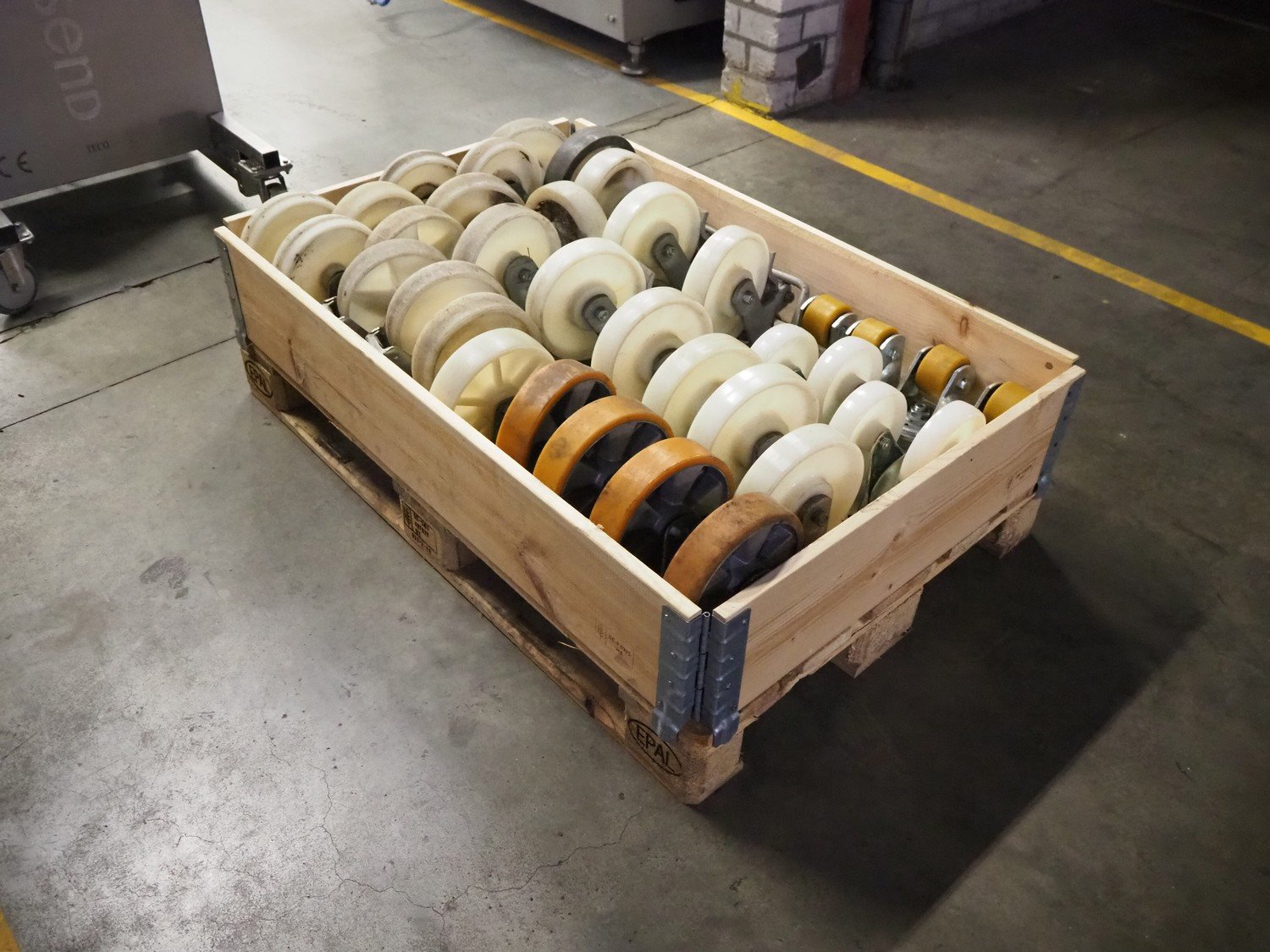 Pallet with various wheels, diameter wheels: 200 mm, dimensions pallet: 1200 mm x 800 mm x 400 mm.