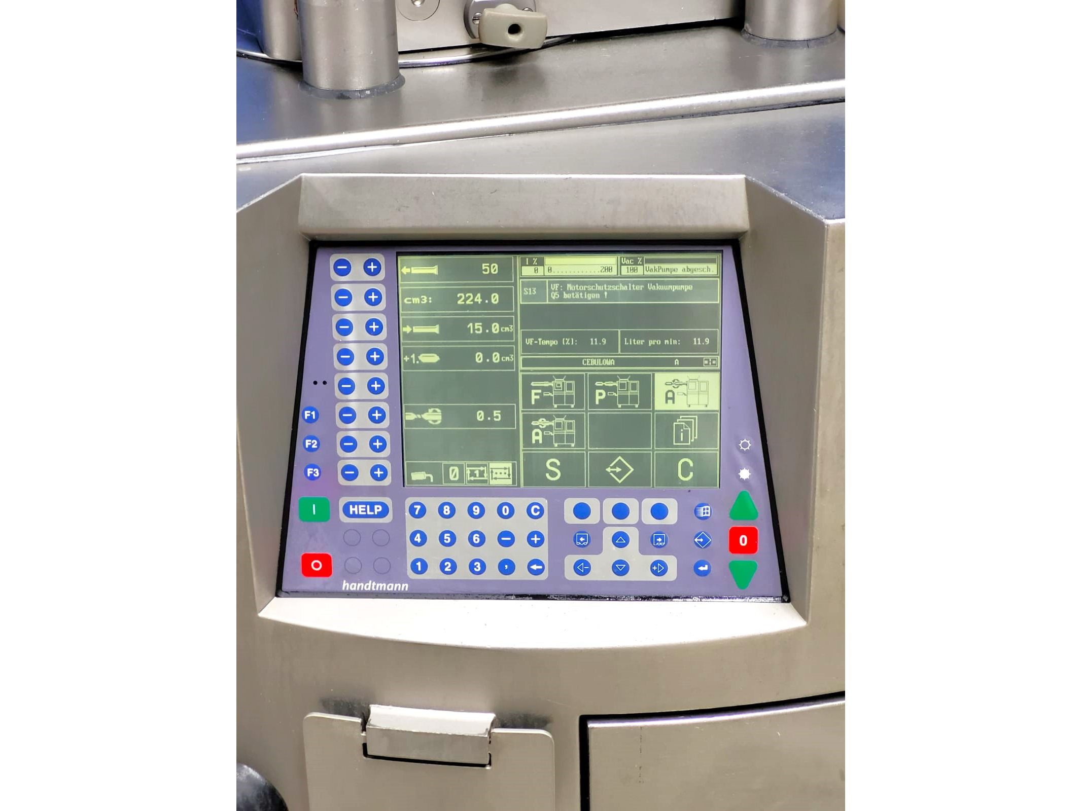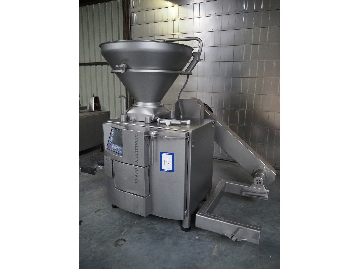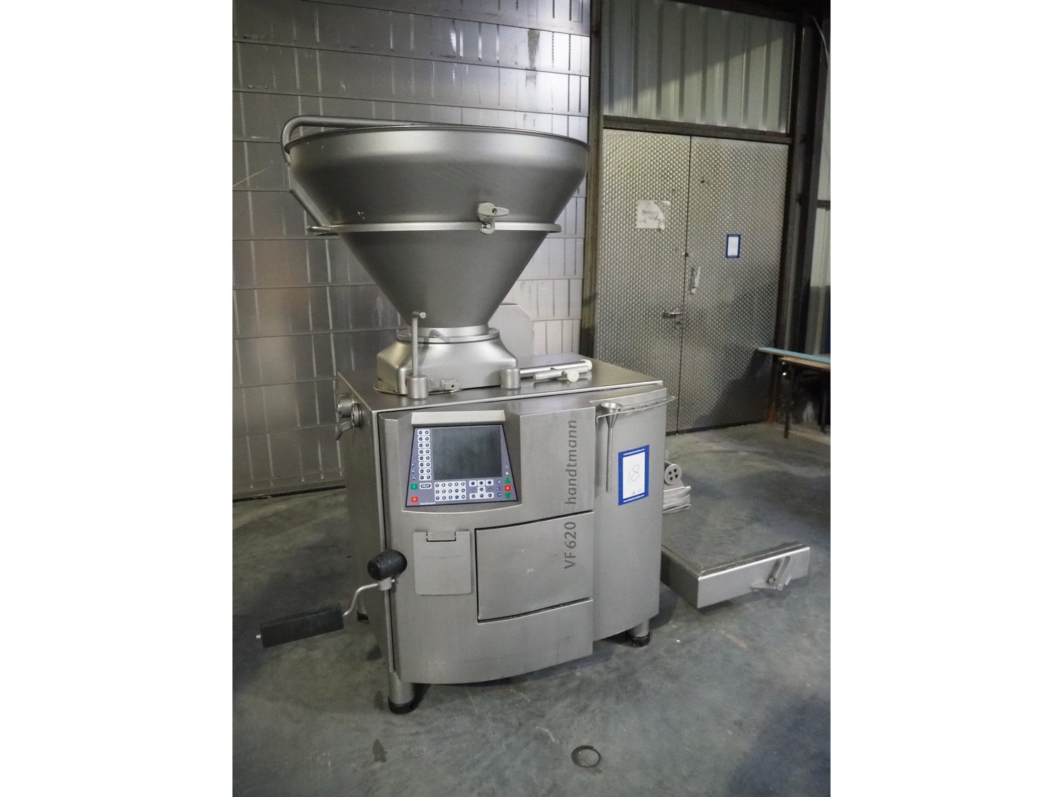 Handtmann vacuum filling machine with lifter for 200 liter meat bins, type: VF620, number: 16095, year of construction: 2002, 400 V, 3 Ph, 50 Hz, 11.5 A, 8 kW, knee control, dimensions: 2200 mm x 1400 mm x 1900 mm.