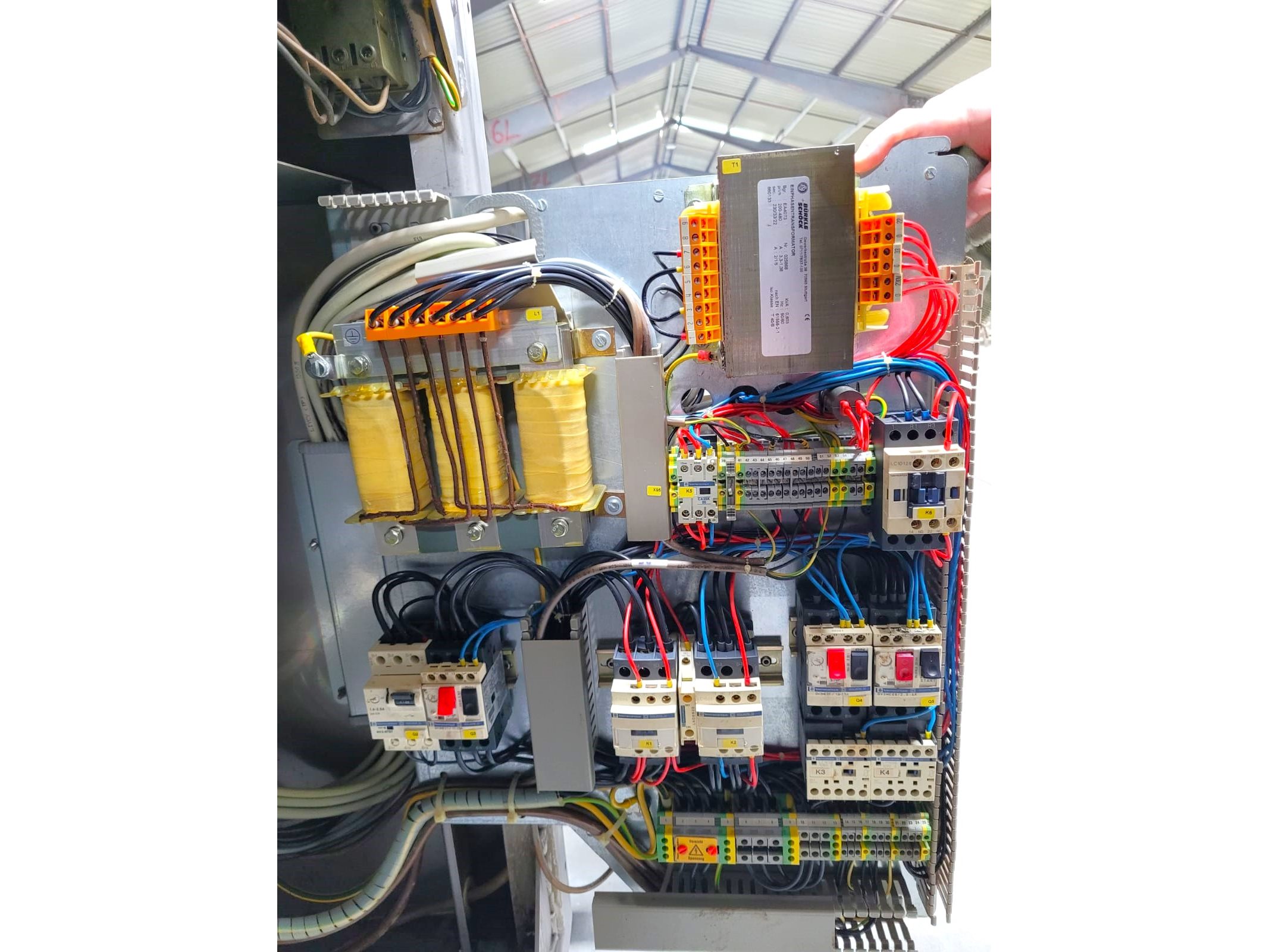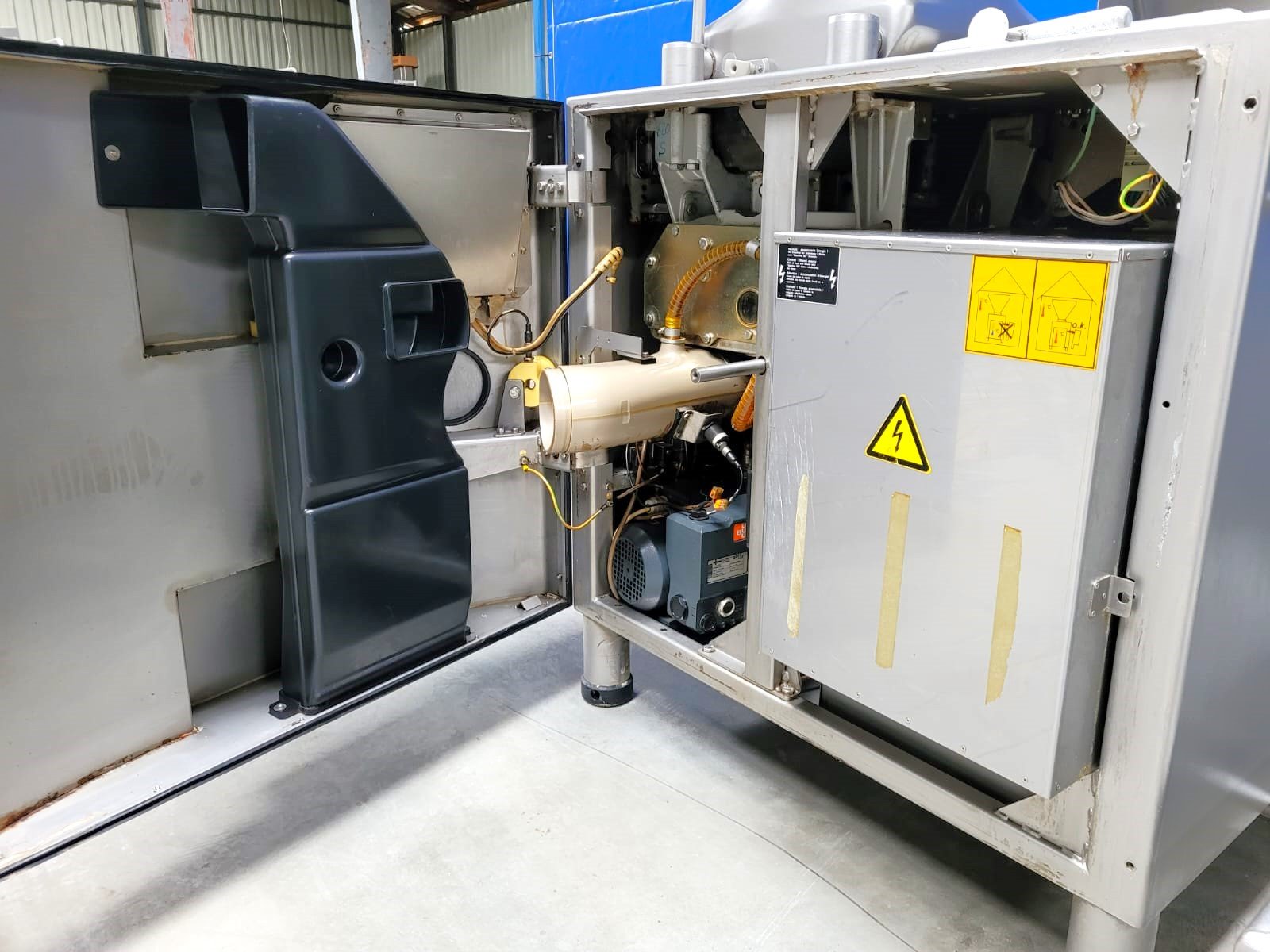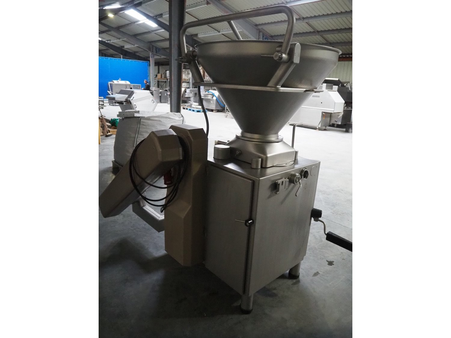 Handtmann vacuum filling machine with lifter for 200 liter meat bins, type: VF620, number: 16095, year of construction: 2002, 400 V, 3 Ph, 50 Hz, 11.5 A, 8 kW, knee control, dimensions: 2200 mm x 1400 mm x 1900 mm.
