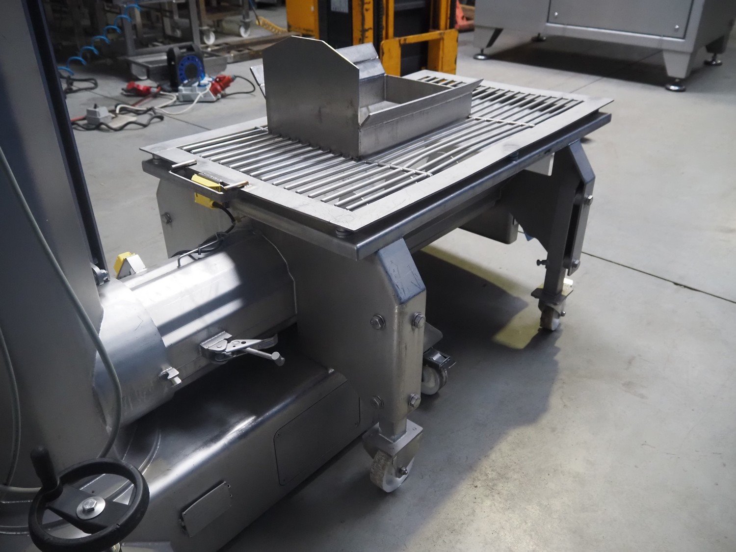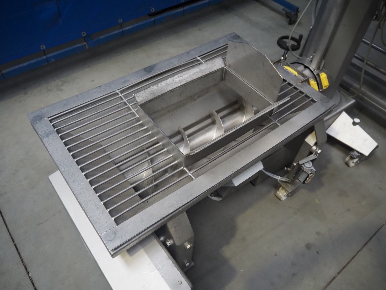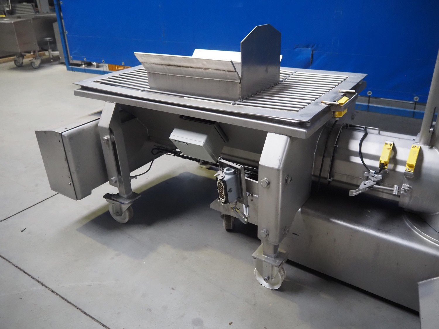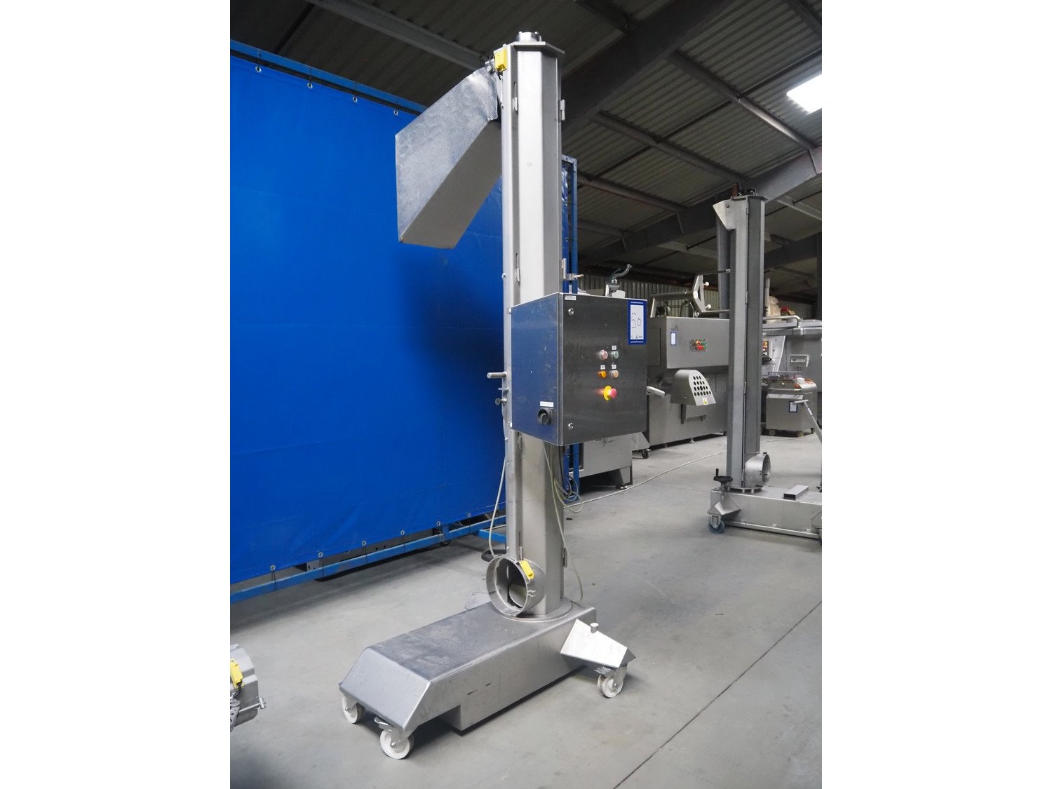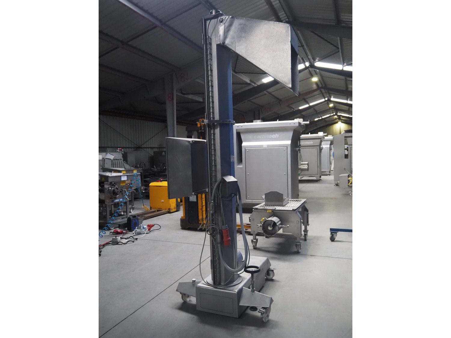 Carnitech s/s ribbon mixer, dimensions: 2300 mm x 1500 mm x 1200 mm, including Marel Carnitech mobile s/s giraf, model: B250, serial number: M10189, year of construction: 2016, 400 V 3 Ph, 50 Hz, 7.9 A, screw dimensions: 240 mm, tier: 180 mm, elevating height: 2500 mm, total dimensions: 2000 mm x 1000 mm x 3000 mm and s/s trolley, dimensions: 1350 mm x 450 mm x 970 mm.